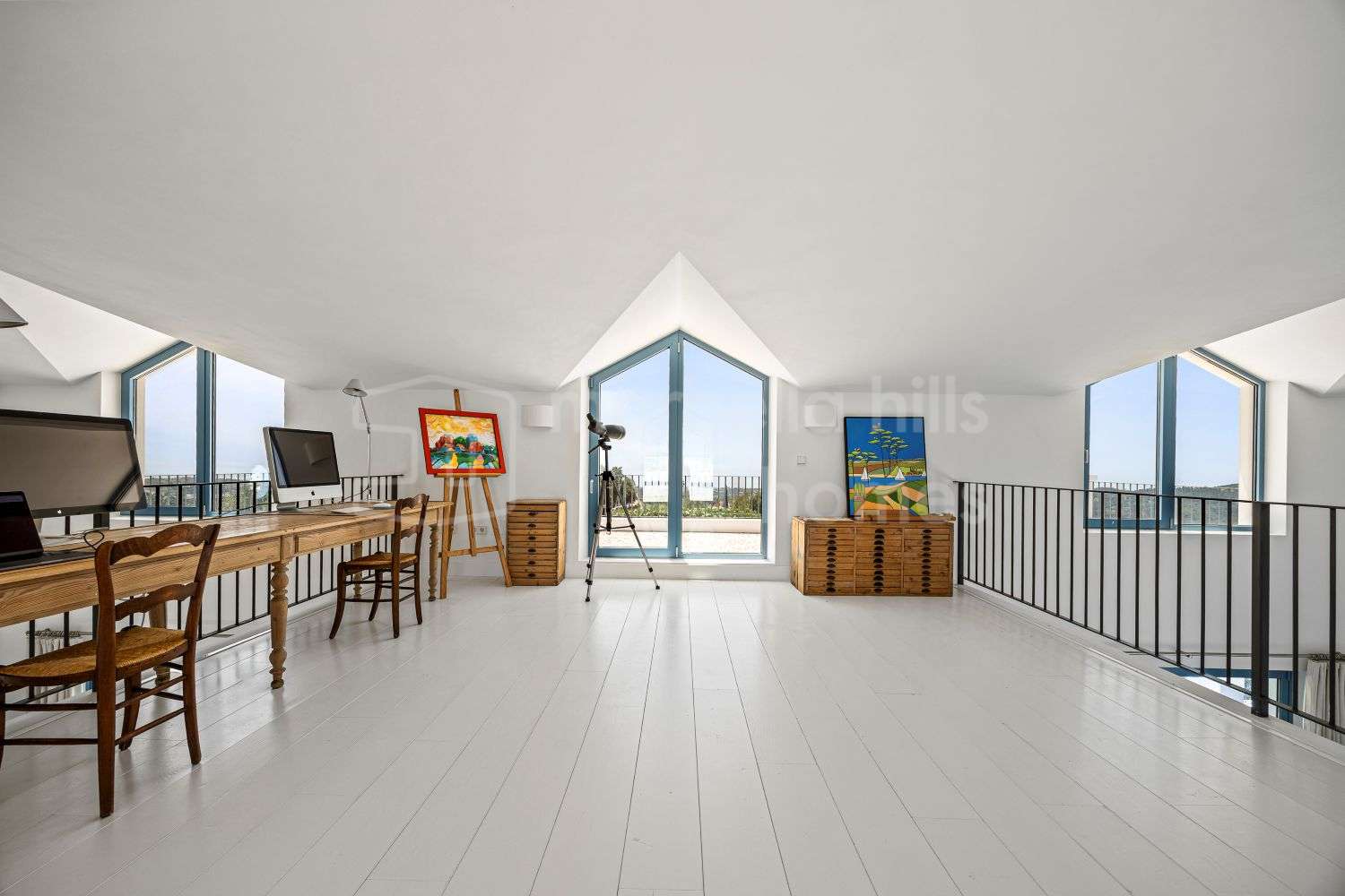 Hauptgeschoss: Wohnzimmer mit hohen Decken und Kamin, separates Esszimmer und offene voll ausgestattete Küche. Mezzanine für Büro oder TV-Bereich. Hauptschlafzimmer en suite mit Ankleide, zwei Gästezimmer en suite. Kleines Schlafzimmer neben der Küche.