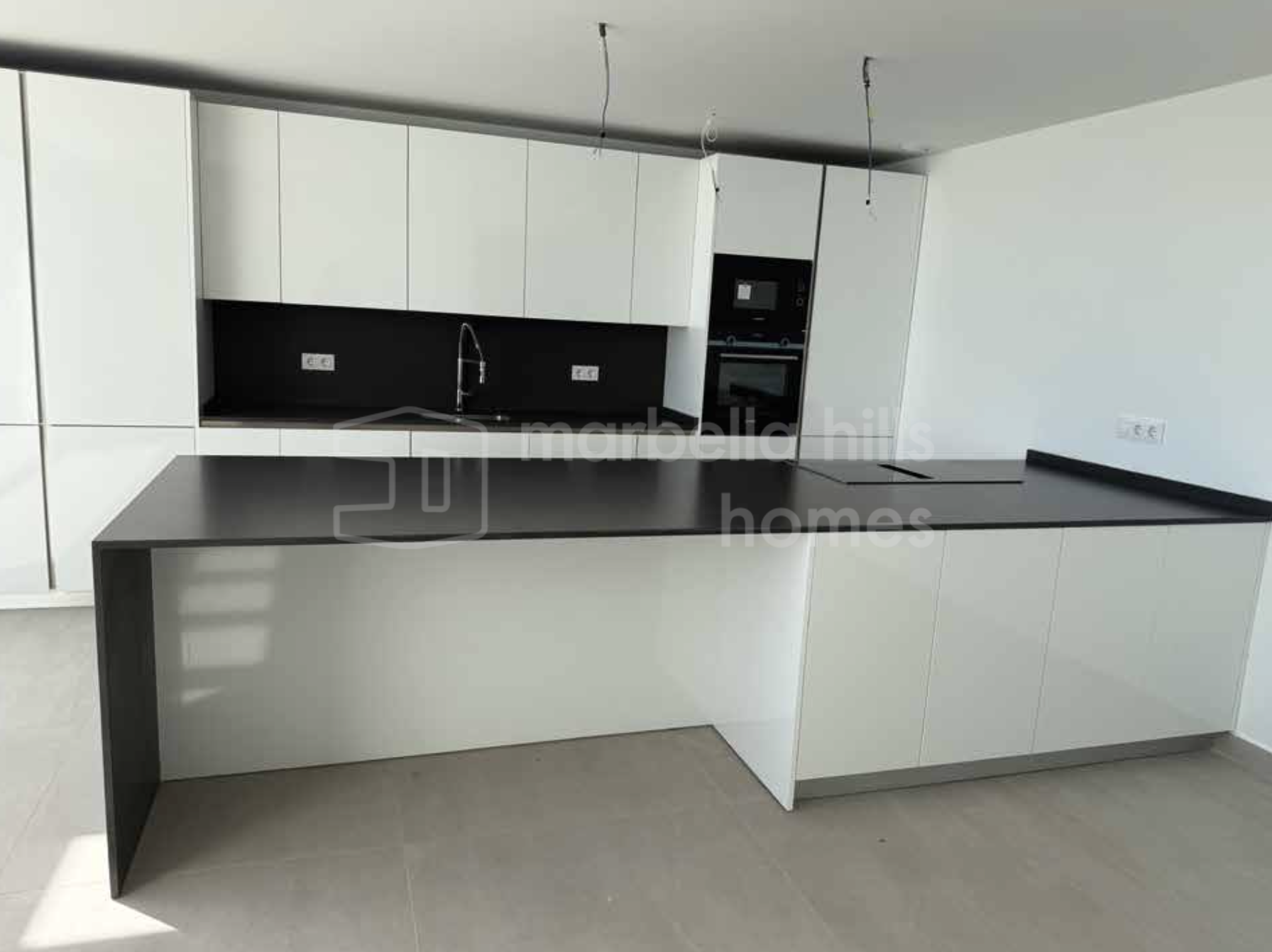 Die deutsche Designerküche vereint Stil und Funktionalität. Sie ist mit sanft schließenden Schränken, weißen Lackfronten und hochwertigen Einbaugeräten ausgestattet, darunter ein Induktionskochfeld mit integriertem Dunstabzug, Multifunktionsofen, Mikrowelle, Geschirrspüler und Kühl-Gefrier-Kombination.