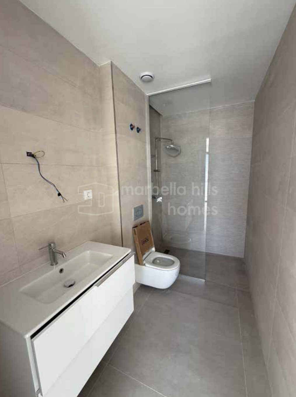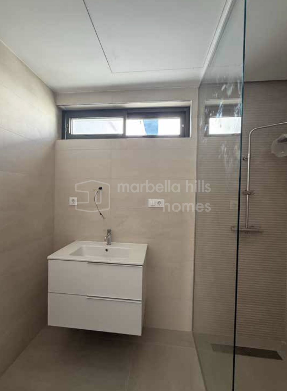 Die Badezimmer sind modern und elegant gestaltet und mit hochwertigen Materialien ausgestattet: thermostatische Duschsäulen, verchromte Armaturen und freihängende Waschtische. Arbeitsplatten von Porcelanosa verleihen jedem Detail eine Note von Raffinesse und Langlebigkeit.