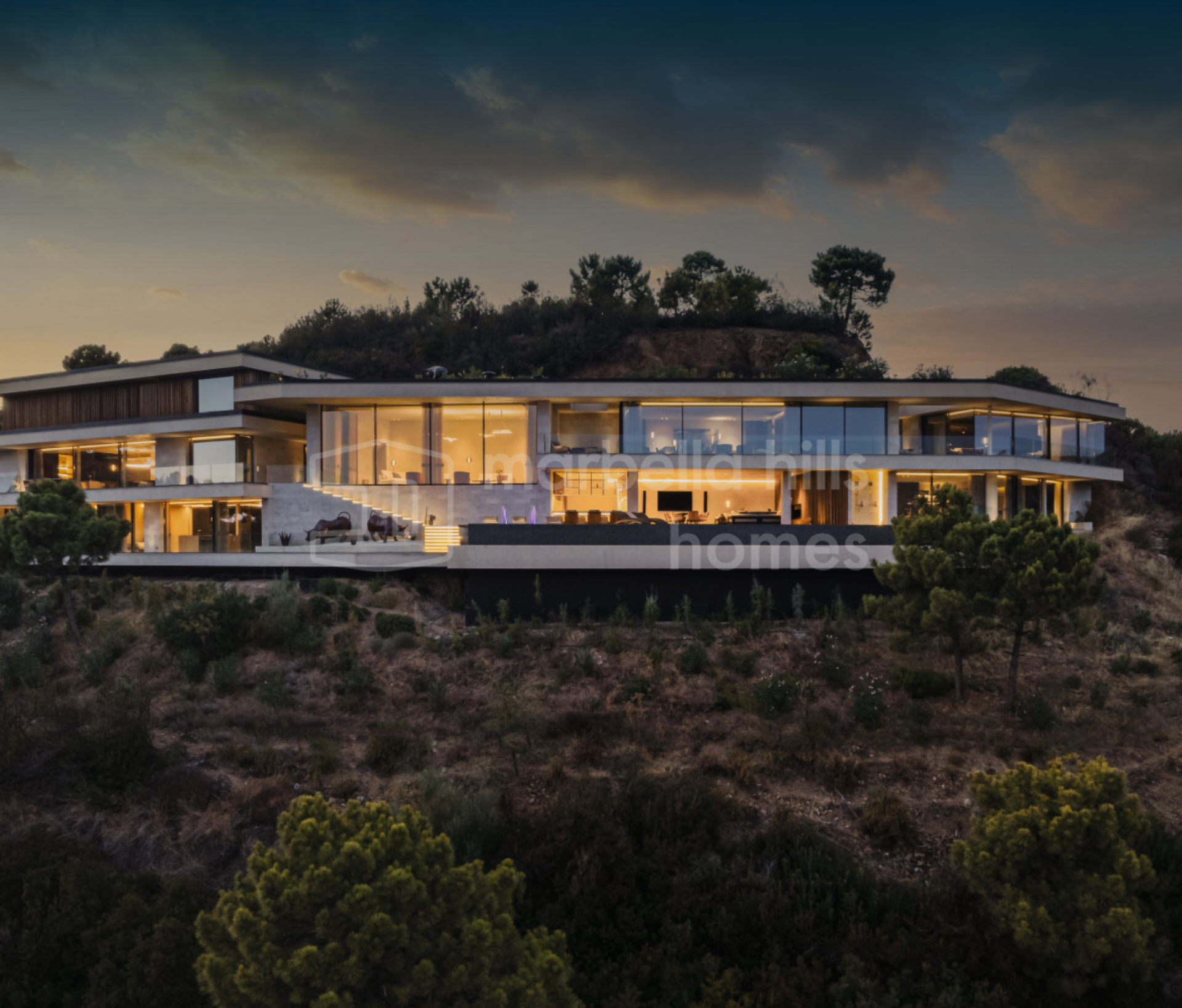 Das spektakuläre Haus von 1100 m² mit 500 m² Terrassen liegt auf einem großen Grundstück von 5.127 m² mit einem einheimischen Garten, der Trockenheit verträgt. Es ist einzigartig, entworfen und gebaut für Komfort, Genuss und Wohlbefinden. Das Gebäude ist vollständig in die Berge integriert und individuell auf das Grundstück, die Ausrichtung und die Aussicht abgestimmt. Die Natur bietet einen idyllischen Rahmen für diese Luxusimmobilie, die nur einen begrenzten Einfluss auf die natürliche Umwelt hat und einen absoluten Qualitätsstandard erfüllt, der sich an den Prinzipien des nachhaltigen Designs orientiert. Es verfügt über ein Gründach, Sonnenkollektoren (50 m²) und energieeffiziente LED-Leuchten. Die übergroßen Panoramafenster in voller Deckenhöhe mit Schüco-Fensterrahmen ermöglichen einen unvergesslichen 180-Grad-Panoramablick auf das Meer und die Berge.