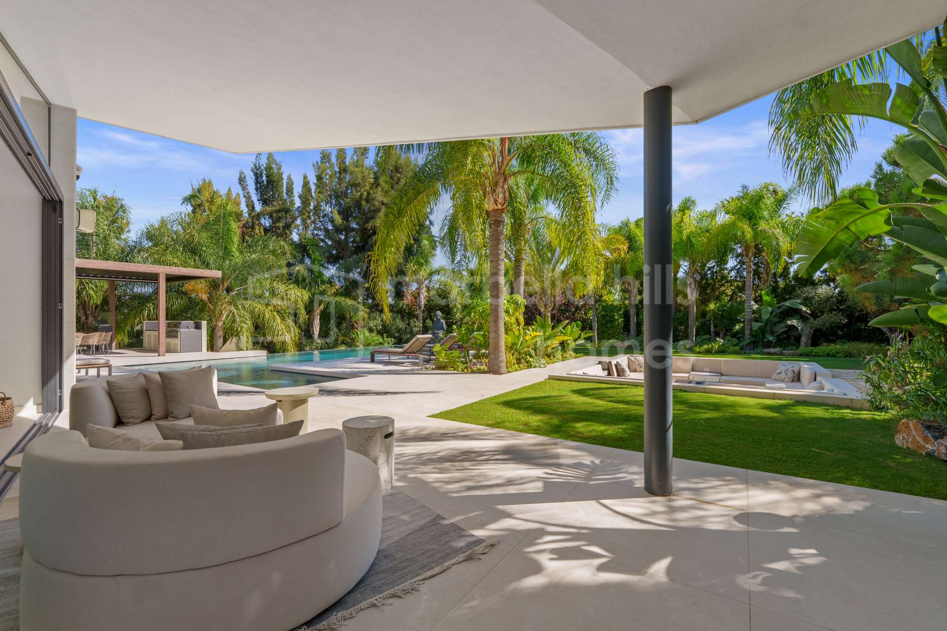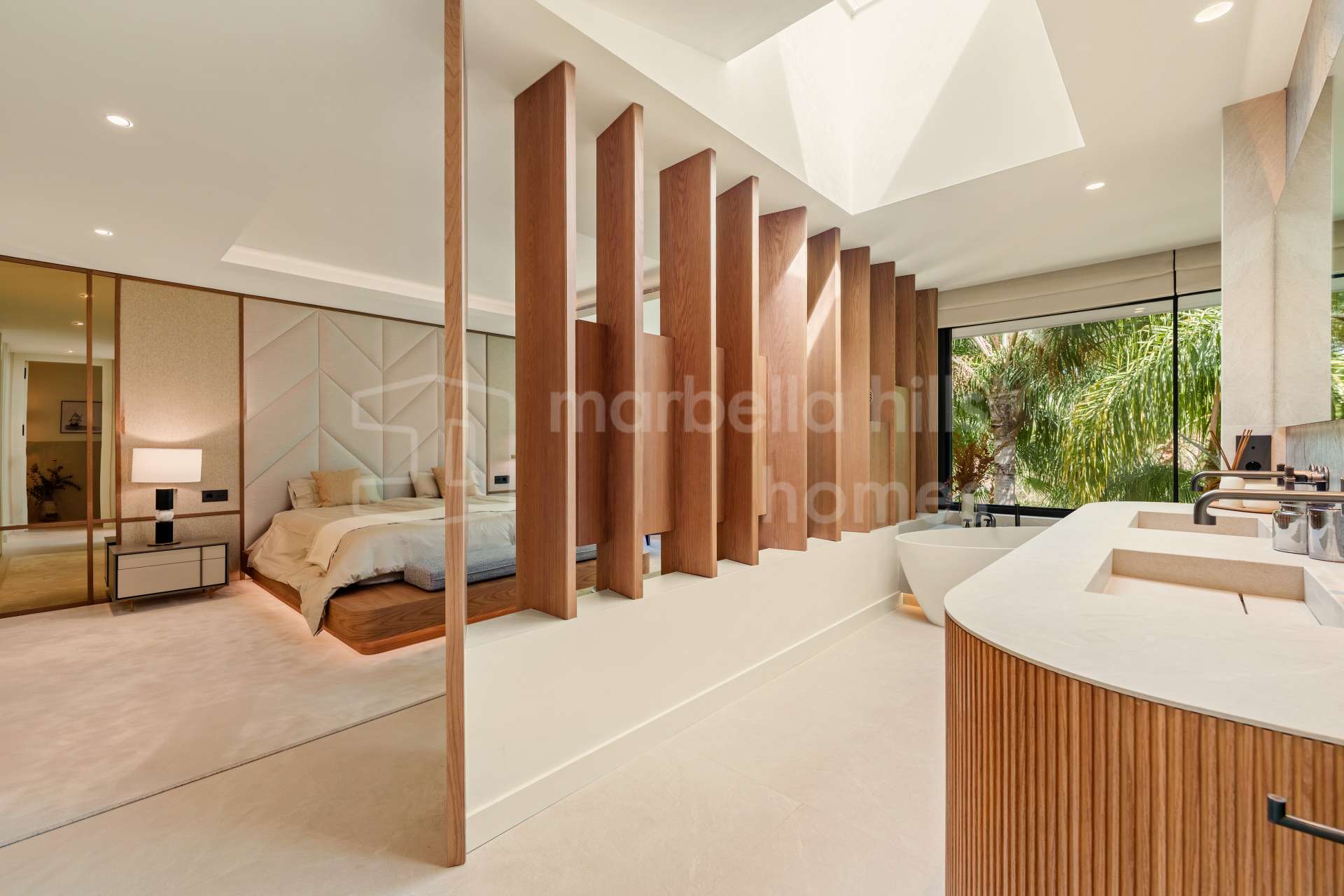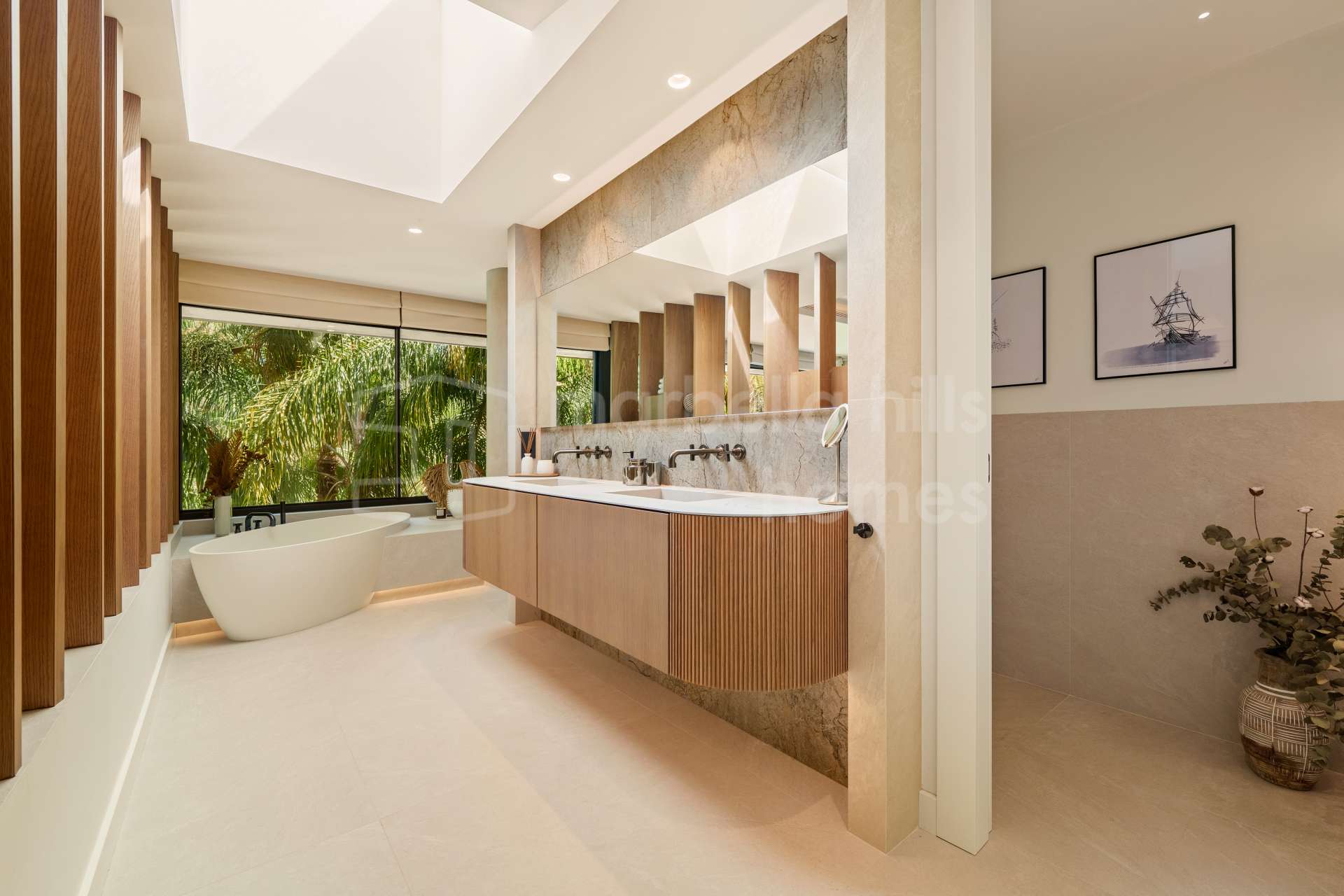 Elegante Fünf-Schlafzimmer-Villa in der exklusiven, gesicherten Wohnanlage Hacienda Las Chapas, dem begehrtesten Villenviertel im Osten Marbellas. Diese kürzlich renovierte Residenz vereint moderne Raffinesse mit mediterranem Charme und bietet ein außergewöhnliches Wohnerlebnis.