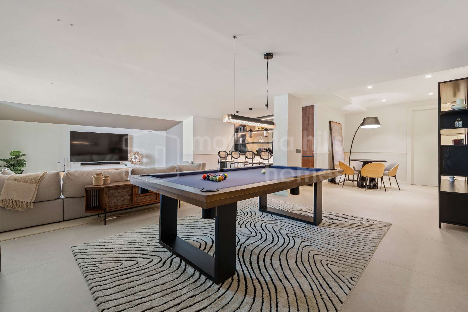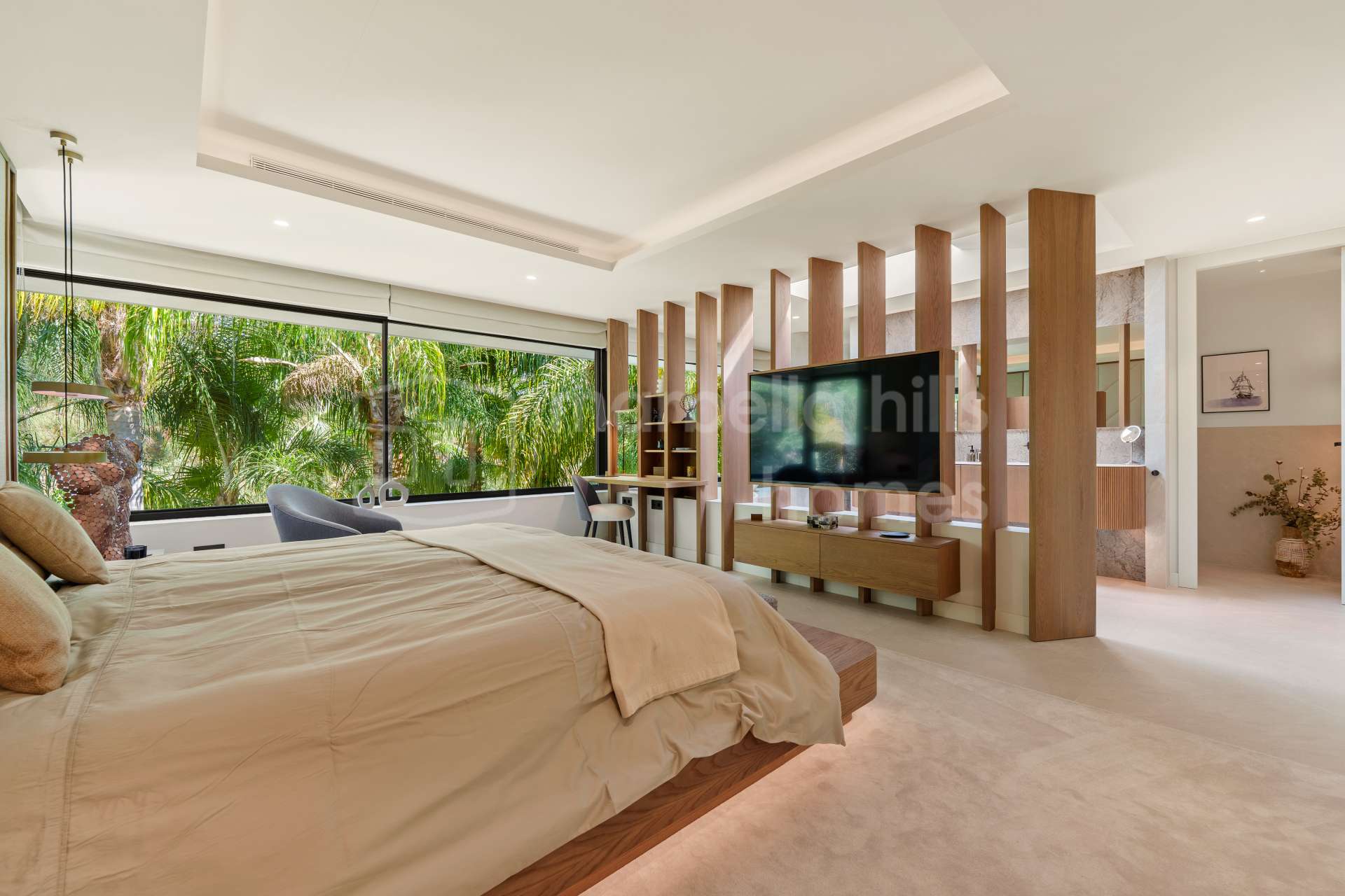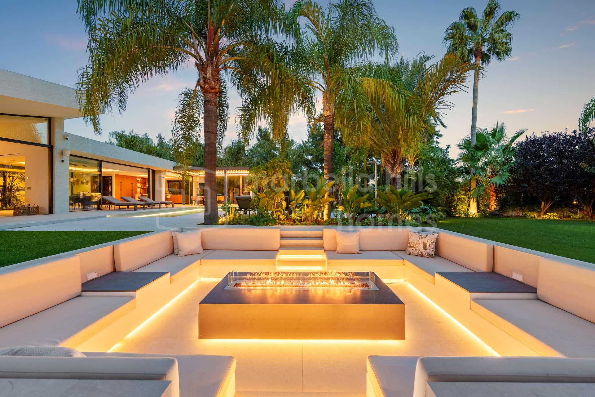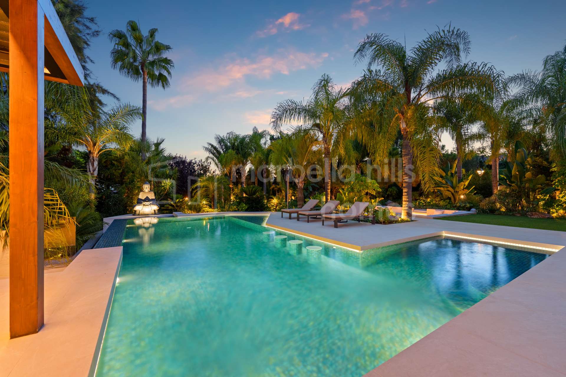 Elegante Fünf-Schlafzimmer-Villa in der exklusiven, gesicherten Wohnanlage Hacienda Las Chapas, dem begehrtesten Villenviertel im Osten Marbellas. Diese kürzlich renovierte Residenz vereint moderne Raffinesse mit mediterranem Charme und bietet ein außergewöhnliches Wohnerlebnis.