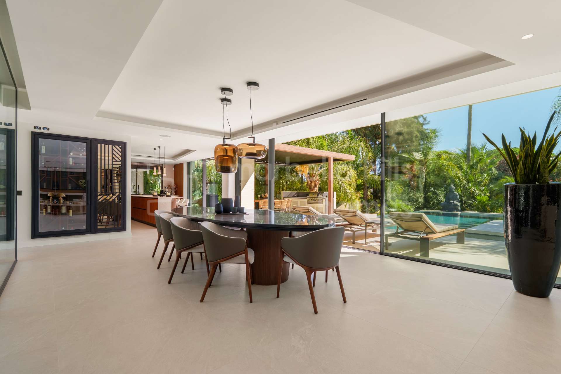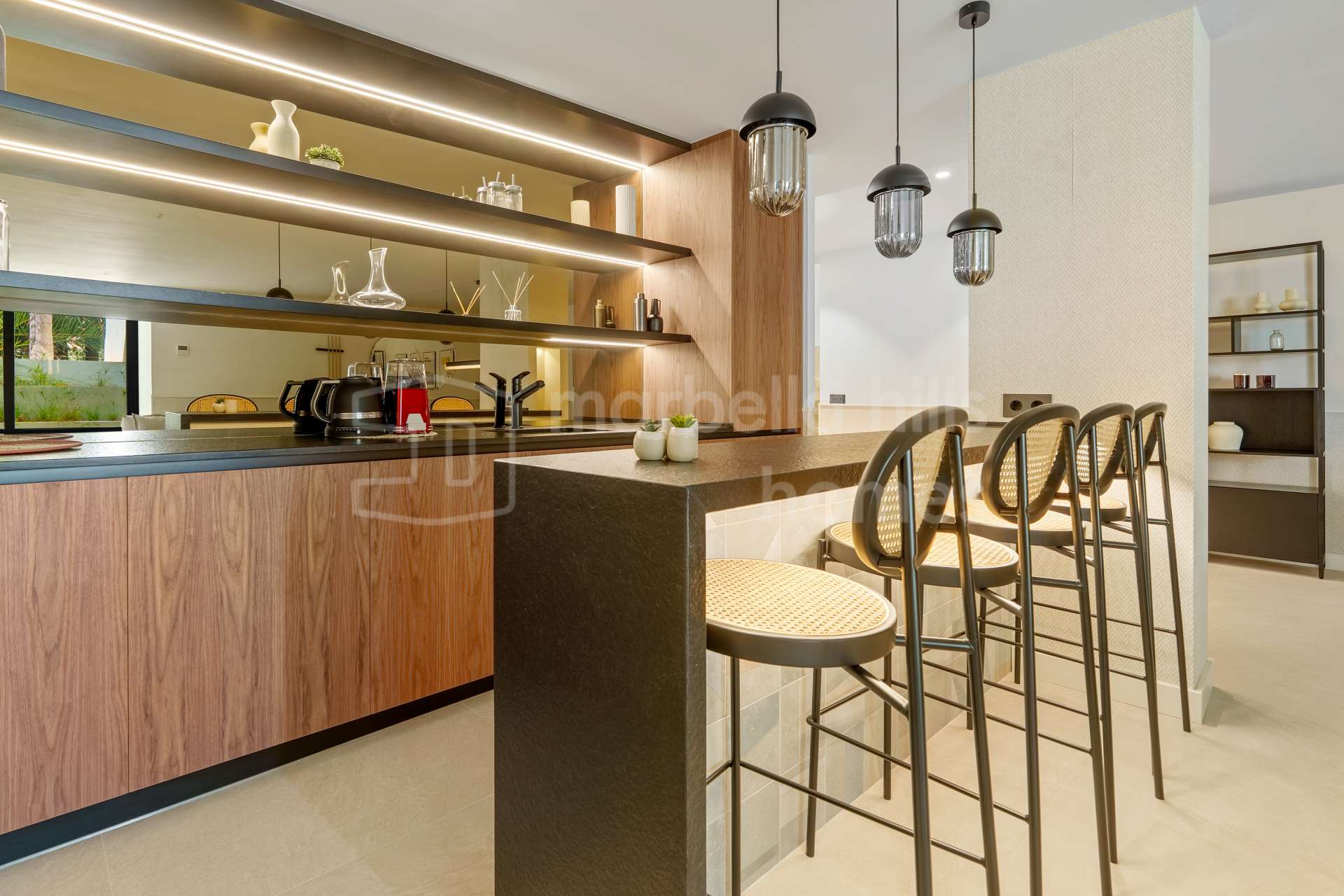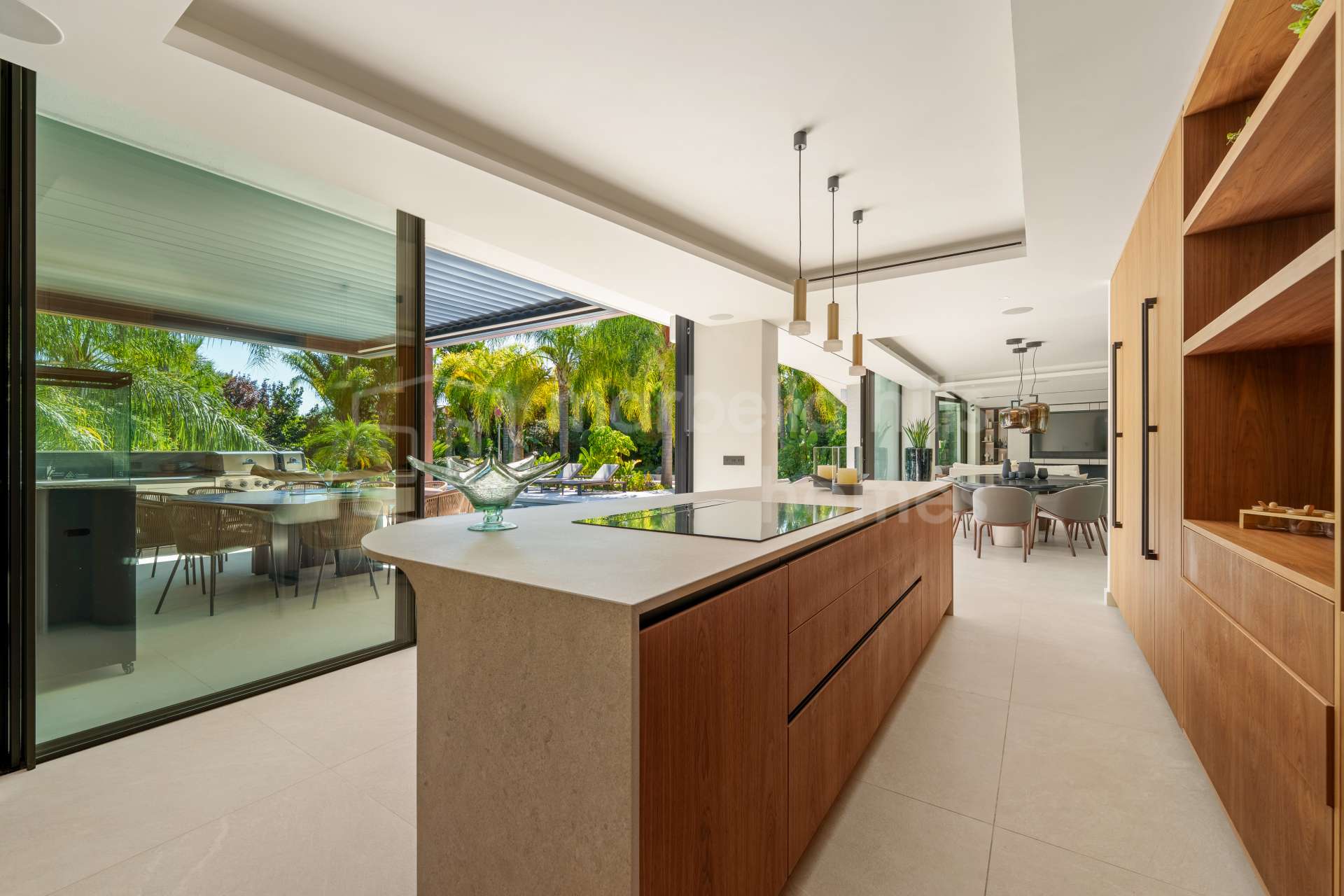 Auf einem wunderschön angelegten Grundstück von 1.562 m² mit über 50 majestätischen Palmen erstreckt sich die Villa über 717 m² und wurde für höchsten Komfort und Stil entworfen. Die offene Küche fügt sich harmonisch in die großzügigen Wohn- und Essbereiche ein und ist mit modernsten Geräten sowie eleganten, zeitgemäßen Oberflächen ausgestattet – ein idealer Raum für geselliges Beisammensein und den täglichen Komfort.