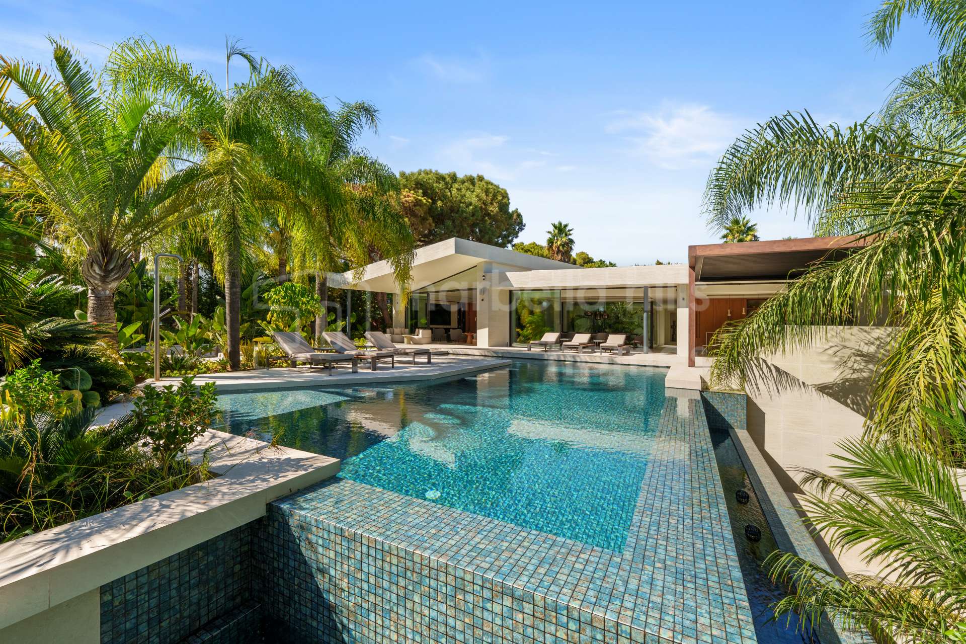 Bodentiefe Fenster durchfluten das Innere mit Tageslicht und öffnen sich zu weitläufigen Außenterrassen. Eine bioklimatische, elektrische Pergola spendet Schatten und verleiht der Architektur einen stilvollen Akzent. Die beheizte Poolanlage, die im Winter bis zu 35 °C erreicht, bietet eine entspannende Oase, eingebettet in üppiges Grün für absolute Privatsphäre.