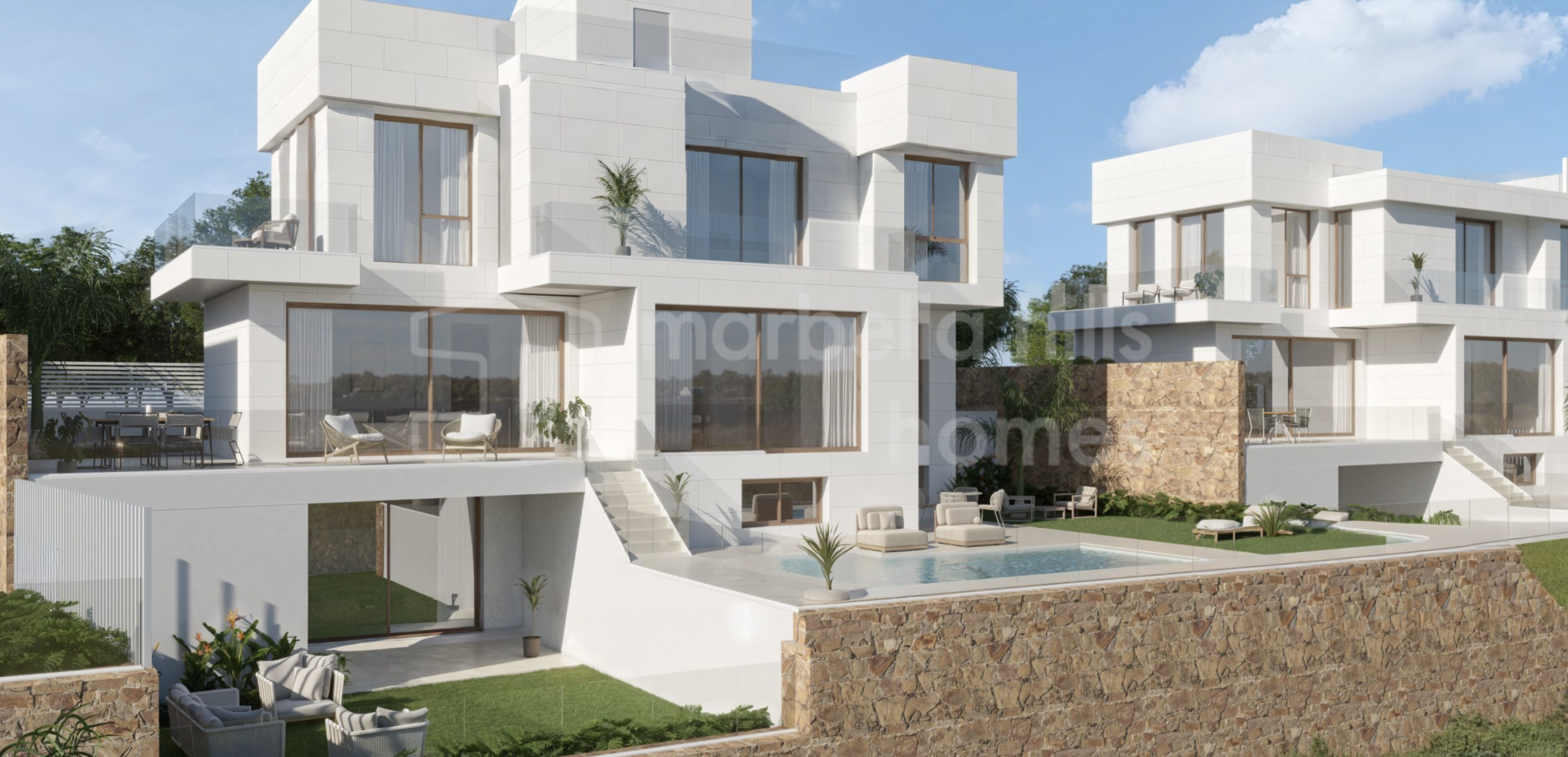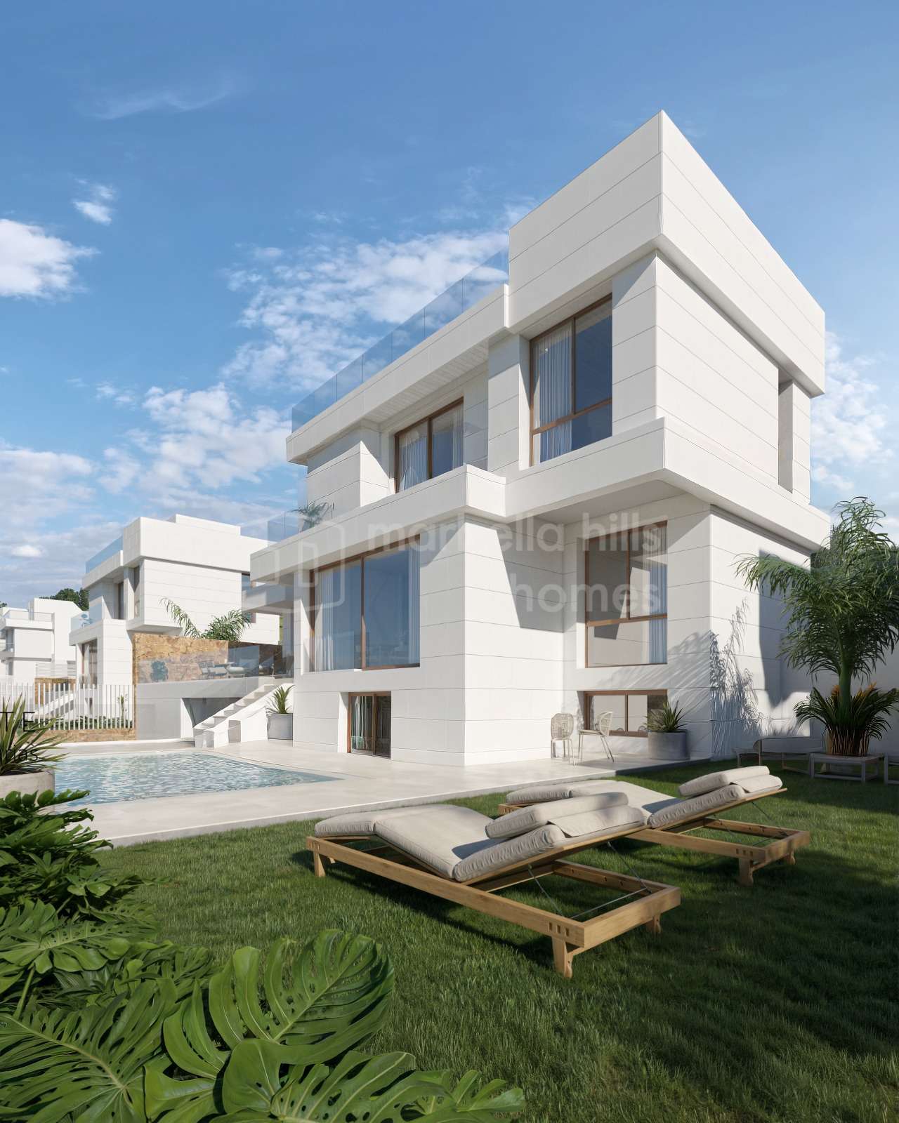 Exklusive Neubau-Luxusvillen in Estepona Golf. Modernes Design, private Gärten und Pools, Meer- und Bergblick, nahe Marbella und Puerto Banús.