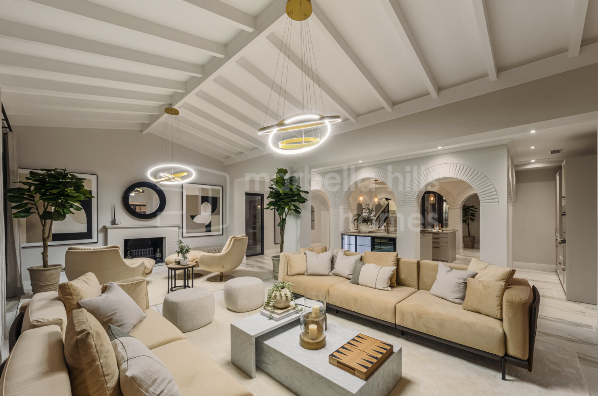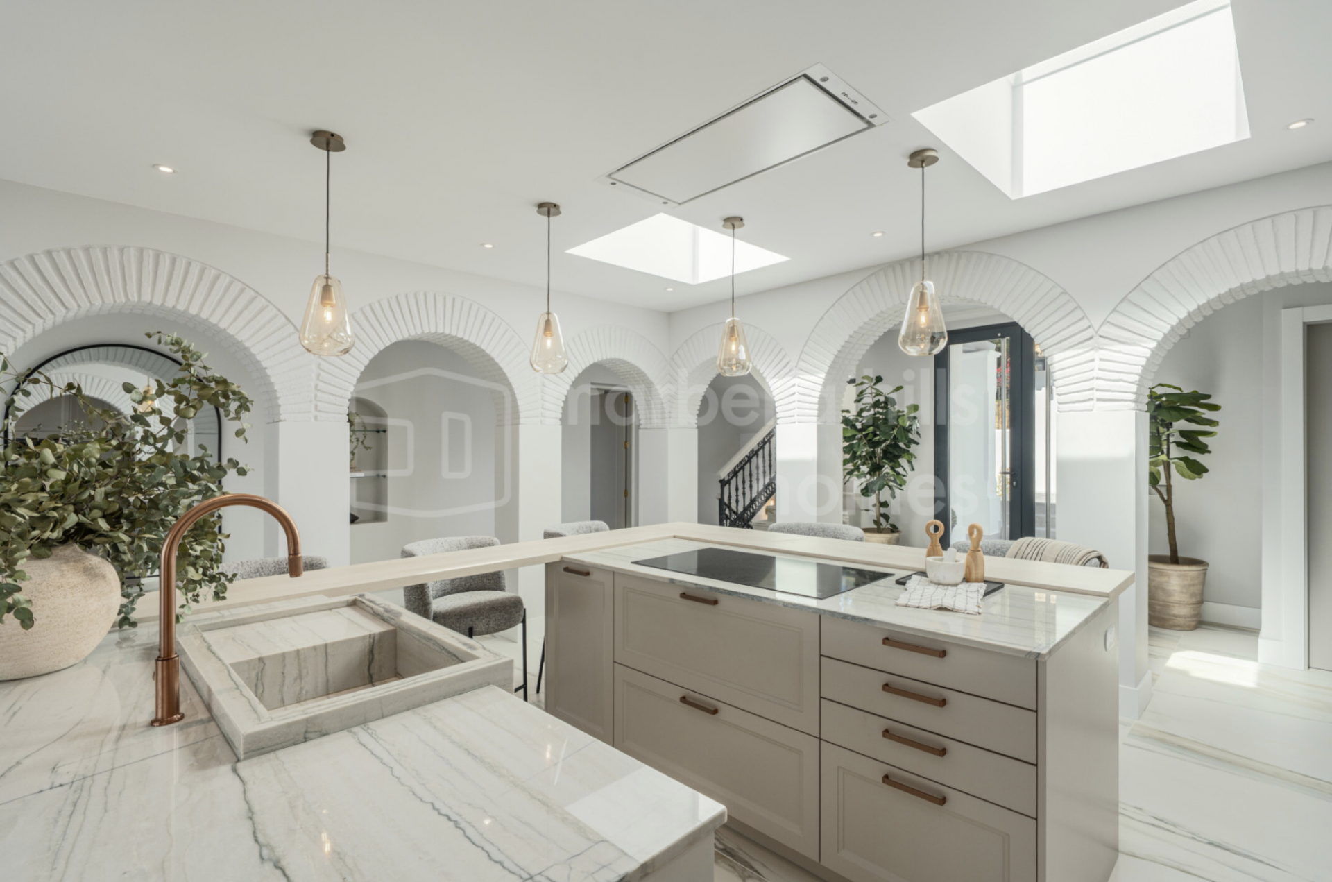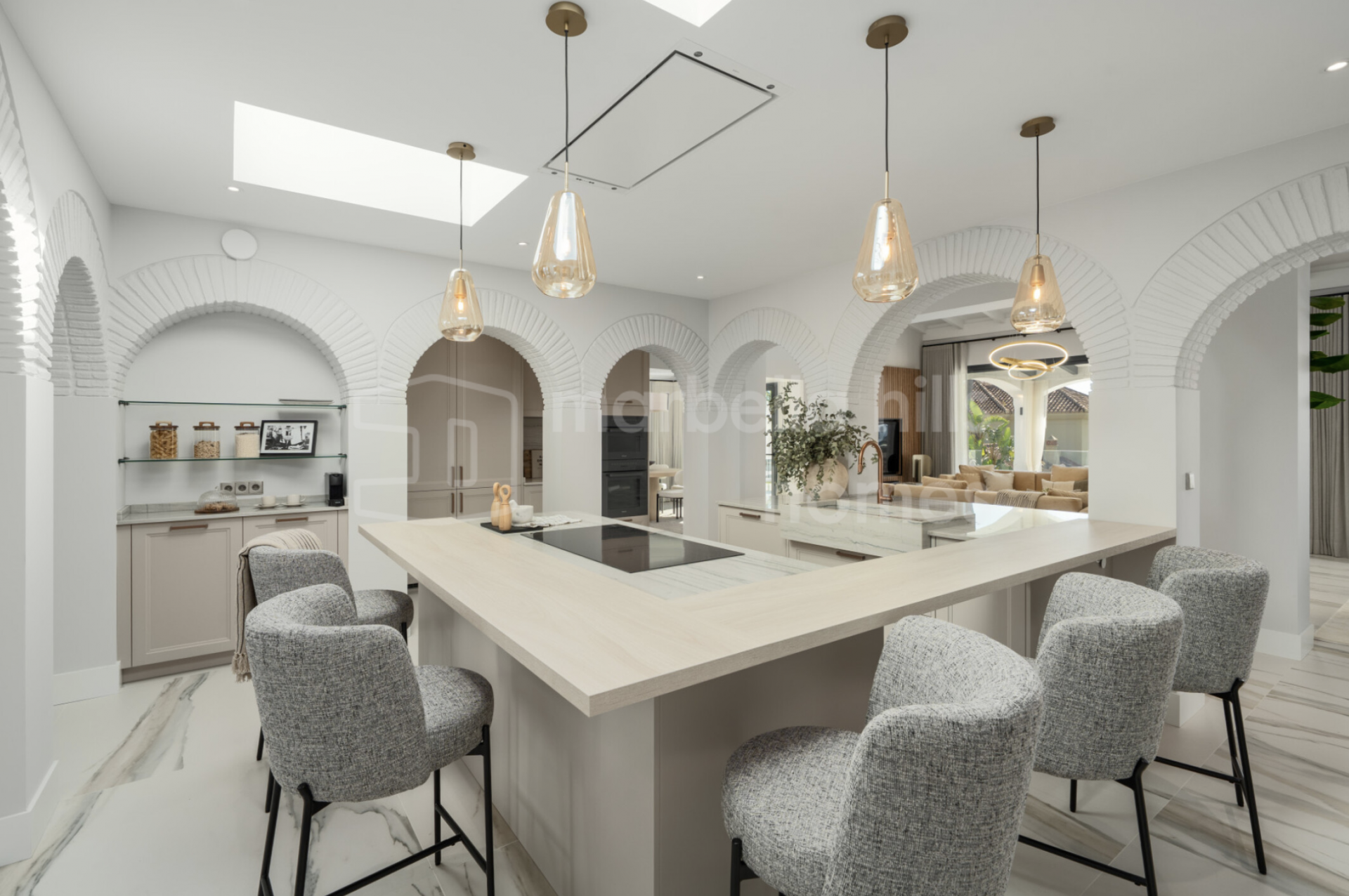 Die weitläufigen Terrassen sind ideal für gesellige Zusammenkünfte im Freien konzipiert und sorgen dafür, dass jedes Treffen von der malerischen Umgebung dieses erstklassigen Standorts profitiert. Die Innenräume zeichnen sich durch tadellose Handwerkskunst und raffinierten Stil aus, mit einer beruhigenden neutralen Farbpalette, die sofort ein Gefühl von Ruhe und Eleganz vermittelt. Authentische mediterrane Elemente wie elegante Bögen verbinden offene Wohnbereiche, die durch hohe Decken mit weiß gestrichenen Holzbalken bereichert werden, welche den andalusischen Charme des Hauses hervorheben.