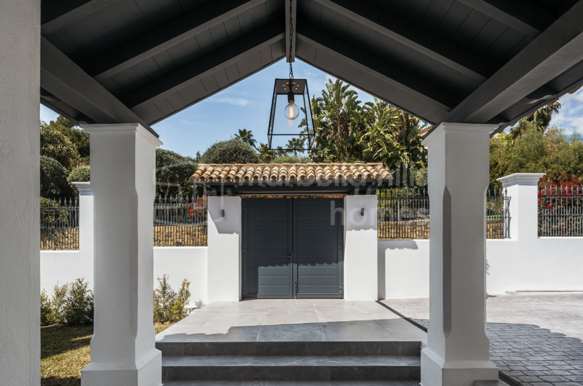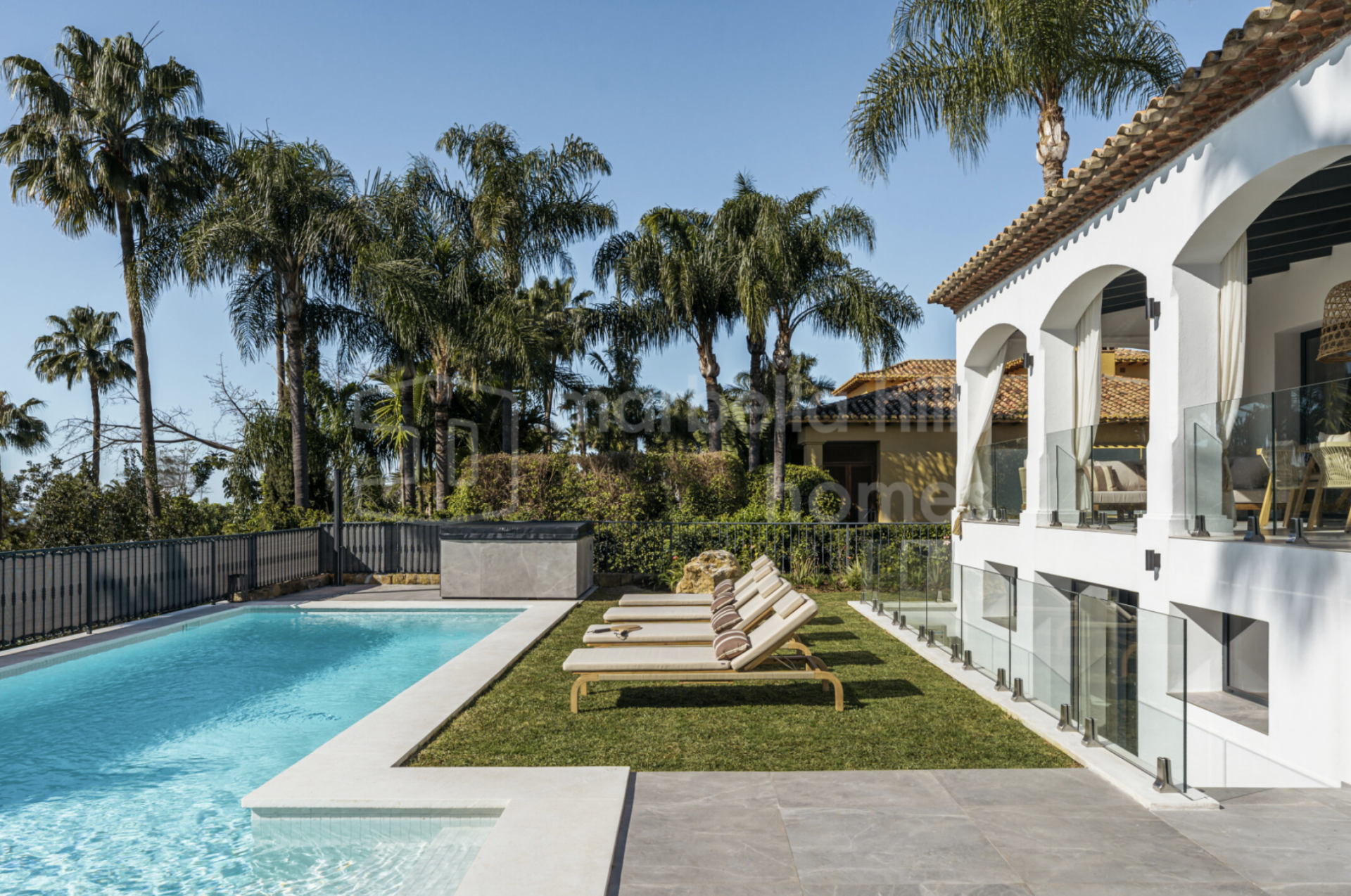 Entdecken Sie einen bezaubernden mediterranen Rückzugsort, der mühelos klassische Eleganz mit moderner Raffinesse verbindet. Auf einem großzügigen Grundstück von über 1.000 m² in der exklusiven bewachten Wohnanlage Altos Reales an Marbellas prestigeträchtiger Goldener Meile gelegen, bietet diese außergewöhnliche Immobilie unvergleichliche Privatsphäre und Ruhe. Die makellos gepflegten, üppigen Gärten bilden eine idyllische Kulisse mit privatem Pool und entspannendem Whirlpool im Freien – ein perfekter Rückzugsort für erholsame Tage und ruhige Abende.