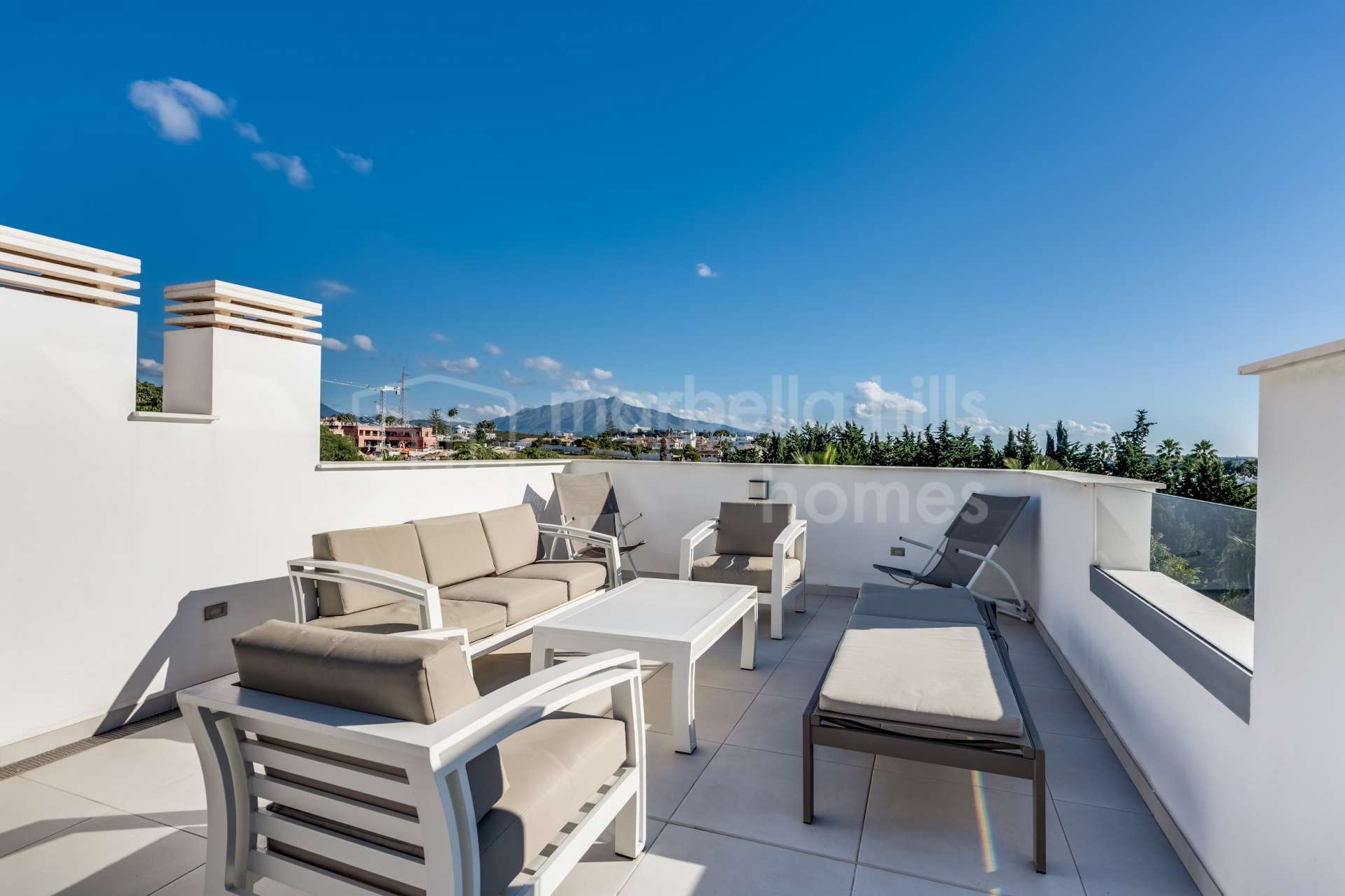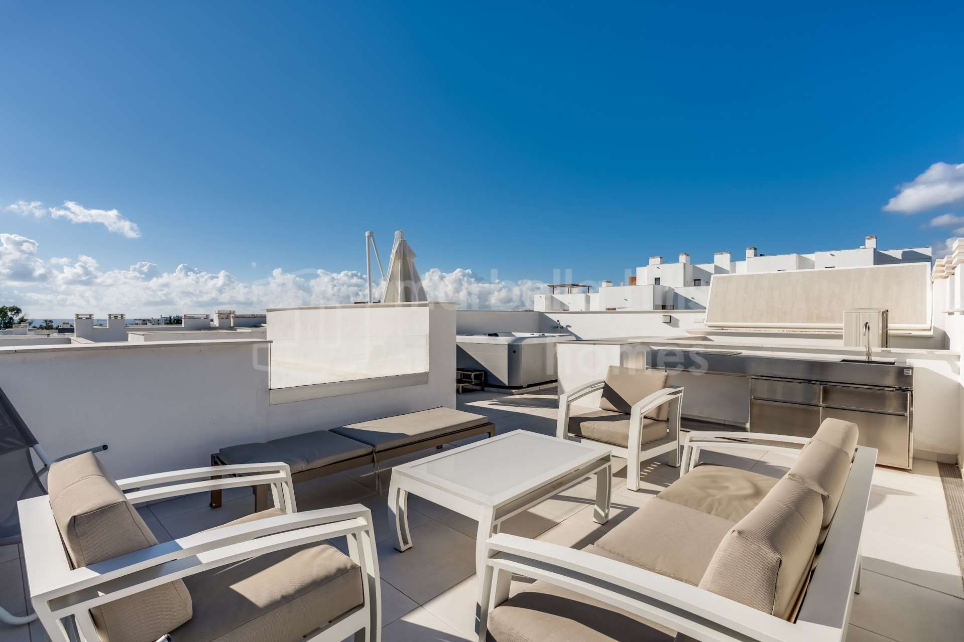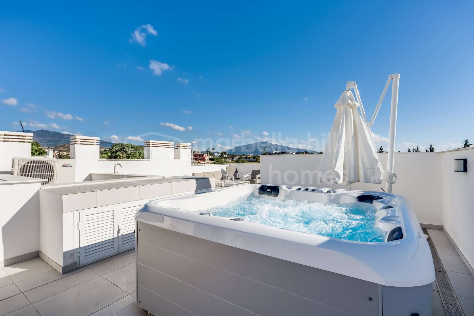 Ein Highlight der Immobilie sind die großzügigen Außenbereiche: Mehrere Terrassen bieten viel Sonne und Privatsphäre, inklusive einer privaten Dachterrasse mit Jacuzzi, integrierter Außenküche und BBQ – perfekt für Dinner unter freiem Himmel mit herrlichem Blick auf die Umgebung.