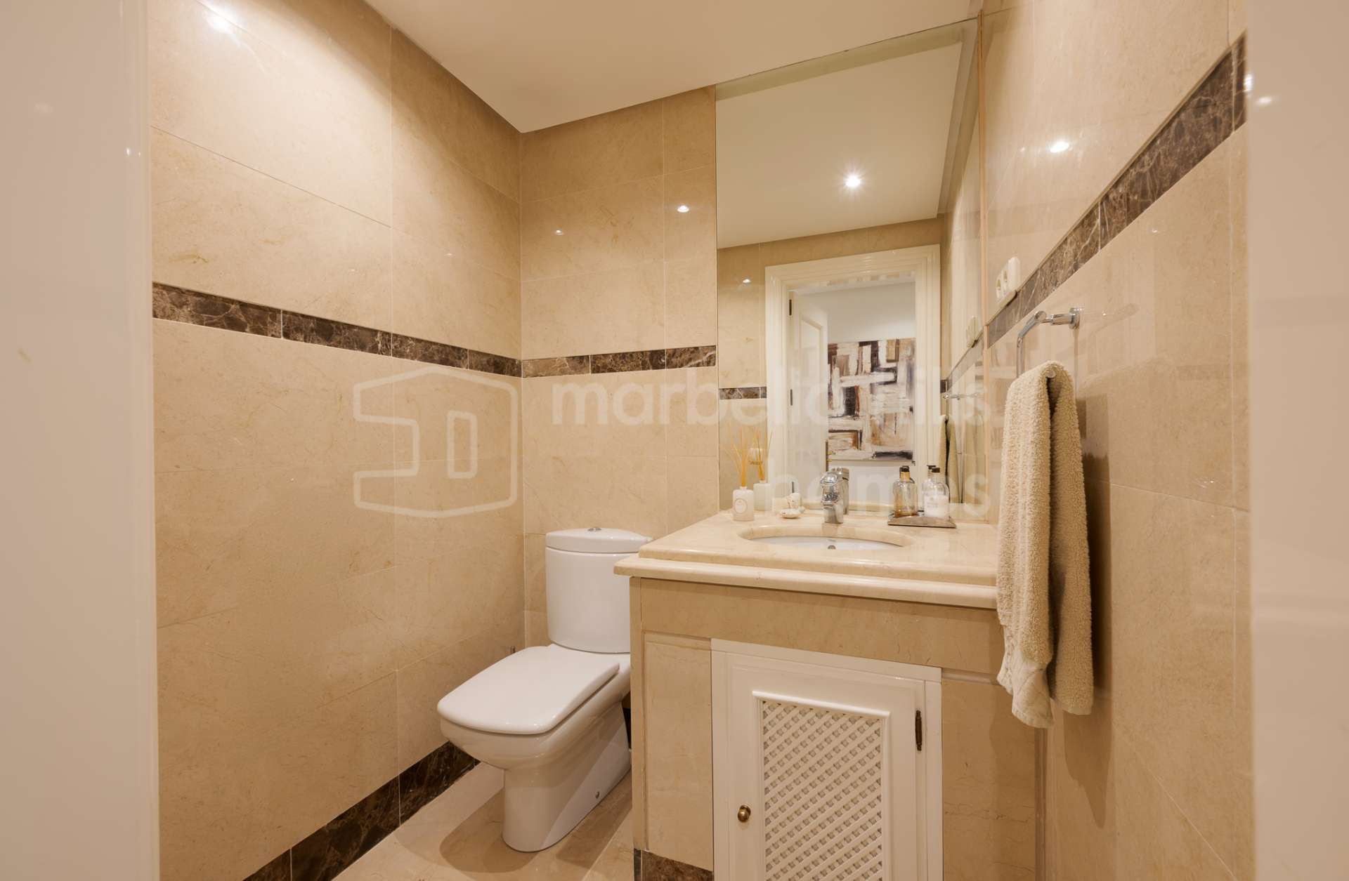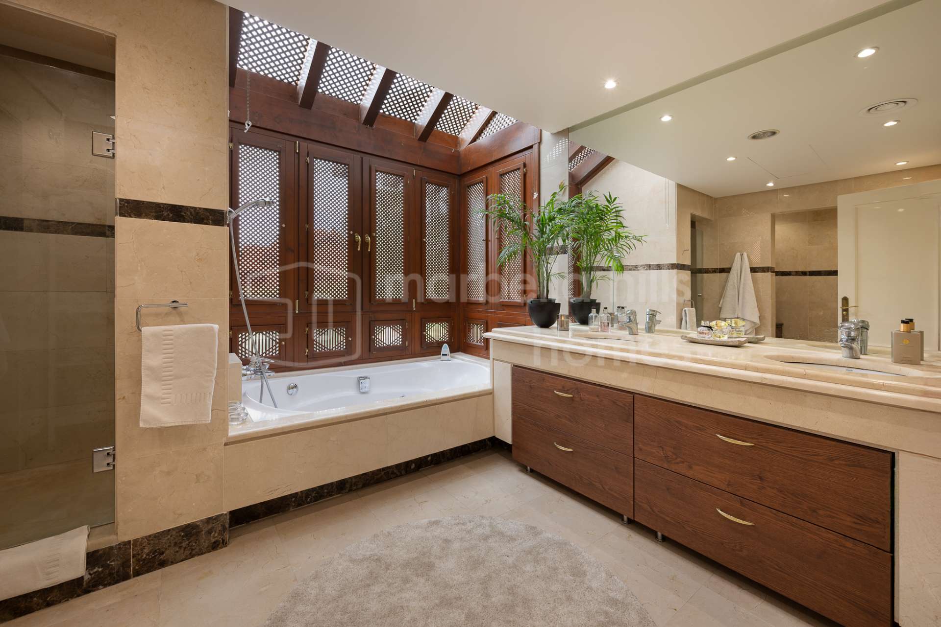 Die obere Etage ist der Hauptsuite gewidmet, mit hohen Decken, viel Tageslicht, großen Einbauschränken und einem en-suite Badezimmer mit Badewanne und separater Dusche.
