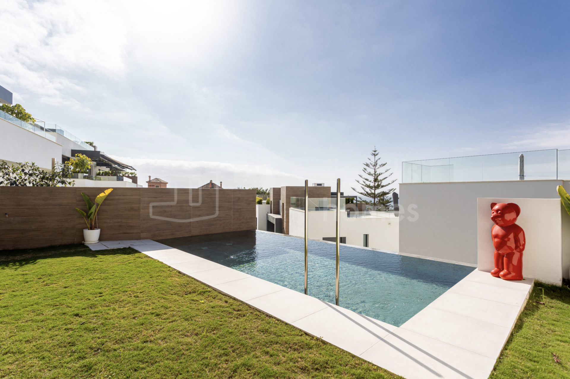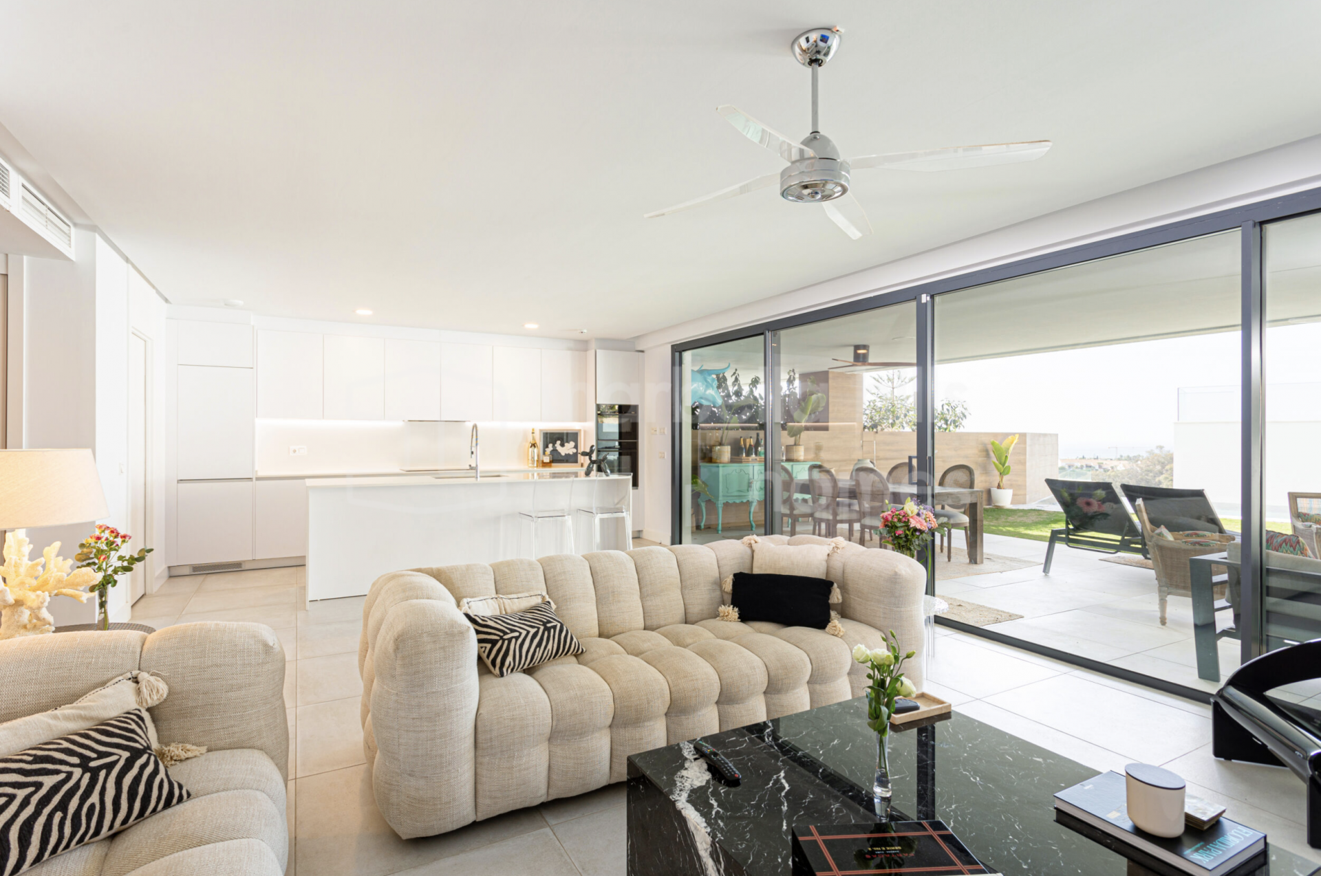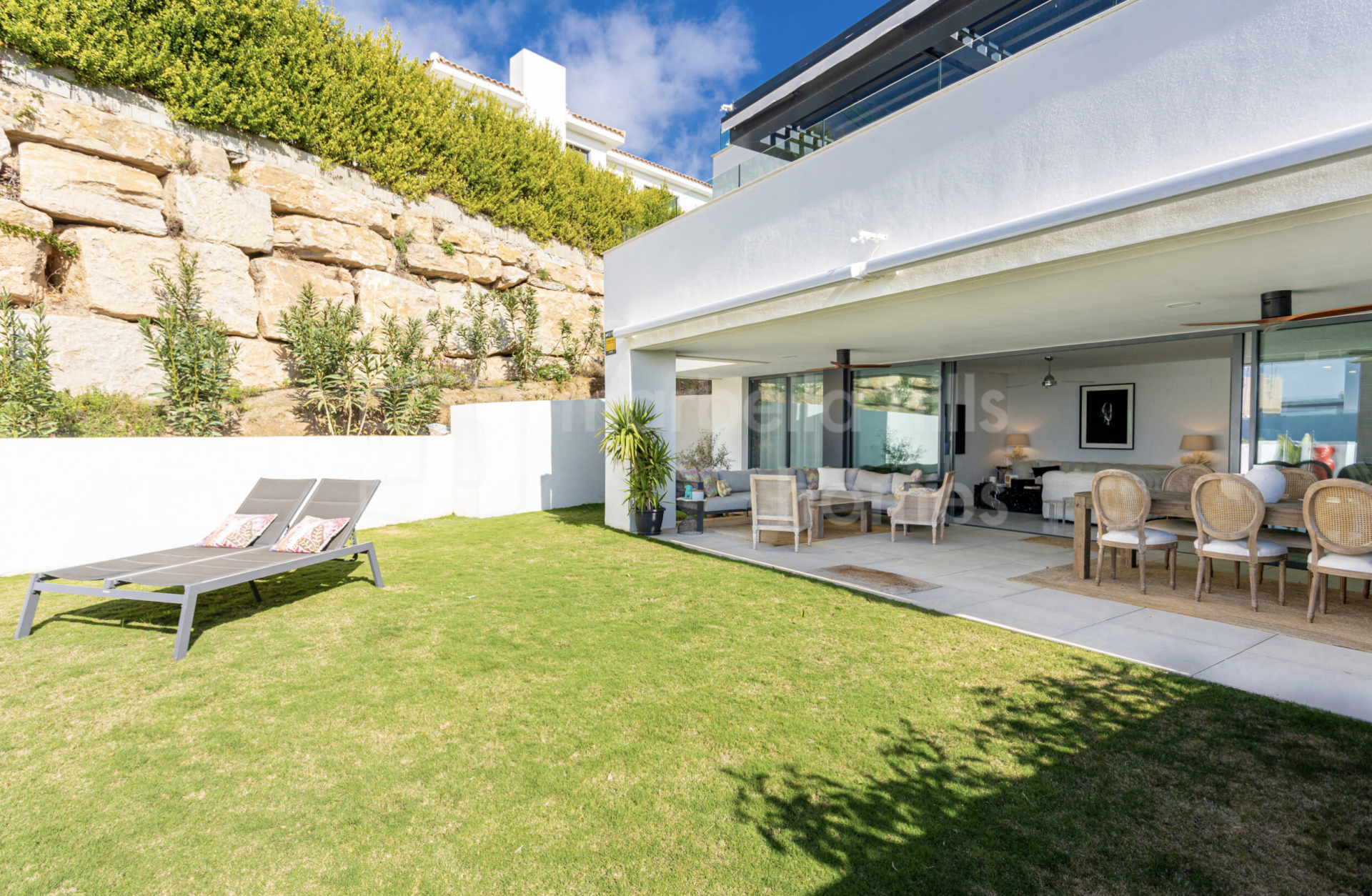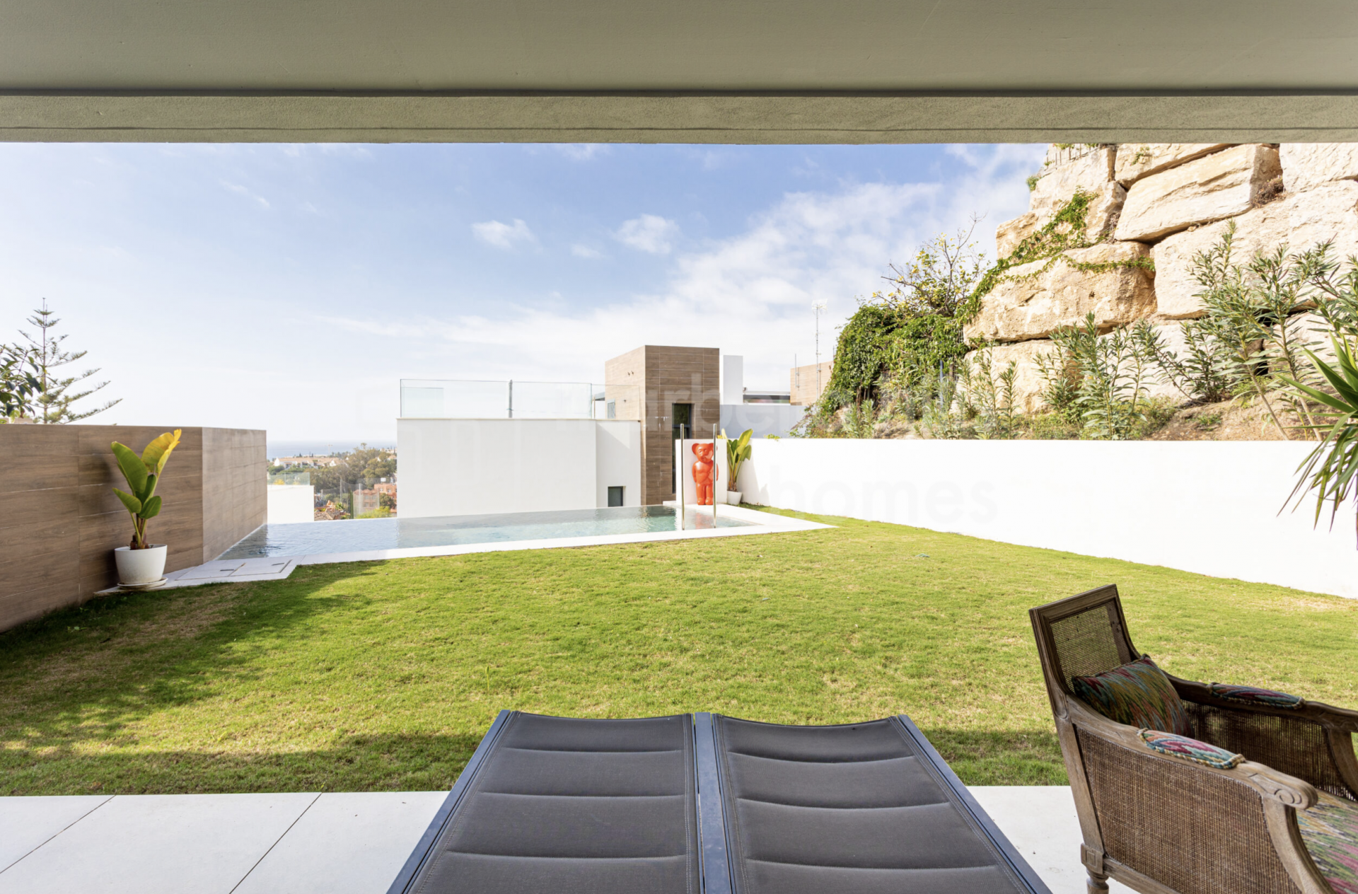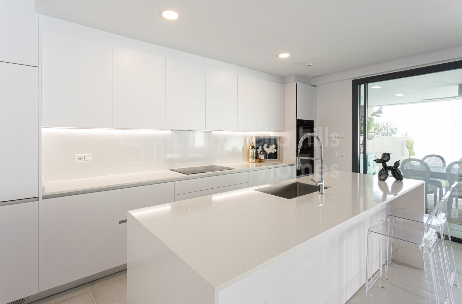 Alle Schlafzimmer verfügen über direkten Zugang zum privaten Garten und schaffen so eine nahtlose Verbindung zwischen Innen- und Außenbereich. Der helle Wohnbereich mit offener Küche und bodentiefen Fenstern vermittelt ein einladendes, zeitgemäßes Ambiente. Die voll ausgestattete Küche kombiniert Funktionalität und Design mit Quarz-Arbeitsplatten, hochwertigen Einbaugeräten und LED-Beleuchtung. Die Bäder überzeugen mit edler Optik und erstklassigen Materialien, die Langlebigkeit und Eleganz garantieren.