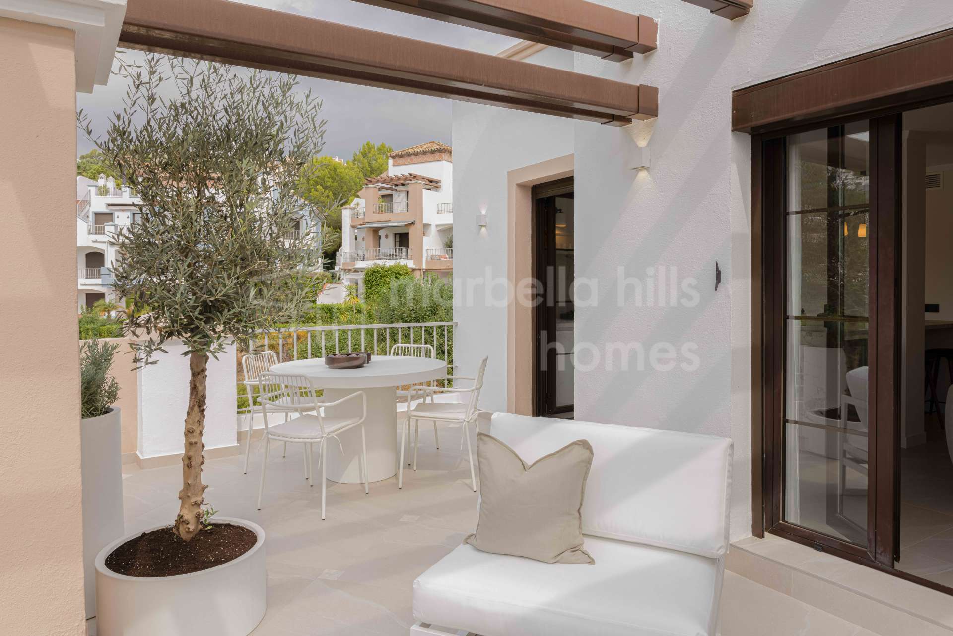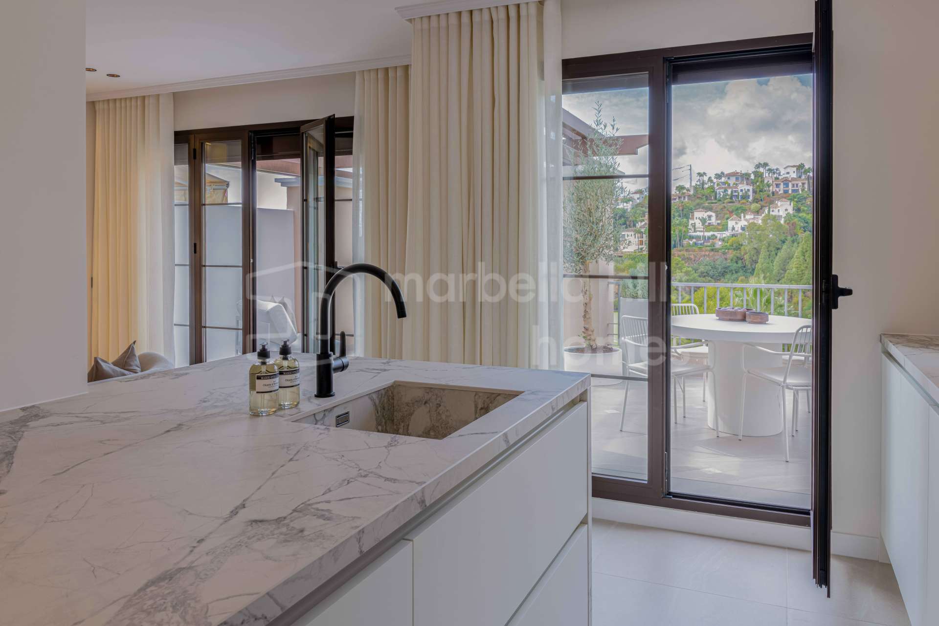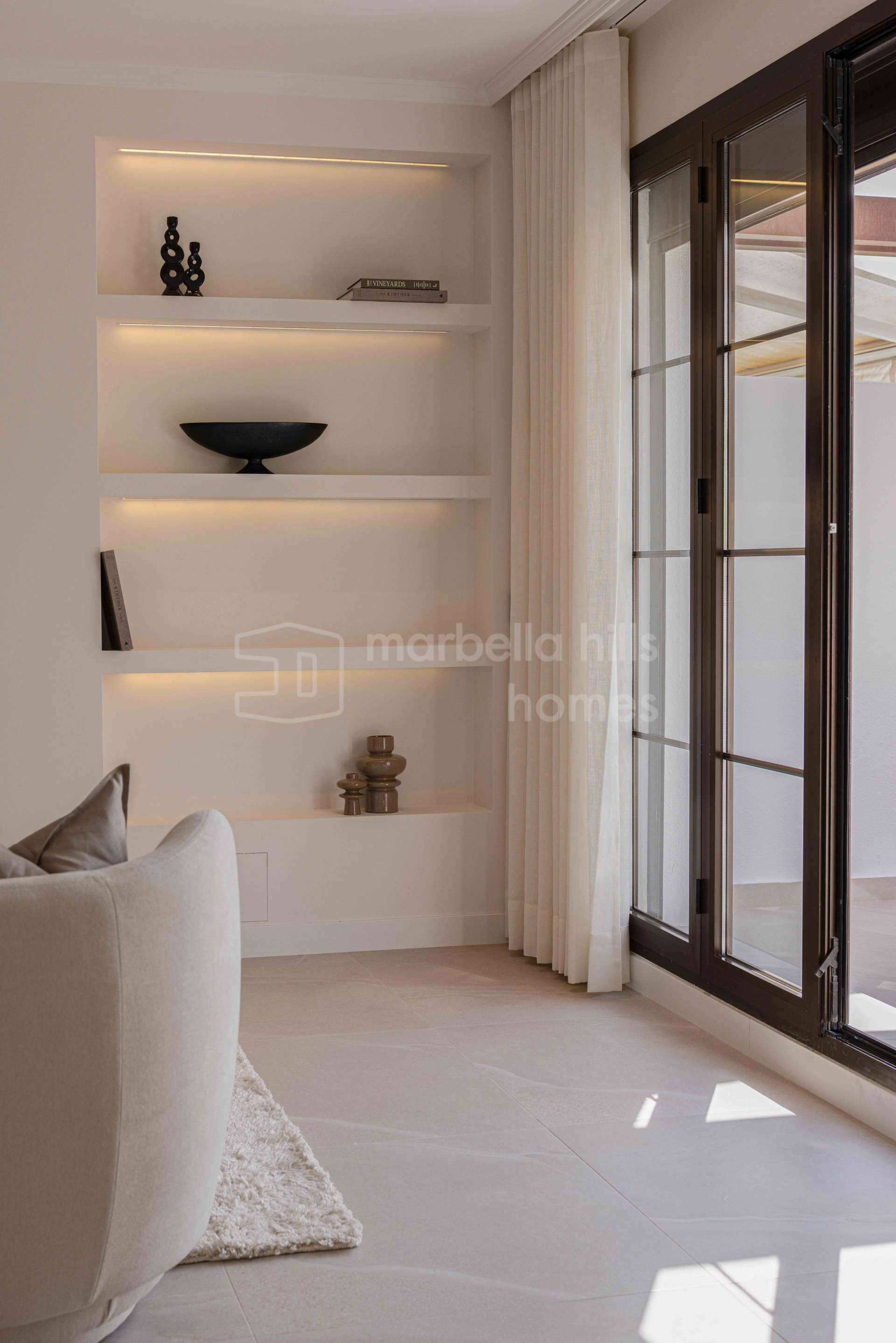 Entdecken Sie dieses beeindruckende Eck-Penthouse in der begehrten Wohnanlage La Torre im Los Arqueros Golf & Country Club, das vollständig renoviert wurde und durch elegantes, zeitgenössisches Design sowie hochwertige Handwerkskunst besticht. Jedes Detail dieser Immobilie vereint Stil, Komfort und Raffinesse und schafft ein Zuhause, das den modernen mediterranen Lebensstil perfekt verkörpert.