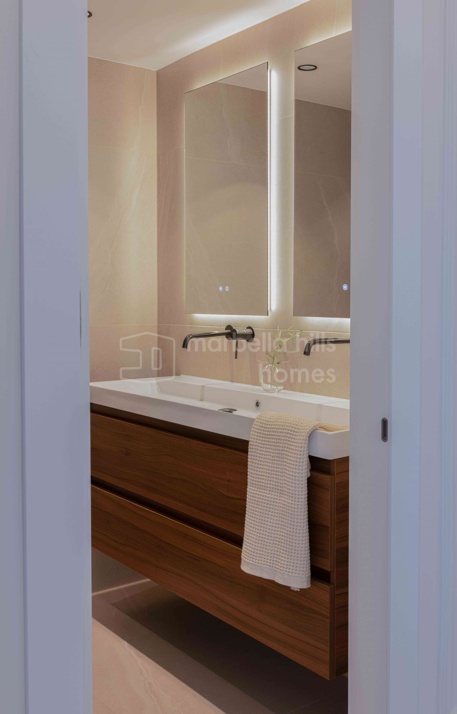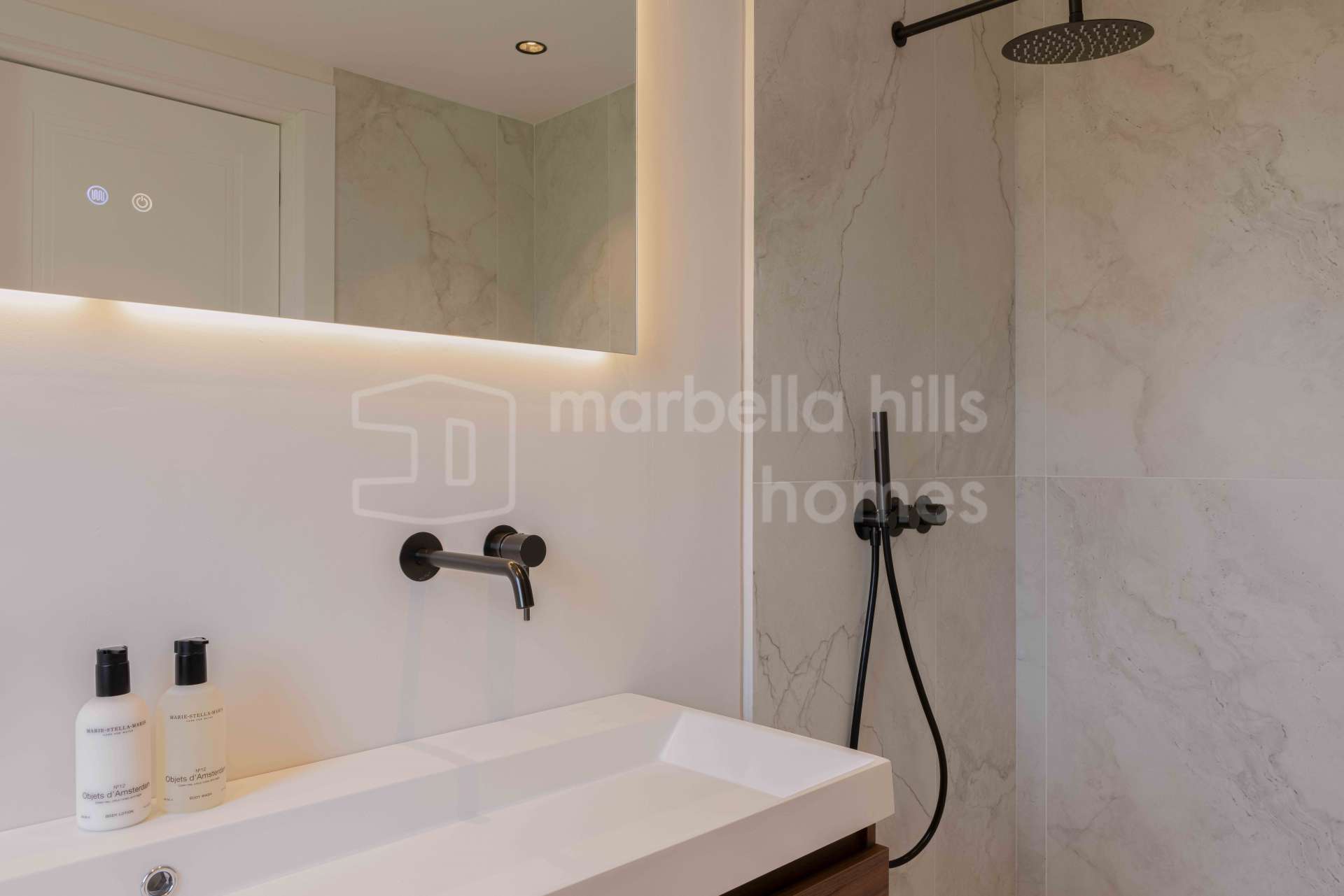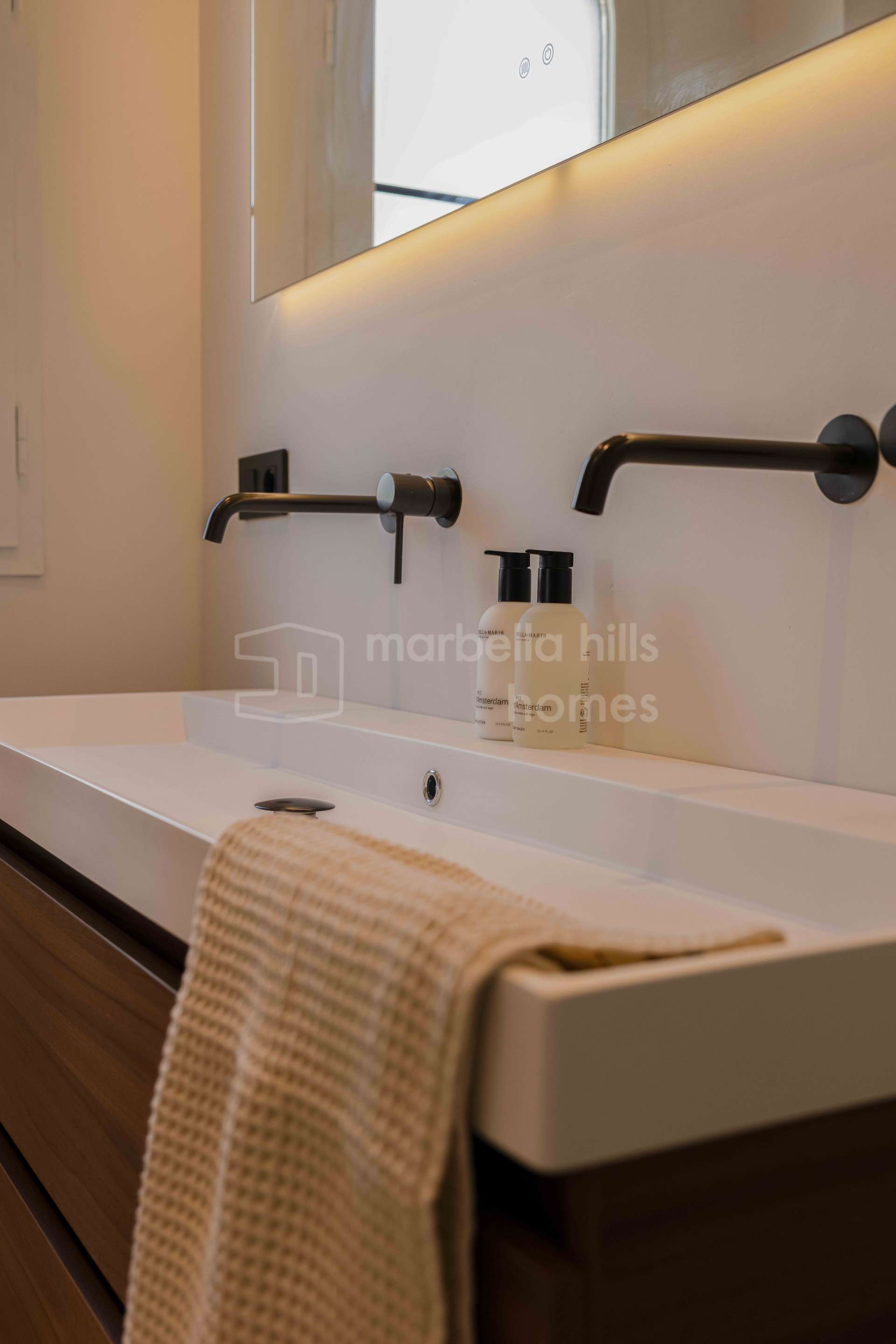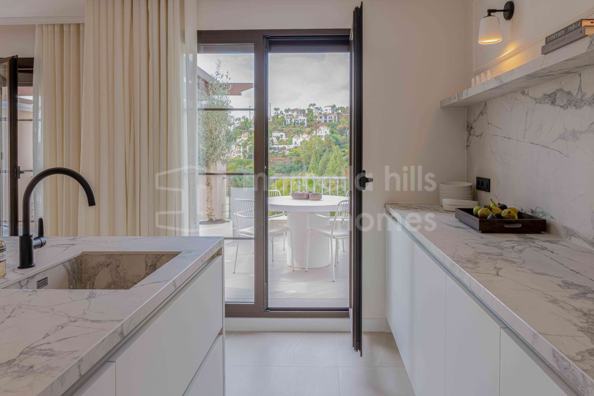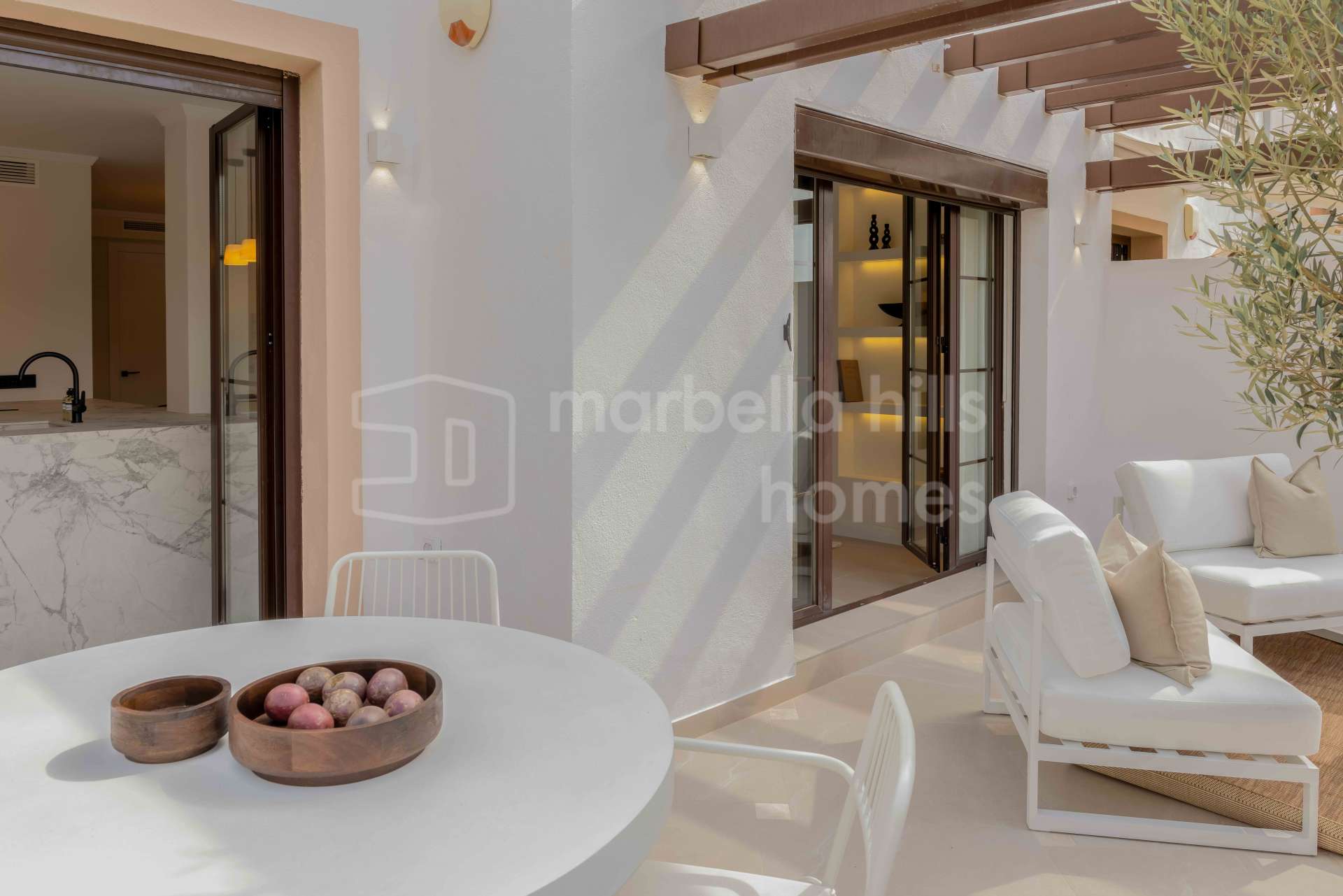 Große Schiebetüren öffnen sich zu weitläufigen Terrassen mit Panoramablick auf die umliegenden Berge und den Golfplatz – ein perfekter Ort, um die Sonne zu genießen oder Gäste im Freien zu empfangen. Das Ergebnis ist eine moderne, friedvolle Oase, die das Wesen des eleganten Lebens an der Costa del Sol einfängt.