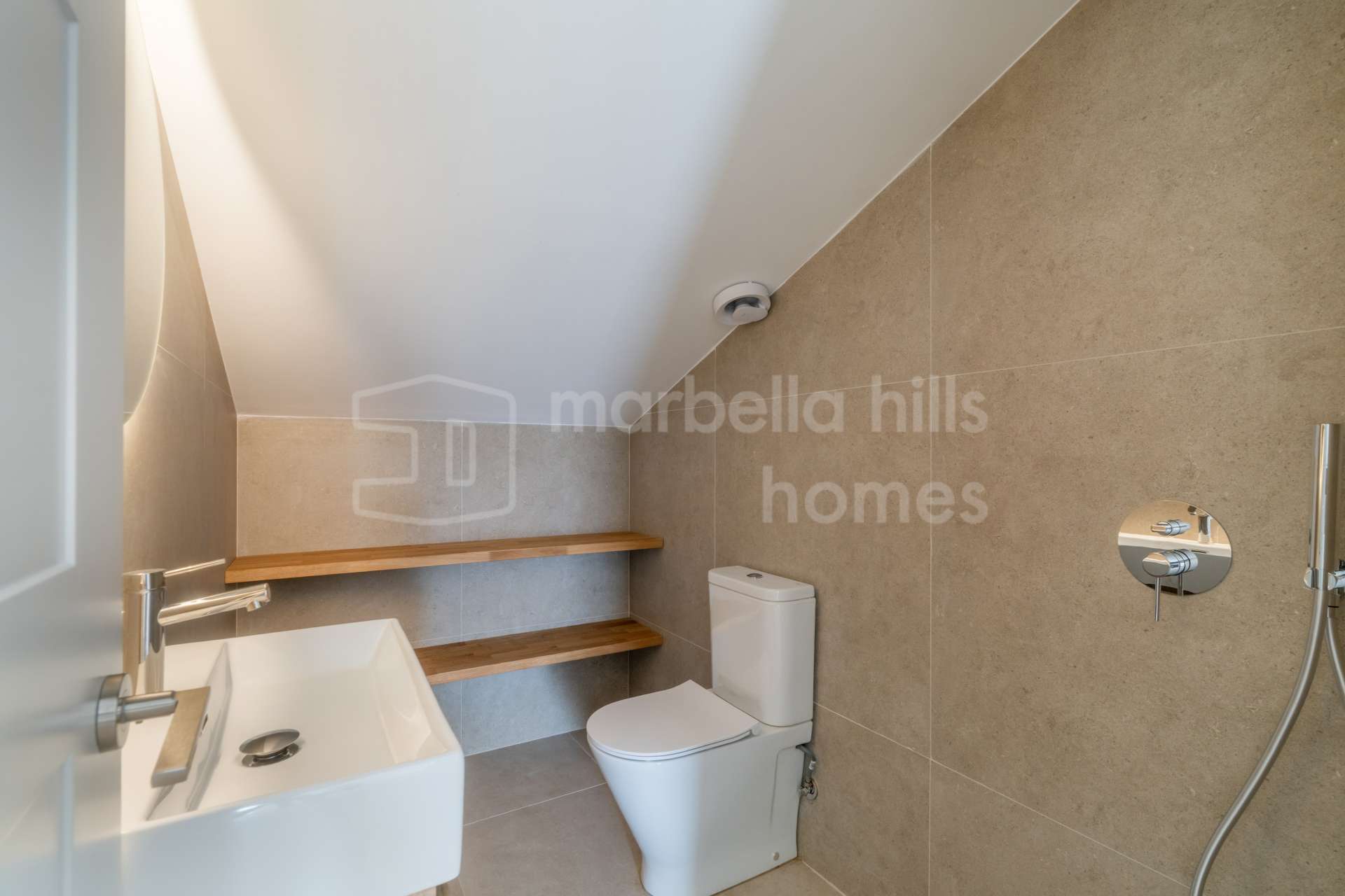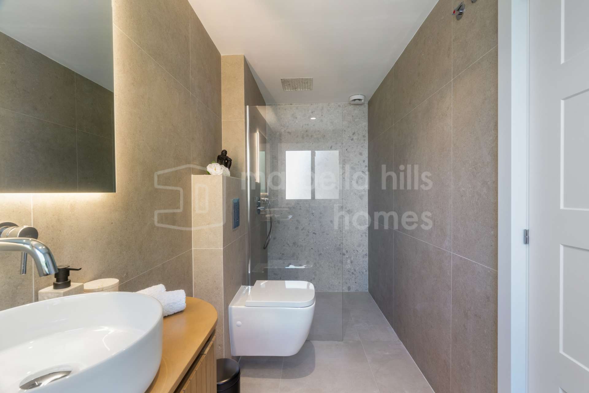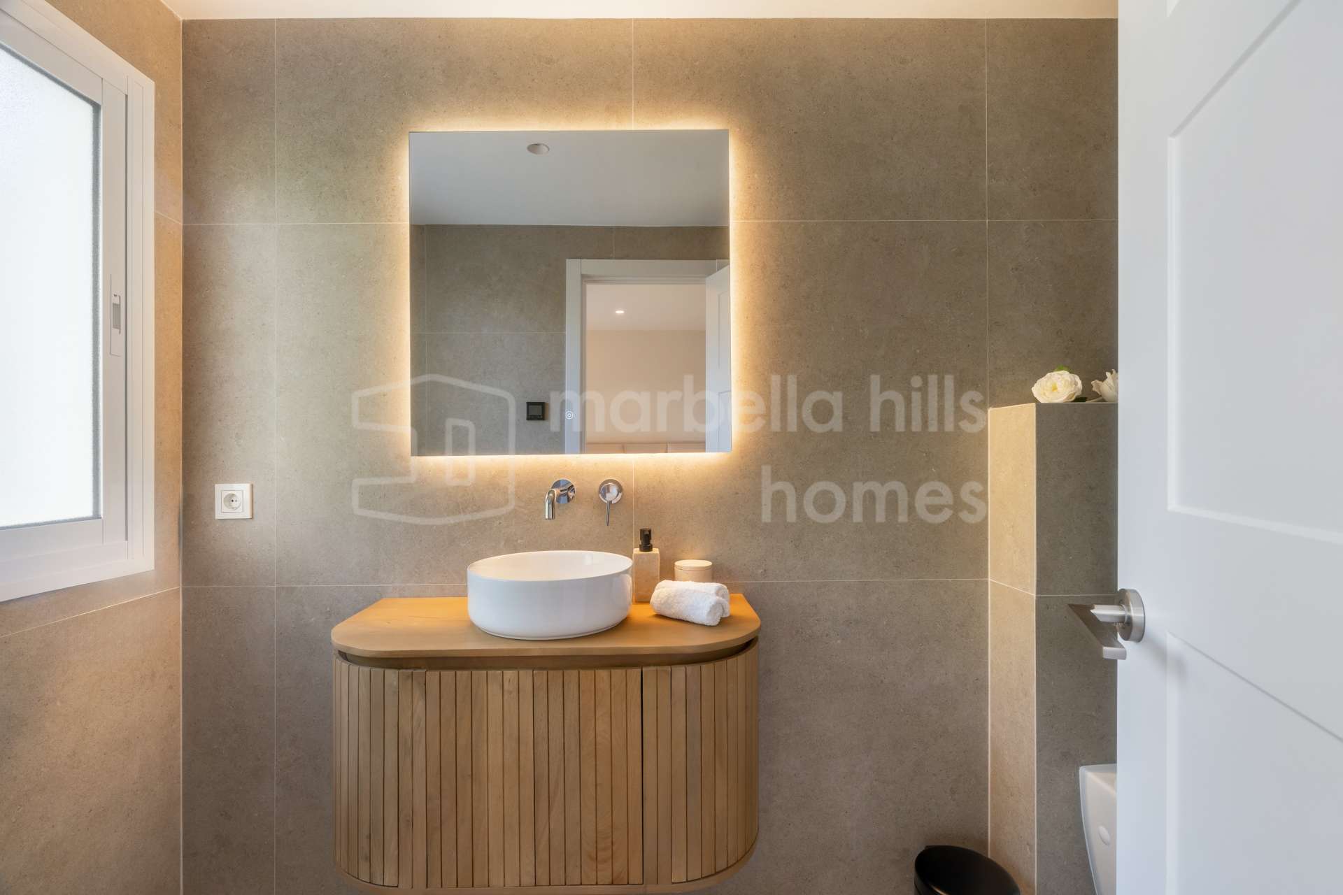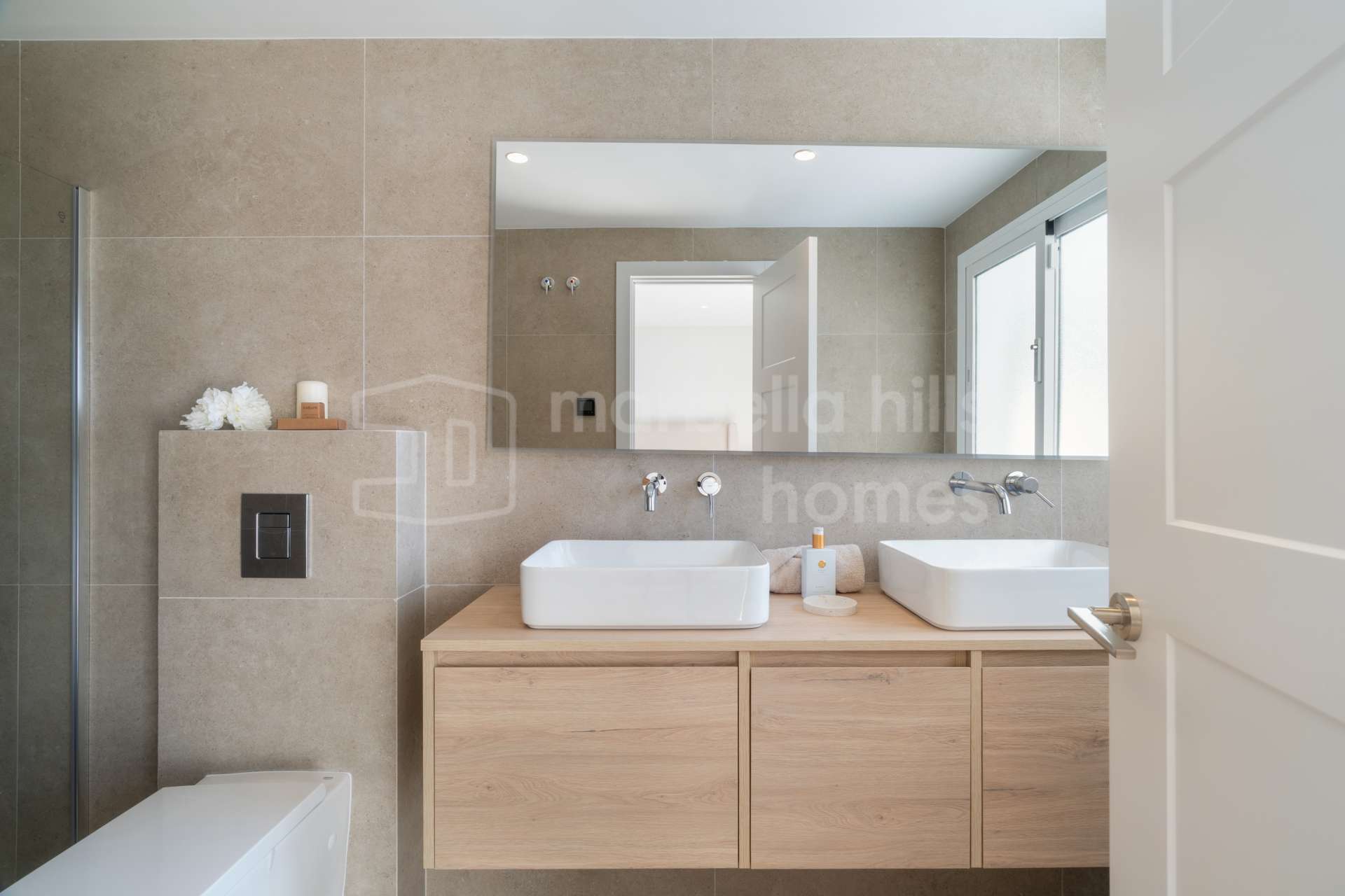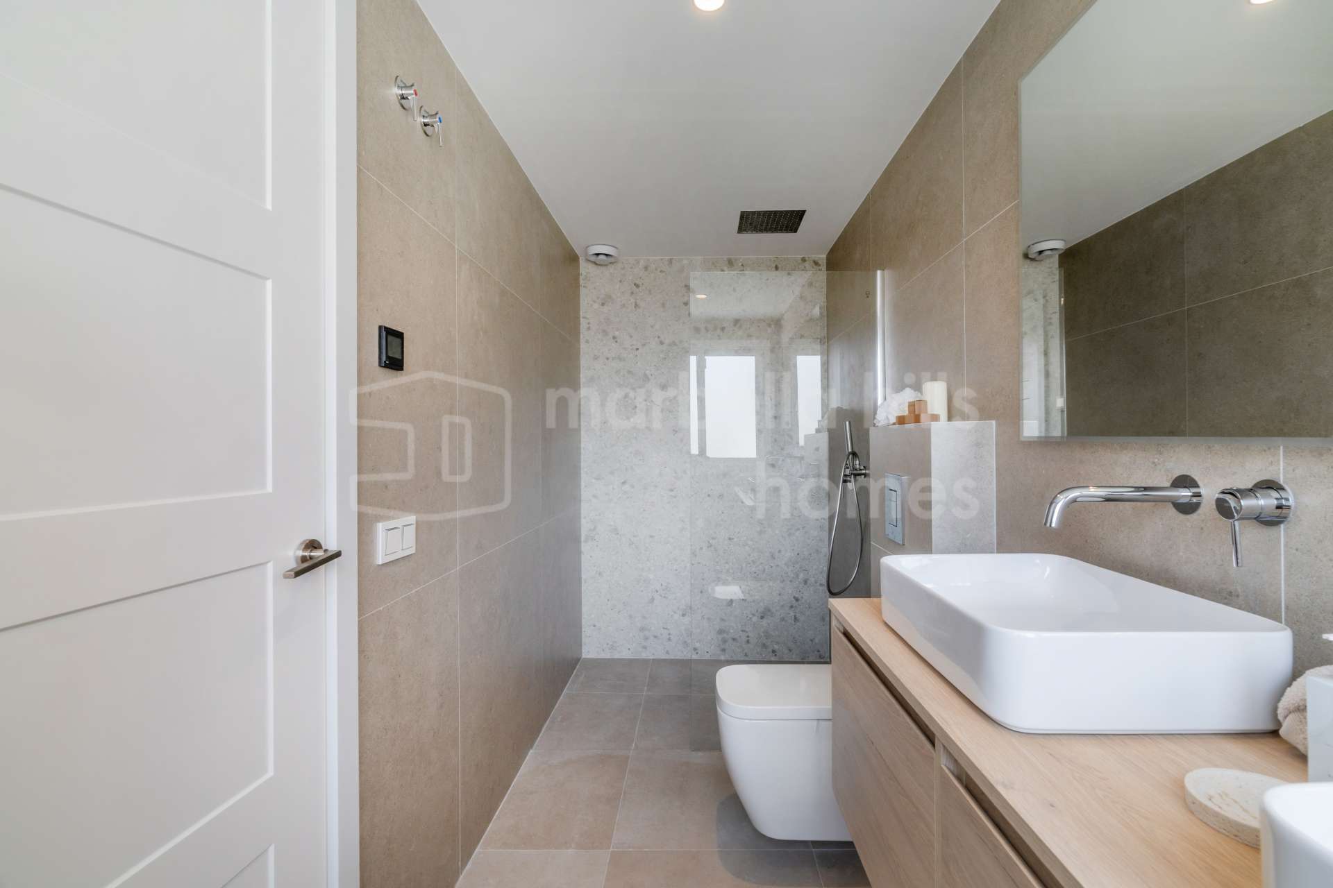 Im Erdgeschoss befindet sich ein großzügiger, offener Wohnbereich mit einer stilvollen Ballingslöv-Küche, ausgestattet mit hochwertigen Geräten sowie integrierter Waschmaschine und Trockner. Der helle Wohnbereich öffnet sich durch große Fensterfronten auf die Terrasse, während ein elegantes Weindisplay unter der Treppe für ein raffiniertes Ambiente sorgt. Das Airzone-System ermöglicht eine individuelle Klimasteuerung in jedem Raum, und die Badezimmer verfügen über Fußbodenheizung und beige Fliesen in voller Höhe für ein ruhiges, Spa-ähnliches Gefühl.