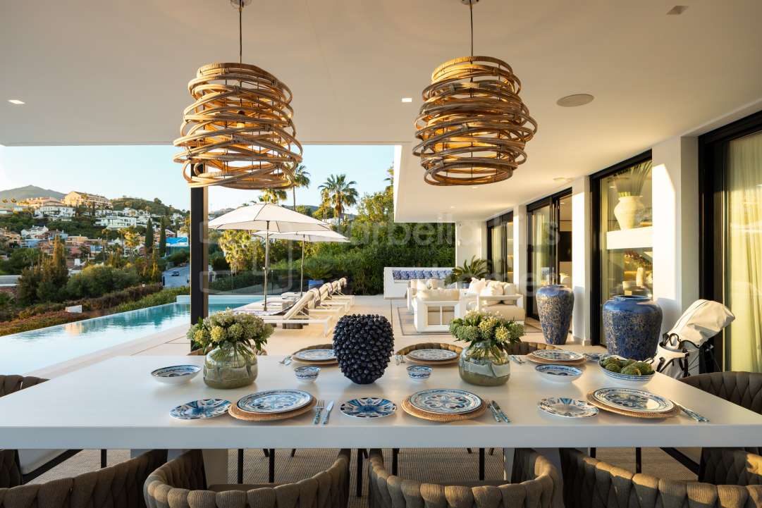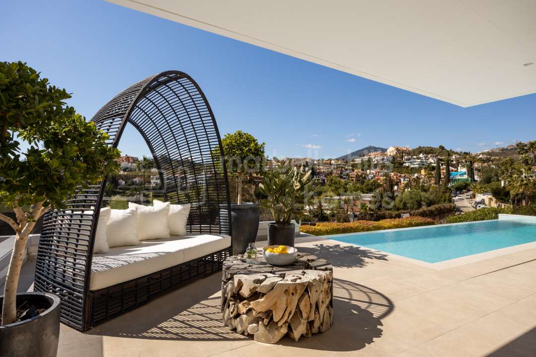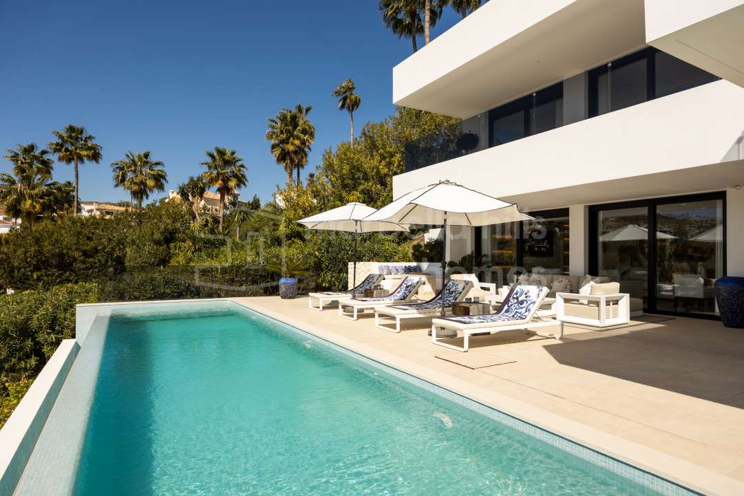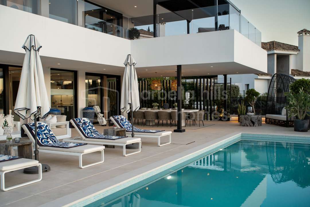 Ein privater Swimmingpool bildet das Herzstück des Außenbereichs, umgeben von Sonnenterrassen und üppigem Grün – ideal, um das außergewöhnliche Klima von Marbella das ganze Jahr über zu genießen.