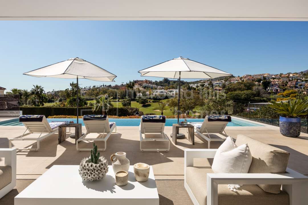 Luxusvilla in Nueva Andalucía Marbella in erster Golflinie am Los Naranjos Golf. 4 Schlafzimmer, Infinity-Pool und modernes Design in Top-Lage.