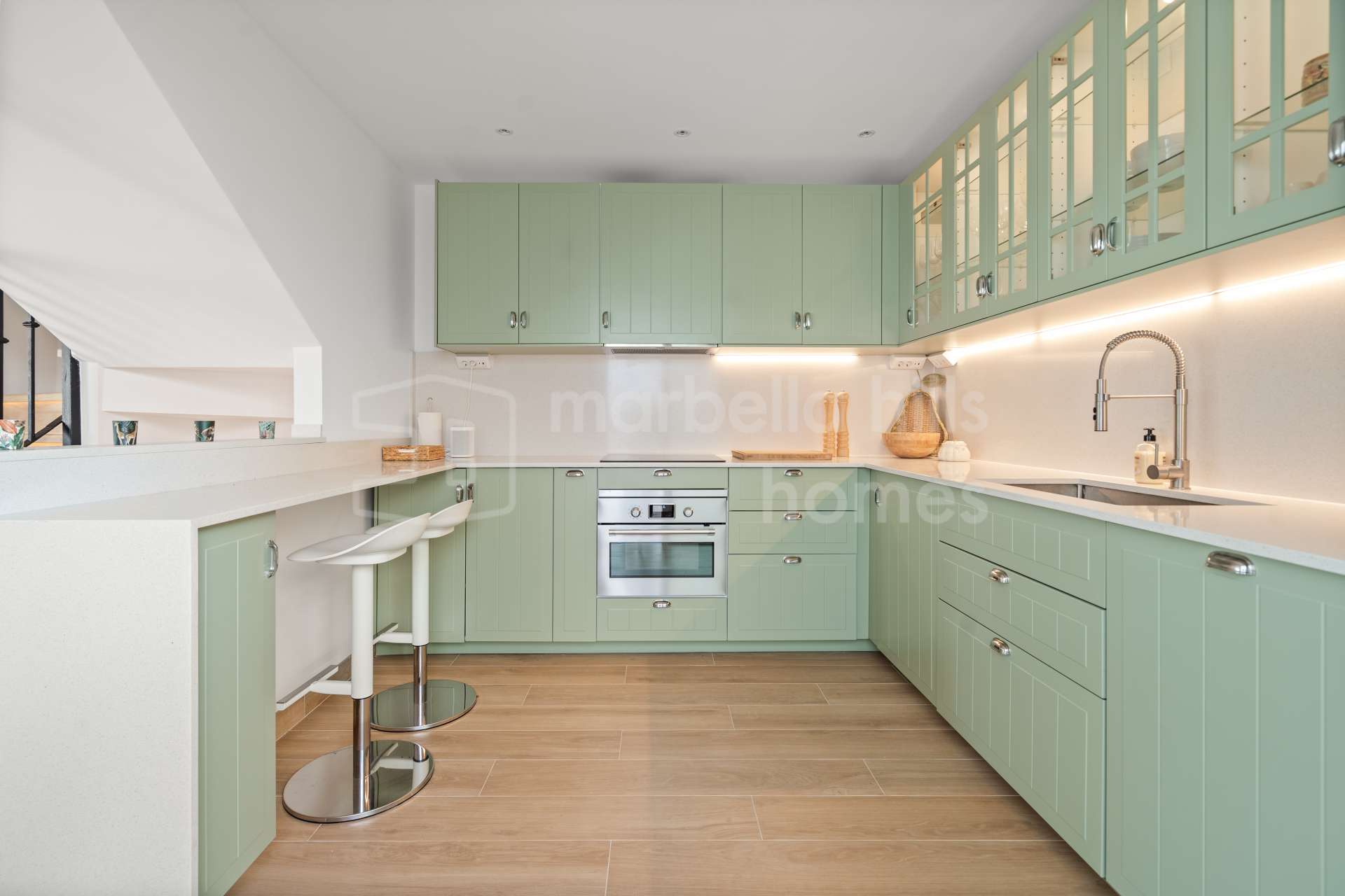 Die renovierte Küche verbindet Funktionalität und modernen Stil. Sie bietet integrierte Geräte, optimale Stauraumlösungen und fügt sich nahtlos in das elegante Gesamtkonzept des Hauses ein.