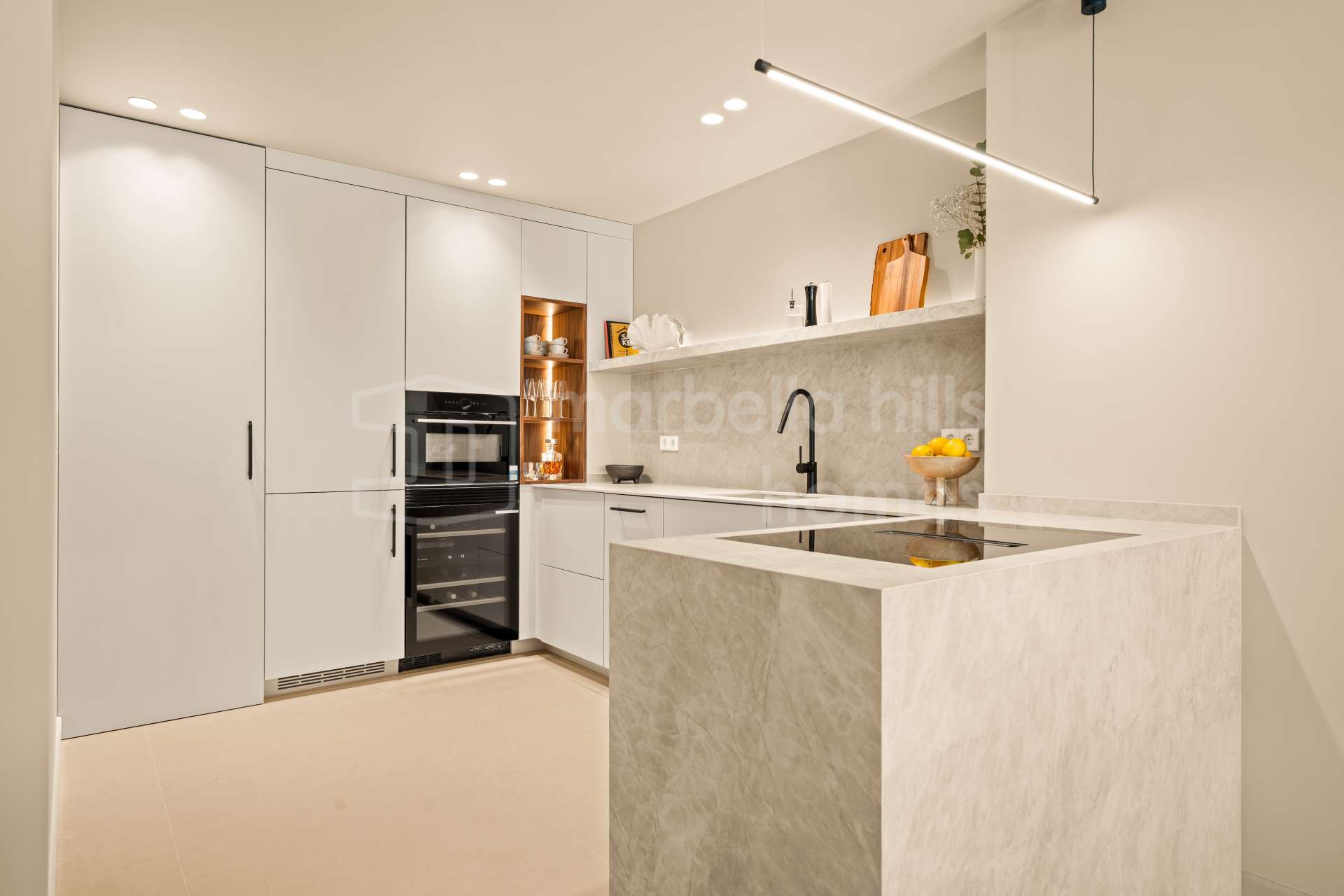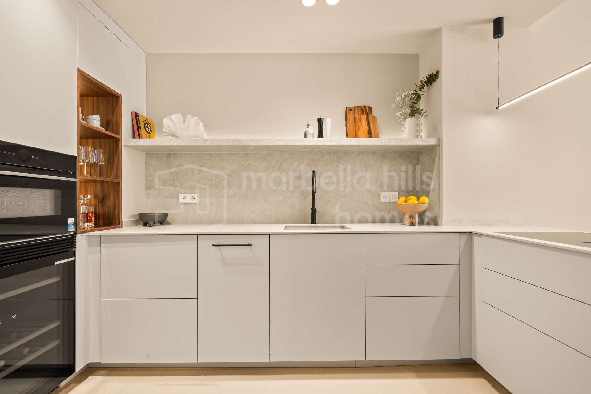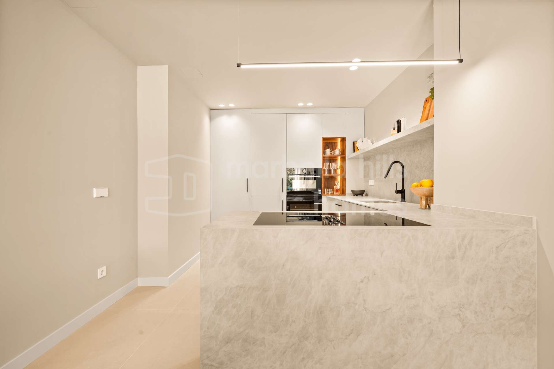 Die Wohnung wurde vollständig mit hochwertigen Materialien modernisiert und präsentiert sich in hellen Naturtönen, klaren Linien und einer harmonischen Kombination aus modernen Möbeln und natürlichen Texturen. Große Fenster durchfluten die Räume mit Tageslicht und verbinden das Innere mit der grünen Umgebung, wodurch eine ruhige und entspannte Atmosphäre entsteht. Die moderne, voll ausgestattete Küche verfügt über brandneue Elektrogeräte. Drei Schlafzimmer mit eigenem Bad bieten Komfort und Privatsphäre, ergänzt durch Fußbodenheizung in allen Badezimmern sowie ein Airzone-Klimasystem mit individueller Regelung in jedem Zimmer.