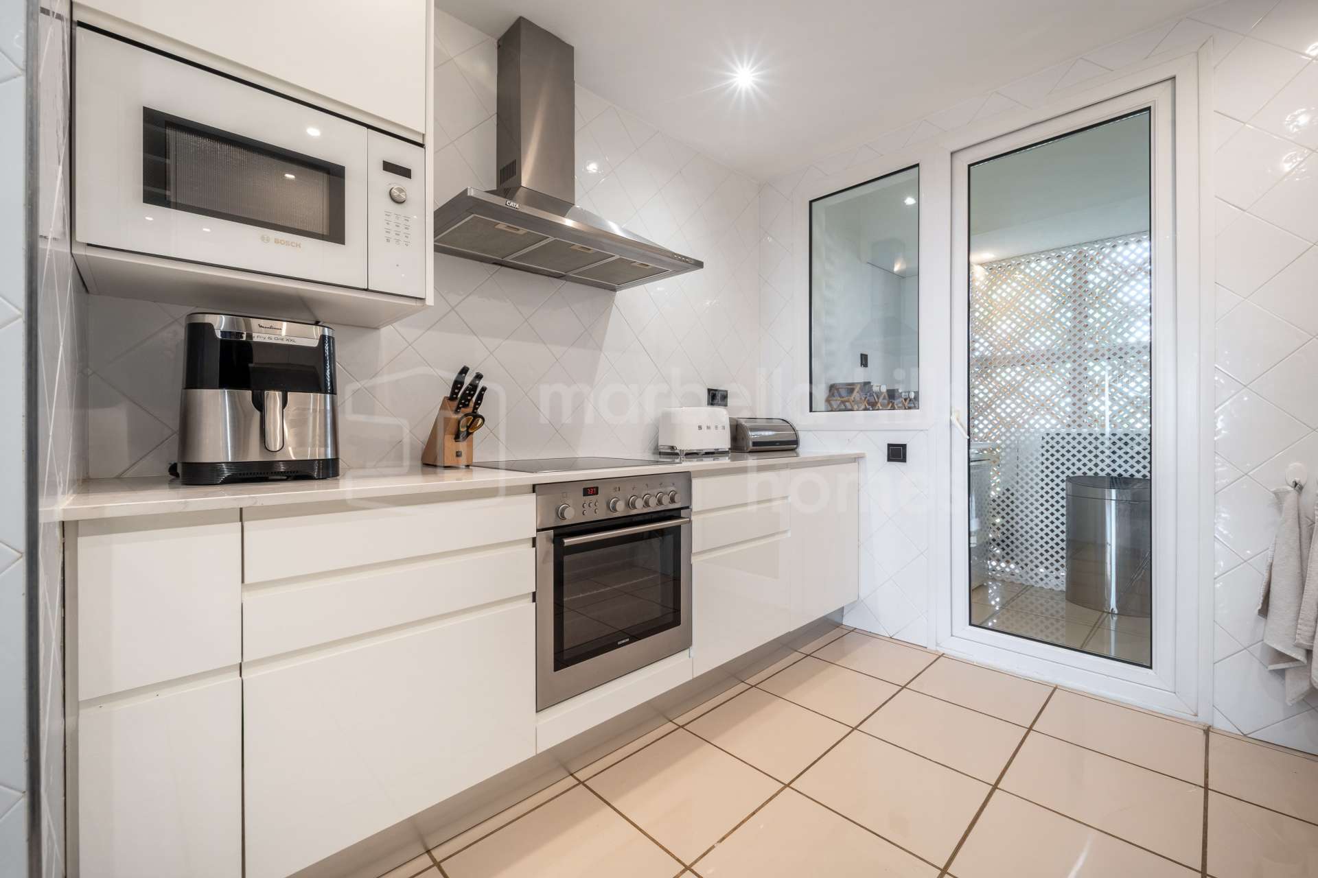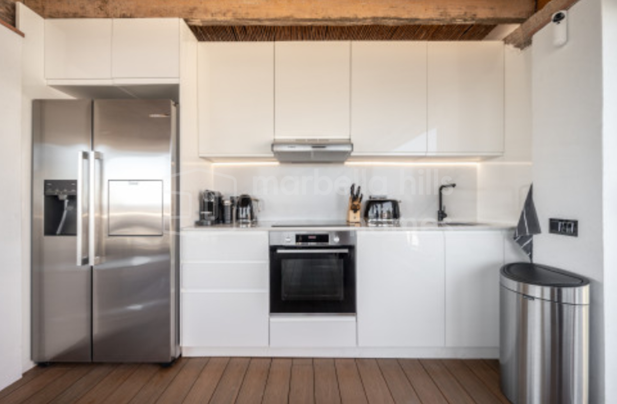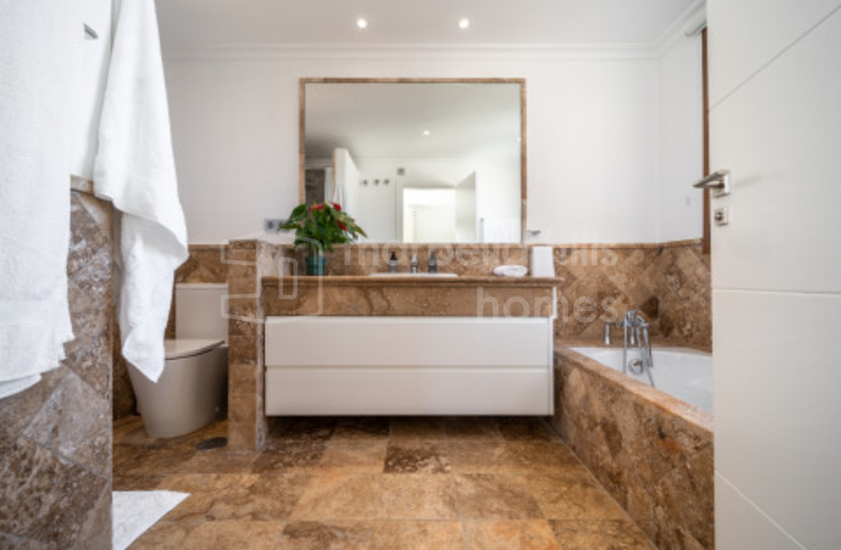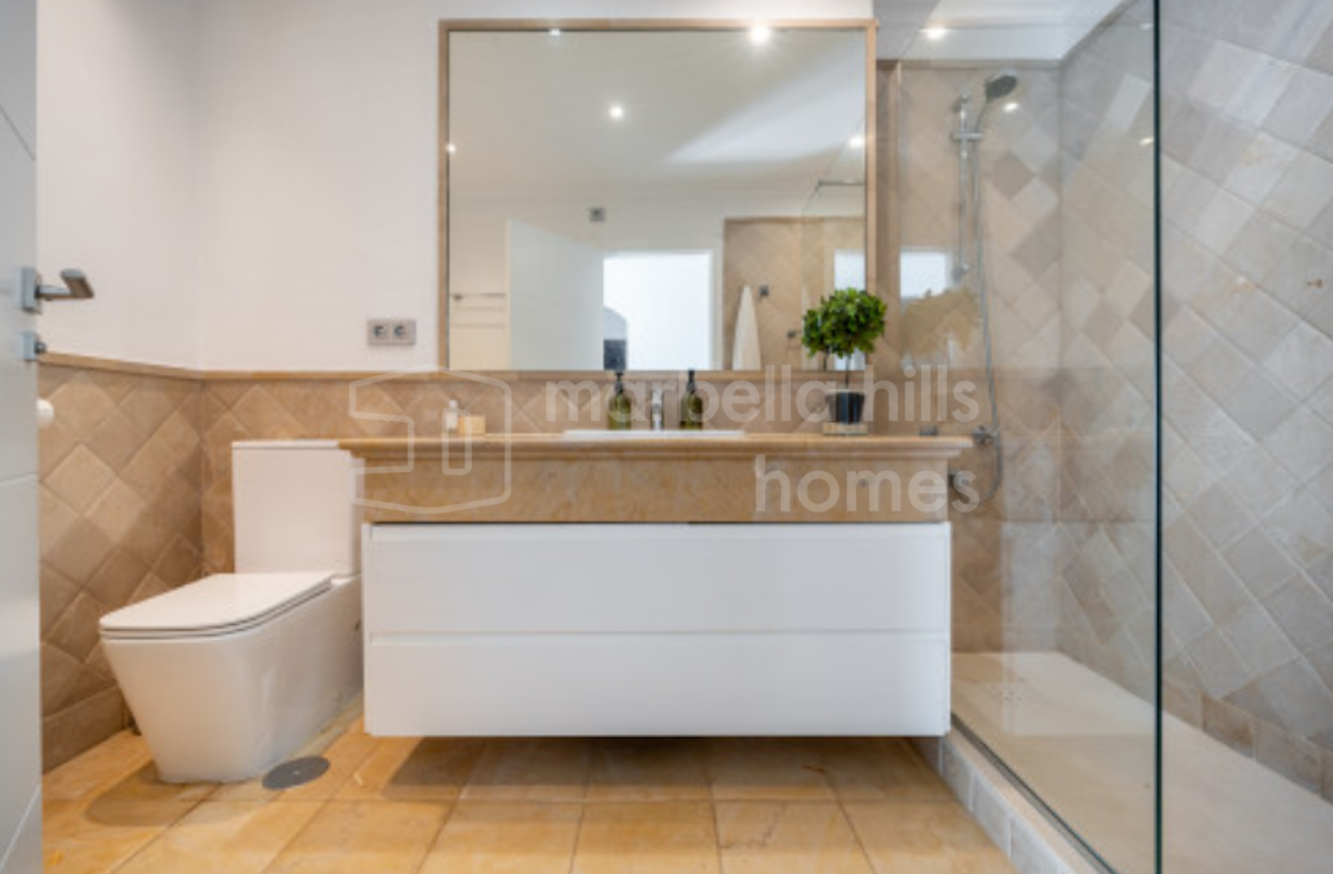 Das Penthouse wurde kürzlich mit hochwertigen Materialien komplett renoviert und verbindet modernes mediterranes Design mit einer warmen, einladenden Atmosphäre. Die Hauptetage verfügt über ein großzügiges, lichtdurchflutetes Wohn- und Esszimmer mit großflächigen Fenstern, die nahtlos auf die Hauptterrasse führen, sowie über eine moderne, voll ausgestattete Küche mit separatem Hauswirtschaftsraum. Auf dieser Ebene befinden sich außerdem zwei Doppelzimmer, beide in einem ruhigen und eleganten Stil gestaltet, die sich ein stilvolles Bad mit Walk-in-Dusche teilen. Eines der Schlafzimmer bietet direkten Zugang zur Terrasse – ideal für ruhige Morgenstunden oder entspannte Abende.
