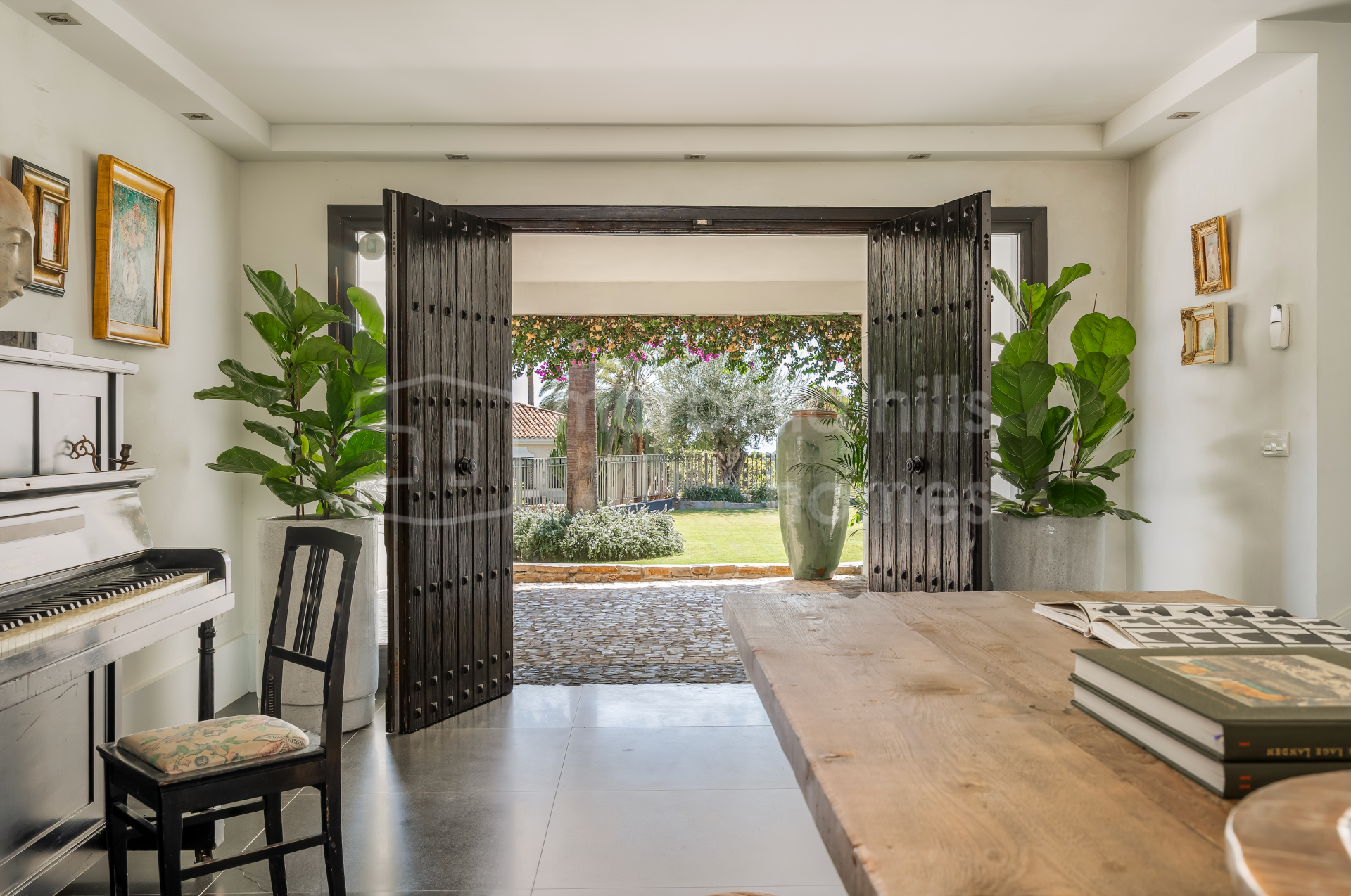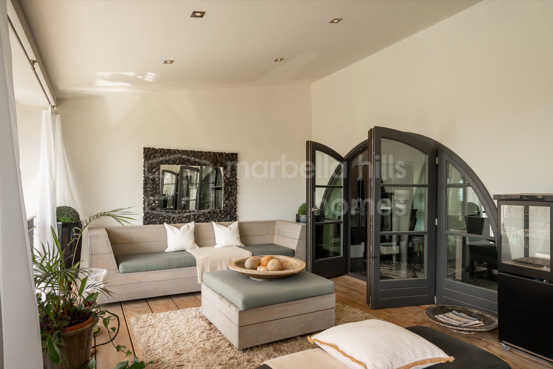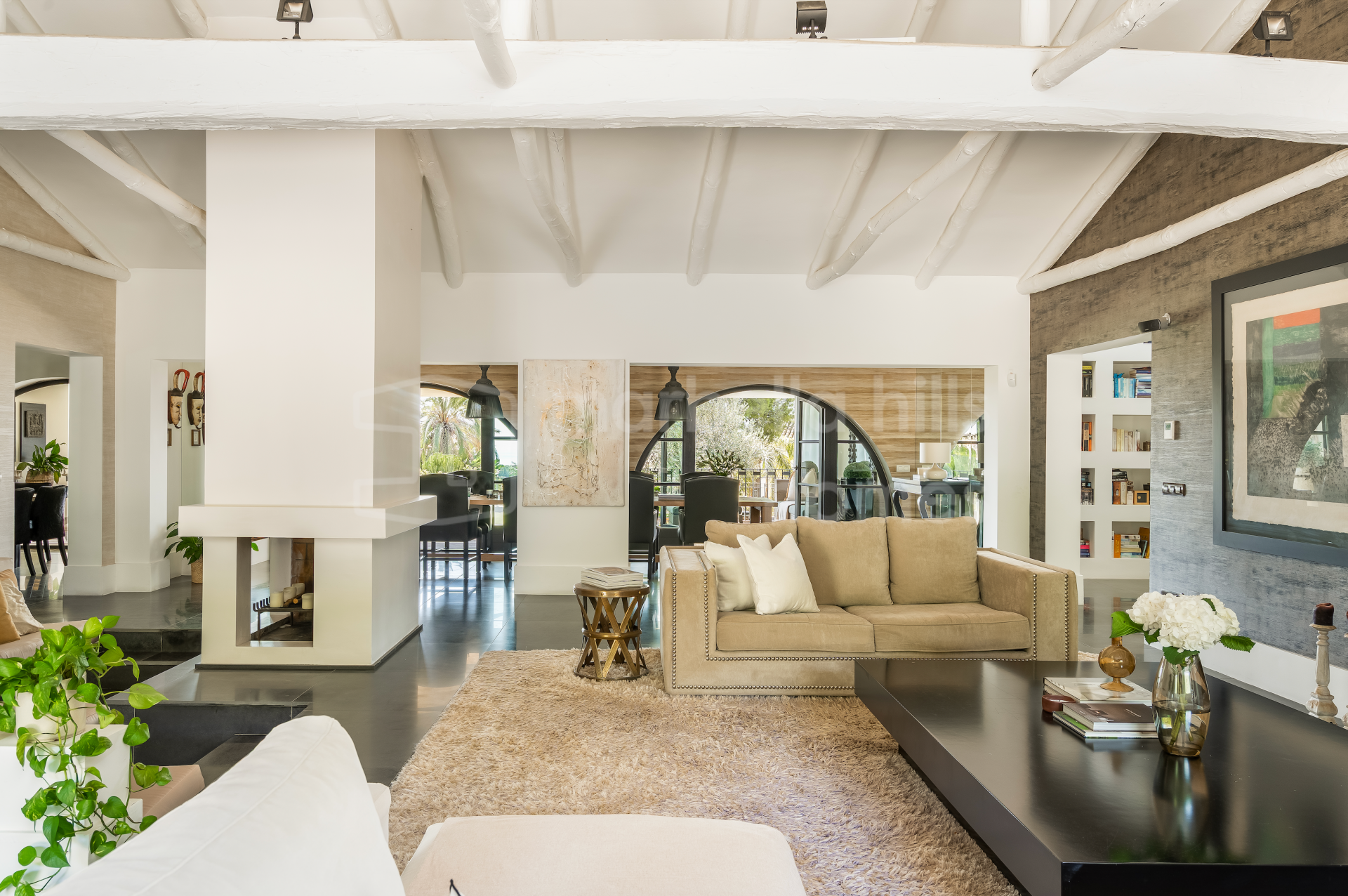 Die Wohnbereiche sind hell und einladend gestaltet. Großzügige Wohn- und Essbereiche werden durch zwei Kamine ergänzt, darunter ein markanter doppelseitiger Kamin. Hohe, gewölbte Decken mit sichtbaren Holzbalken verleihen dem Haus eine warme und behagliche Atmosphäre. Große Fenster und Türen der renommierten Roman-Clavero-Schreinerei verbinden den Innenbereich nahtlos mit der Hauptterrasse und dem Garten und ermöglichen ein angenehmes Indoor-Outdoor-Wohnen.