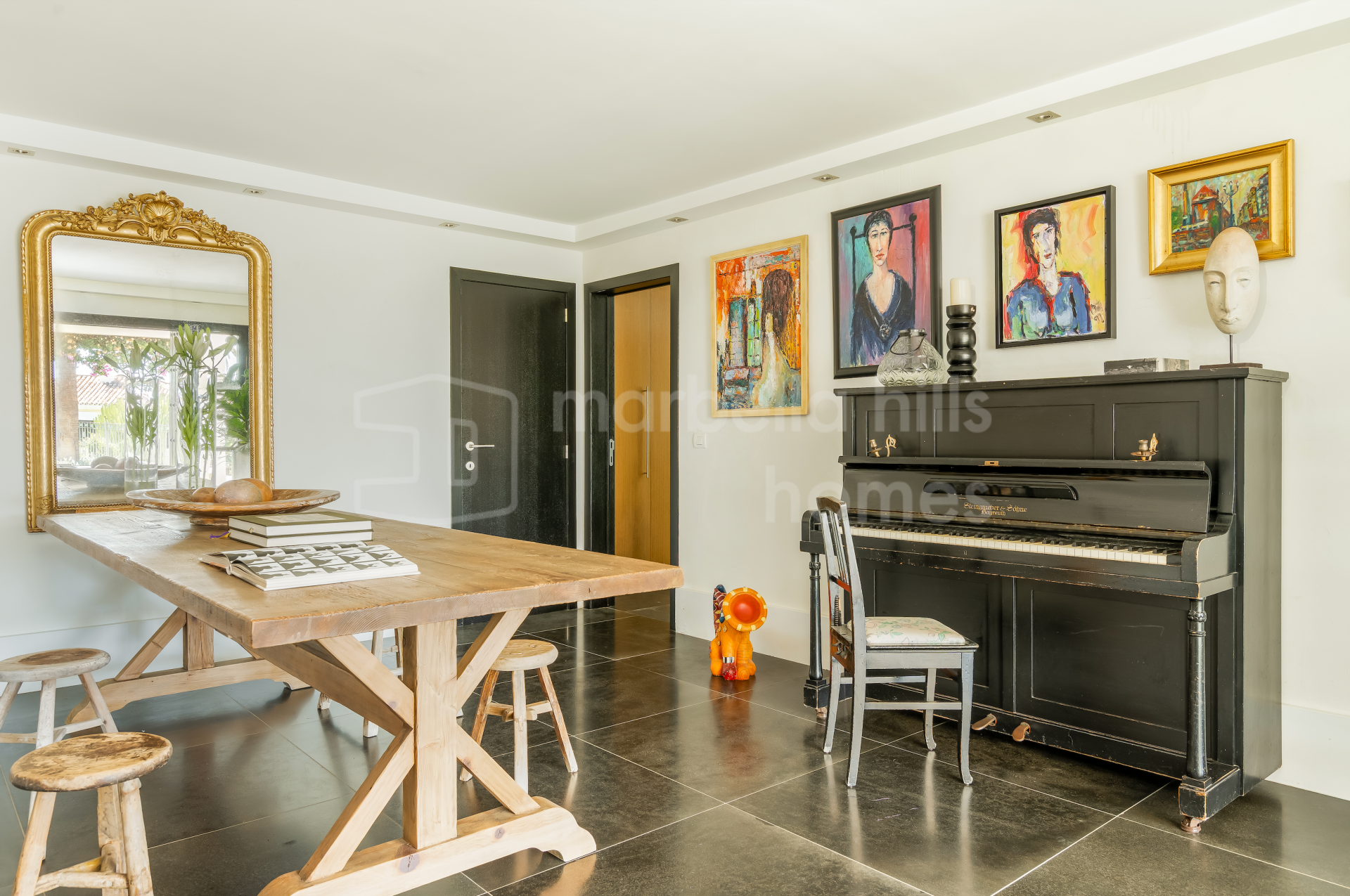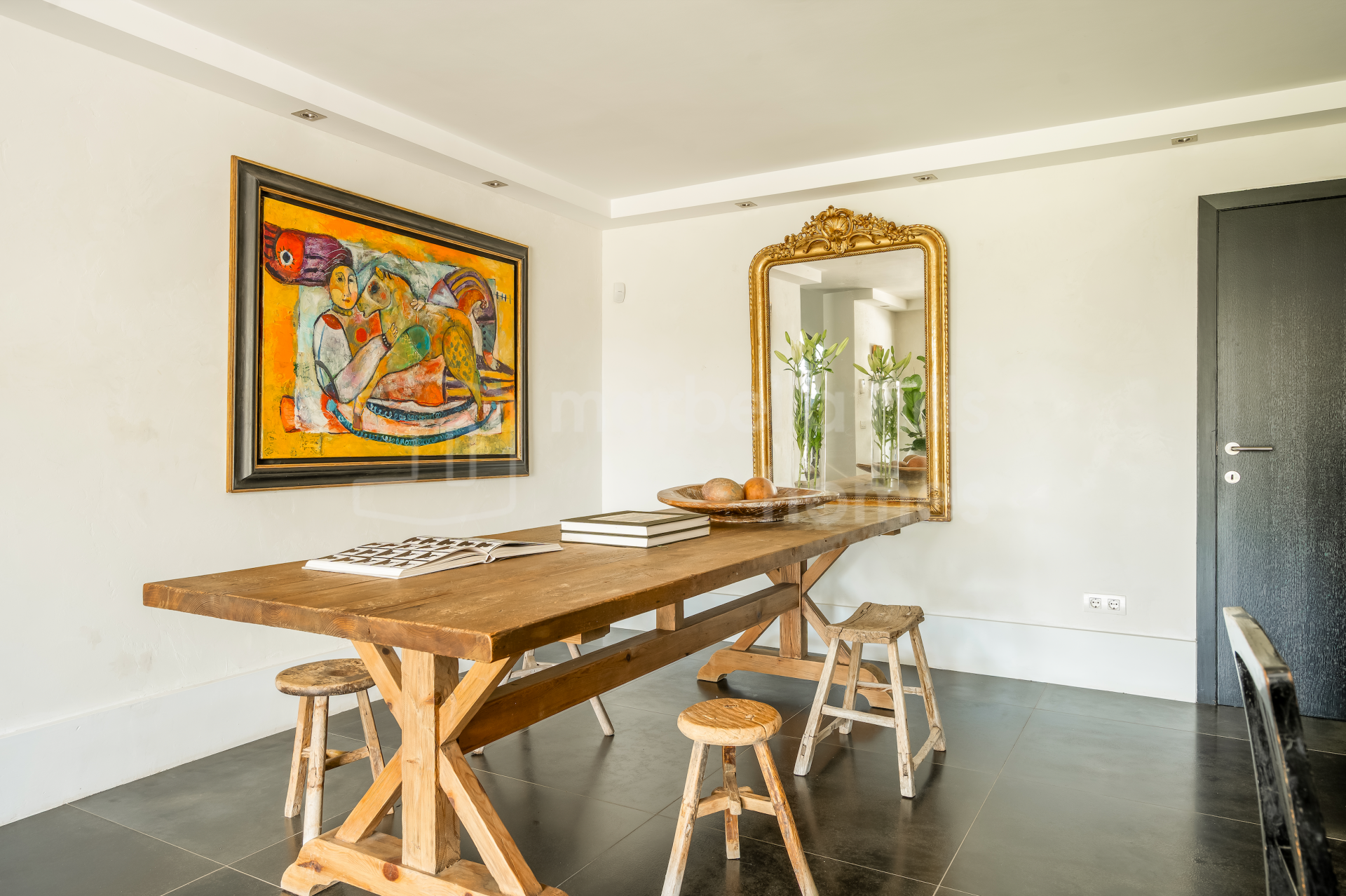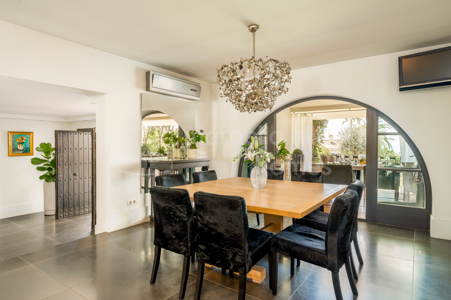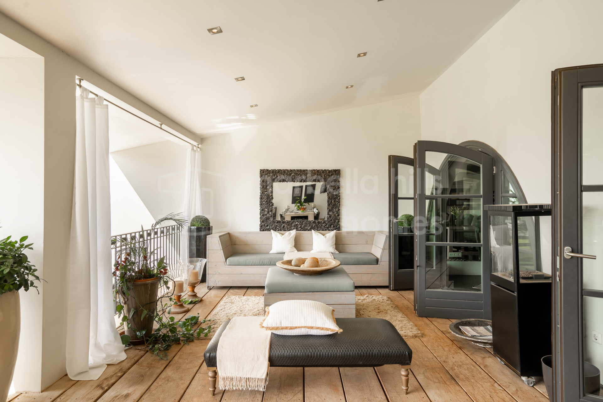 Die Wohnbereiche sind hell und einladend gestaltet. Großzügige Wohn- und Essbereiche werden durch zwei Kamine ergänzt, darunter ein markanter doppelseitiger Kamin. Hohe, gewölbte Decken mit sichtbaren Holzbalken verleihen dem Haus eine warme und behagliche Atmosphäre. Große Fenster und Türen der renommierten Roman-Clavero-Schreinerei verbinden den Innenbereich nahtlos mit der Hauptterrasse und dem Garten und ermöglichen ein angenehmes Indoor-Outdoor-Wohnen.