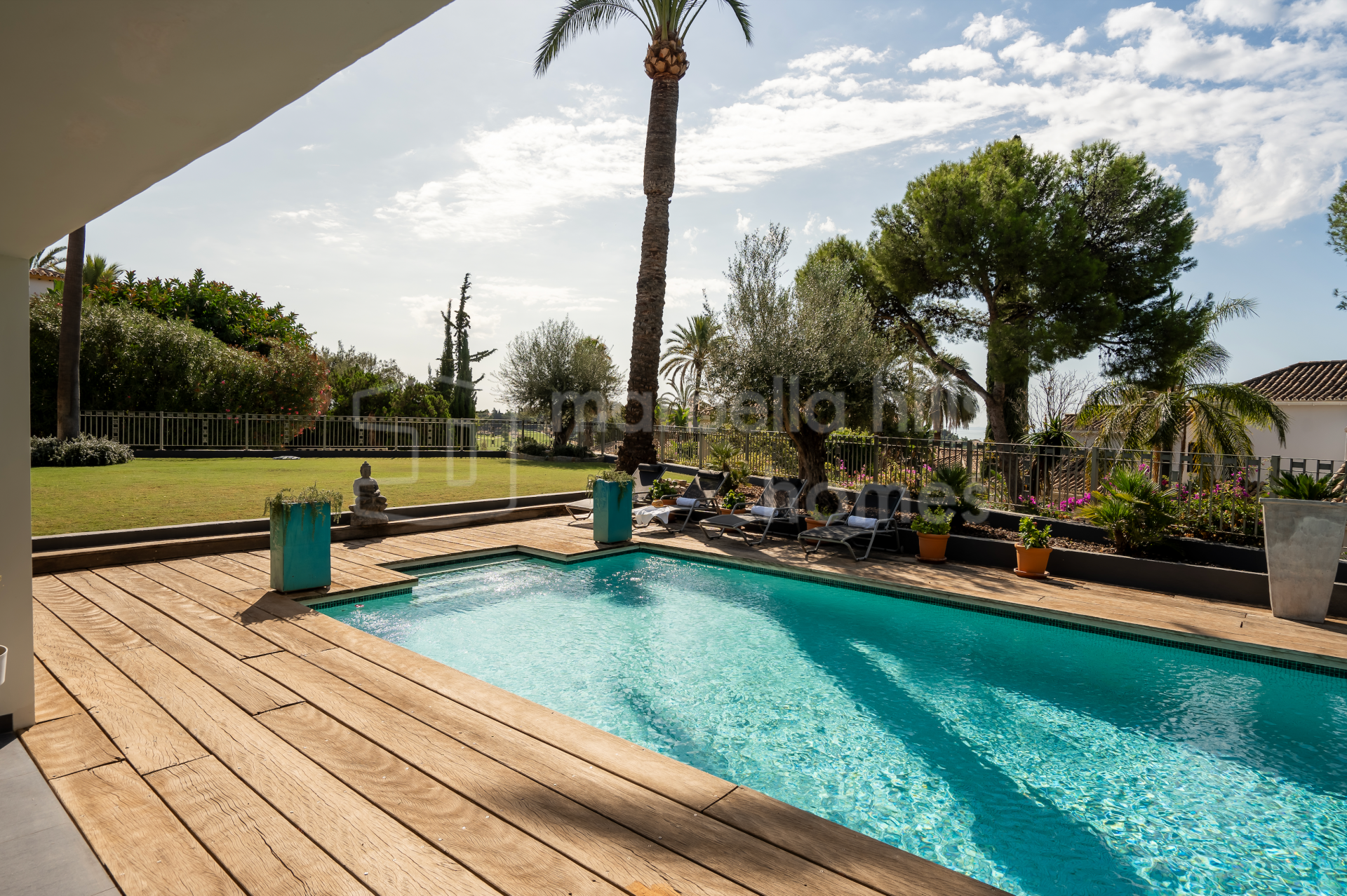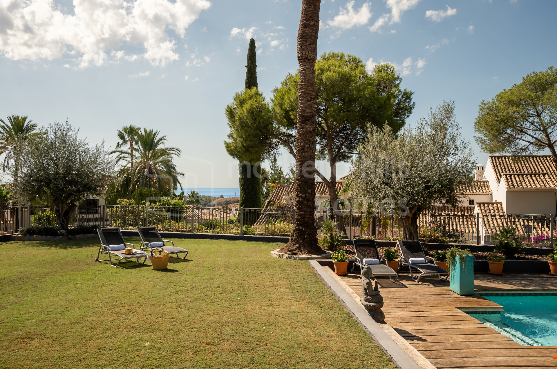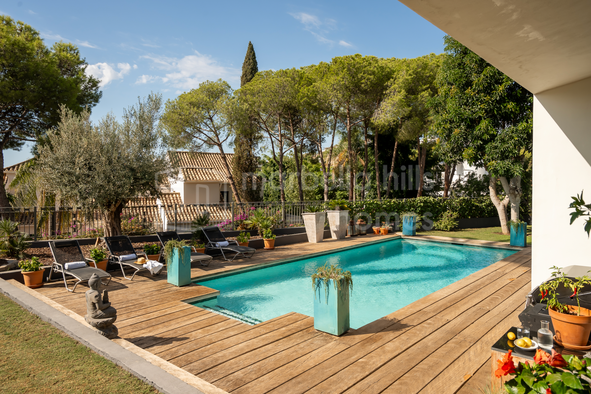 Der Außenbereich wurde so gestaltet, dass er das mediterrane Klima optimal nutzt. Die Villa verfügt über einen privaten Swimmingpool, einen liebevoll angelegten Garten mit Obstbäumen, überdachte Lounge-Bereiche und mehrere Terrassen, die sowohl sonnige als auch schattige Plätze bieten.