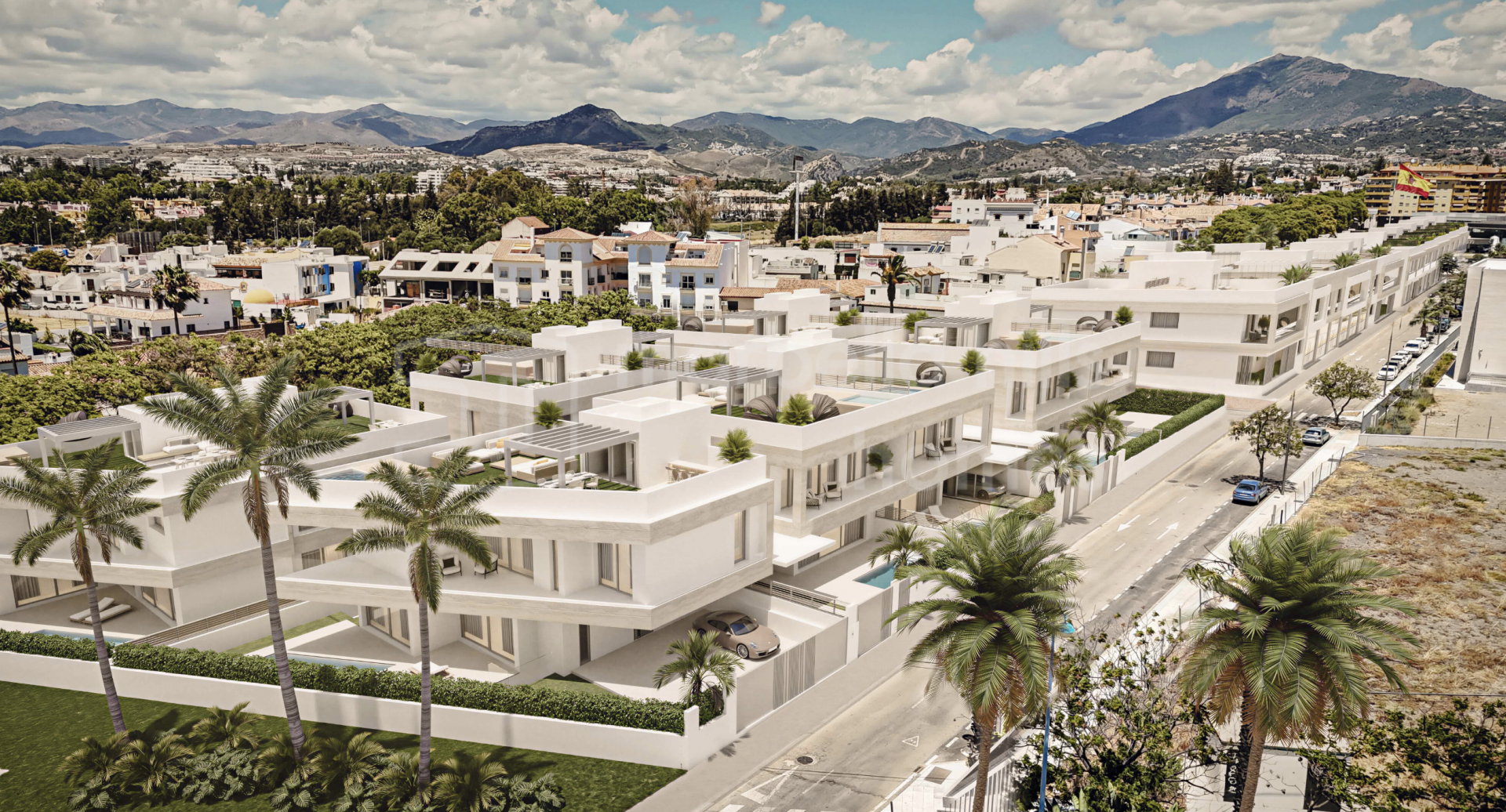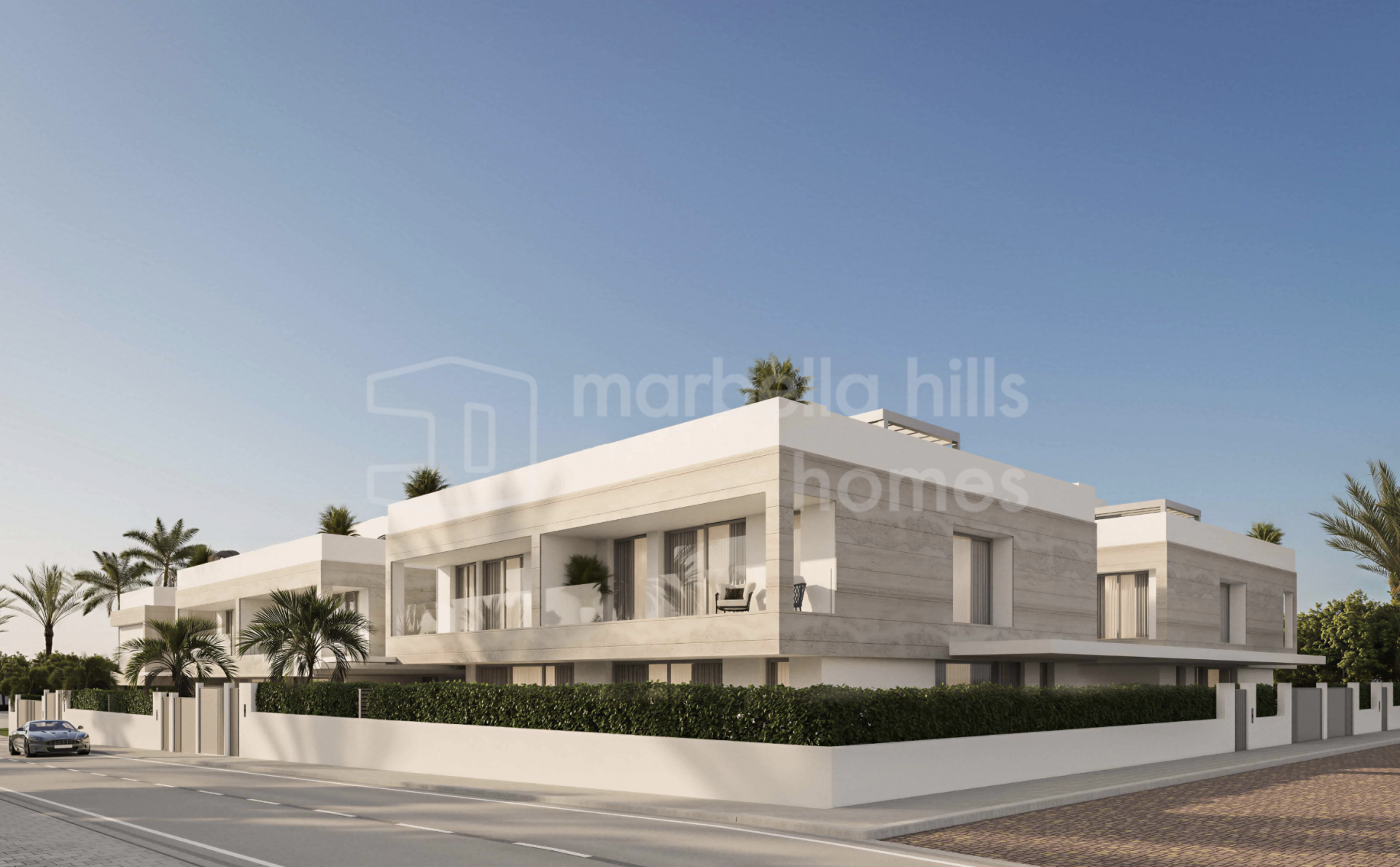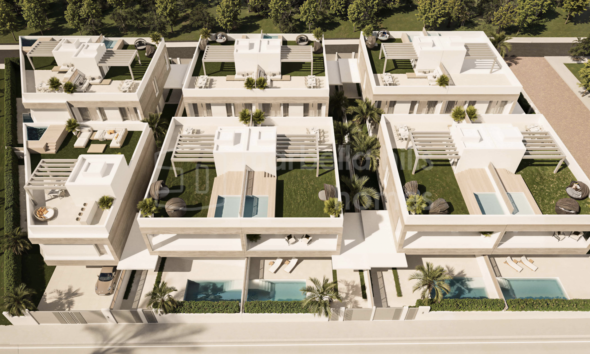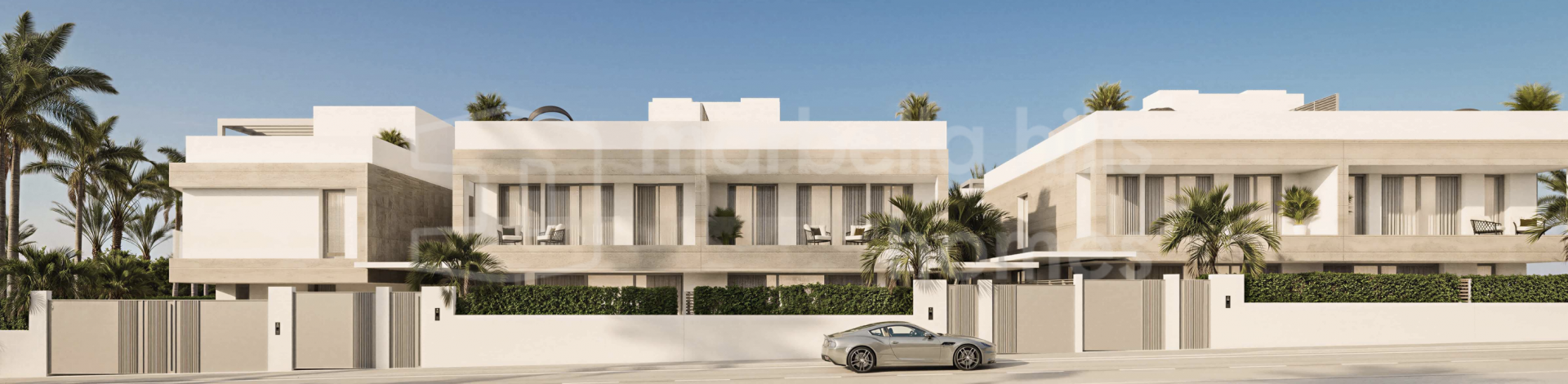 Der Außenbereich bildet einen zentralen Bestandteil des Wohnkonzepts und umfasst private Swimmingpools, großzügige Terrassen sowie Solariums, die das ganze Jahr über zum Entspannen und Genießen des Klimas der Costa del Sol einladen. Tiefgaragenstellplätze für zwei Fahrzeuge bieten zusätzlichen Komfort und Sicherheit, während die Grundstücke ein hohes Maß an Privatsphäre gewährleisten.