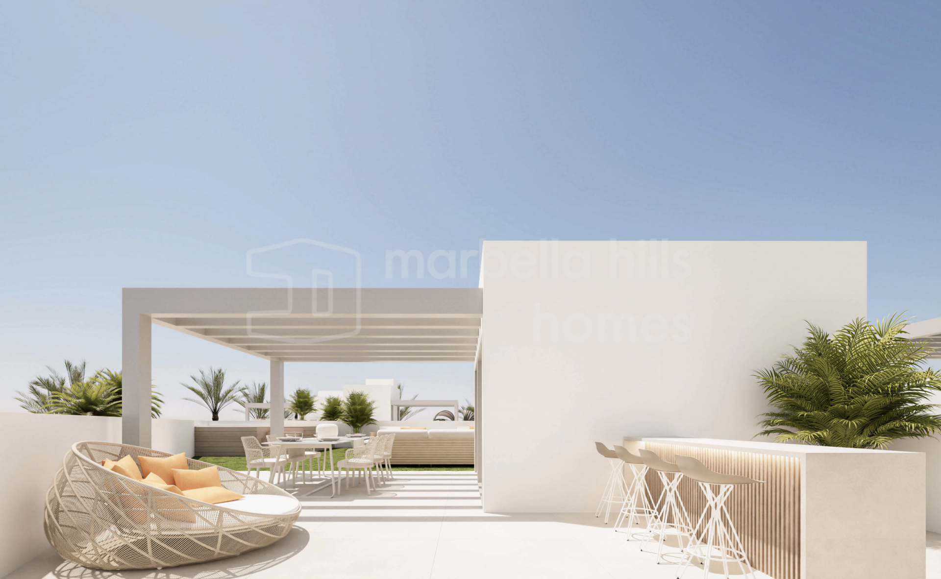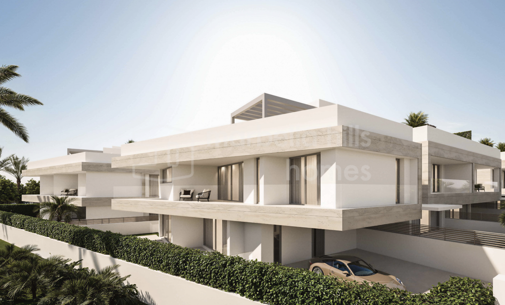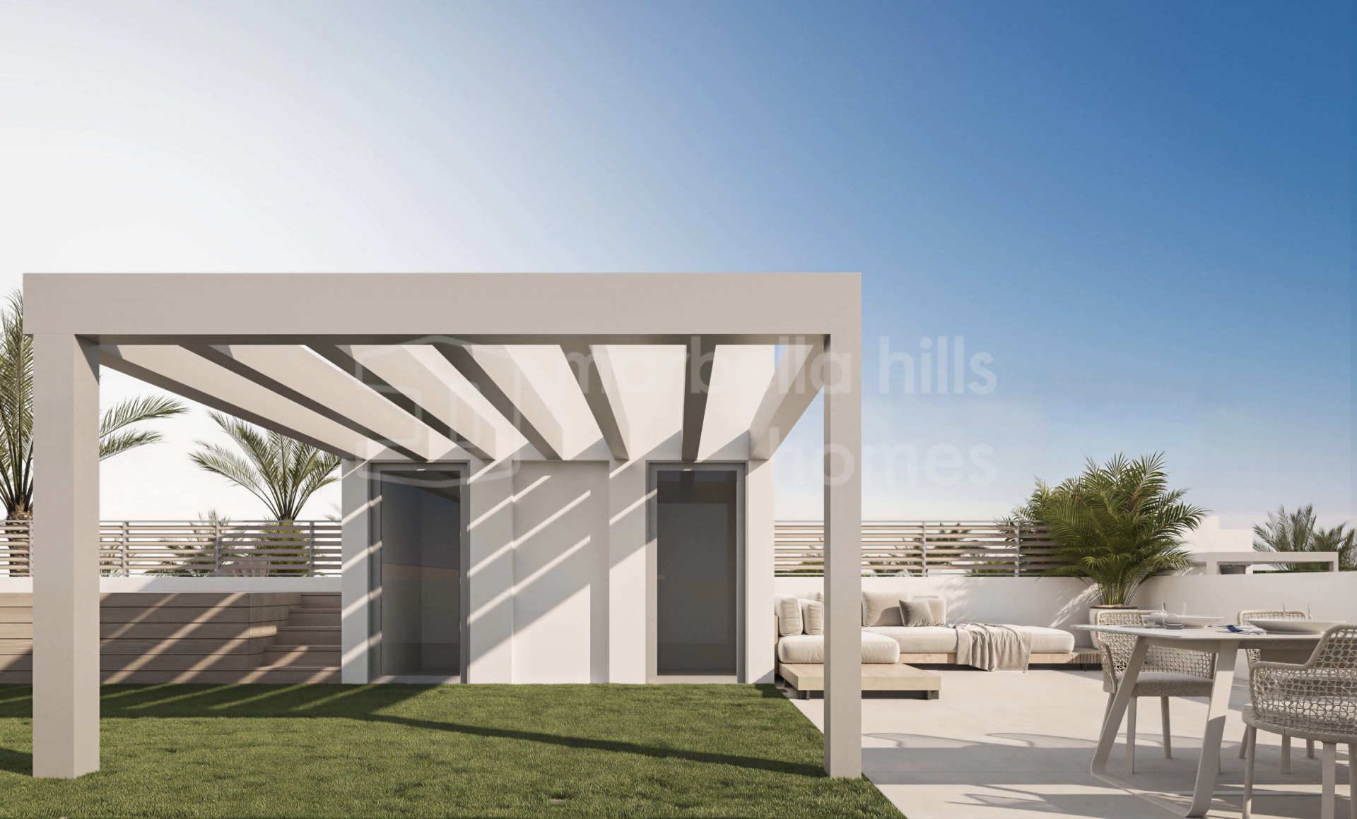 Der Außenbereich bildet einen zentralen Bestandteil des Wohnkonzepts und umfasst private Swimmingpools, großzügige Terrassen sowie Solariums, die das ganze Jahr über zum Entspannen und Genießen des Klimas der Costa del Sol einladen. Tiefgaragenstellplätze für zwei Fahrzeuge bieten zusätzlichen Komfort und Sicherheit, während die Grundstücke ein hohes Maß an Privatsphäre gewährleisten.
