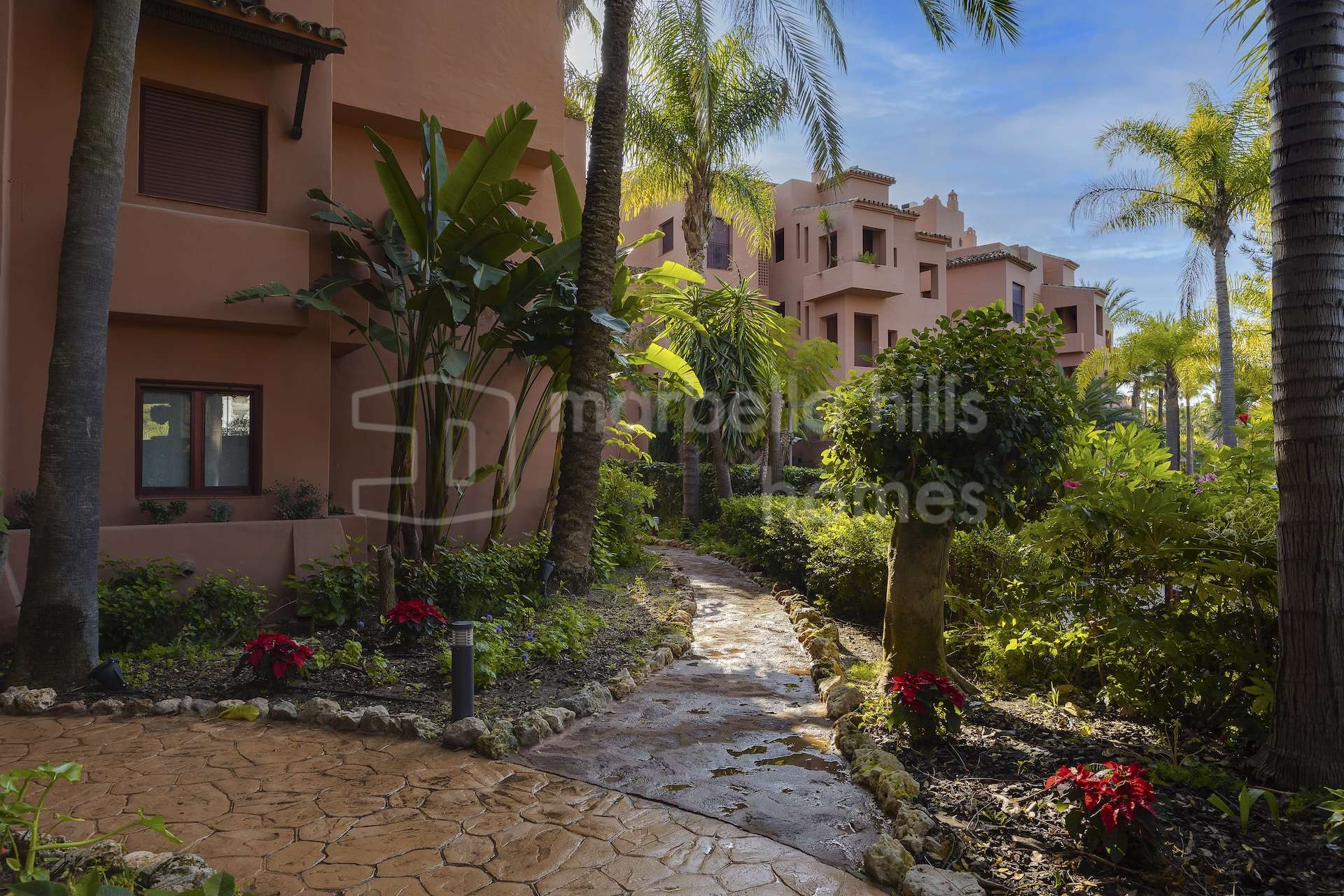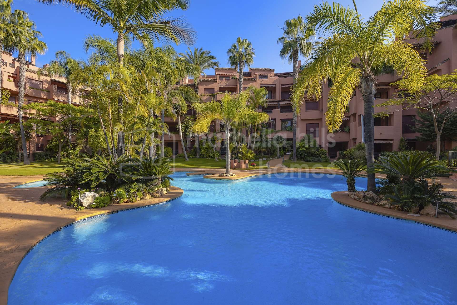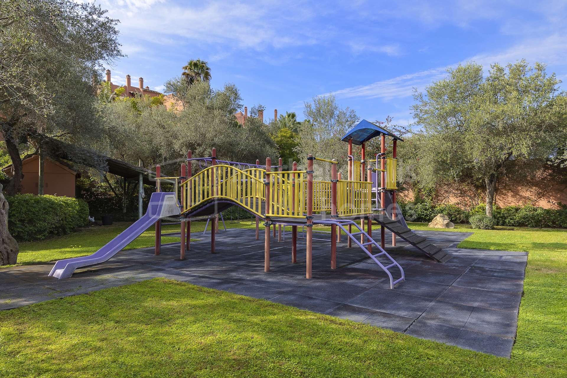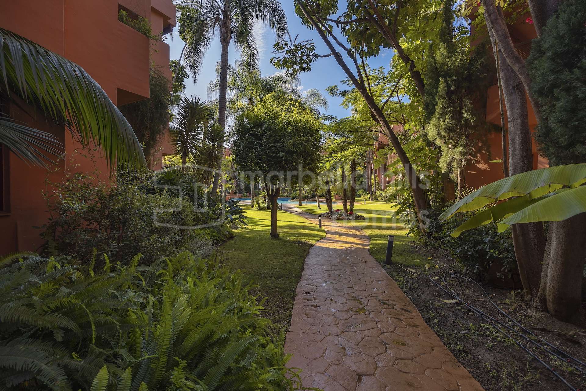 Die Wohnanlage zeichnet sich durch ihre reifen, ganzjährig gepflegten Gärten sowie durch umfassende Gemeinschaftseinrichtungen aus, darunter ein Swimmingpool, Tennis- und Padelplätze, ein Kinderspielbereich und weitläufige Grünflächen. Zudem verfügt die Anlage über einen 24-Stunden-Sicherheitsdienst, Concierge-Service und Videoüberwachung.