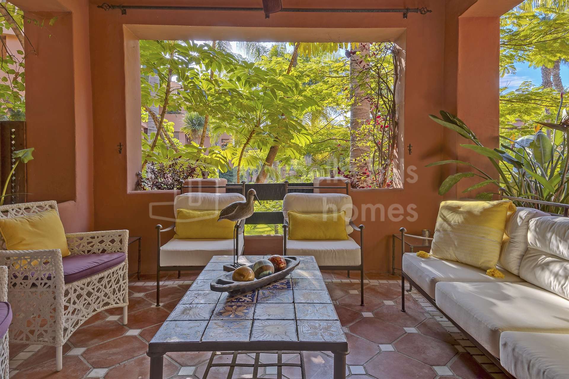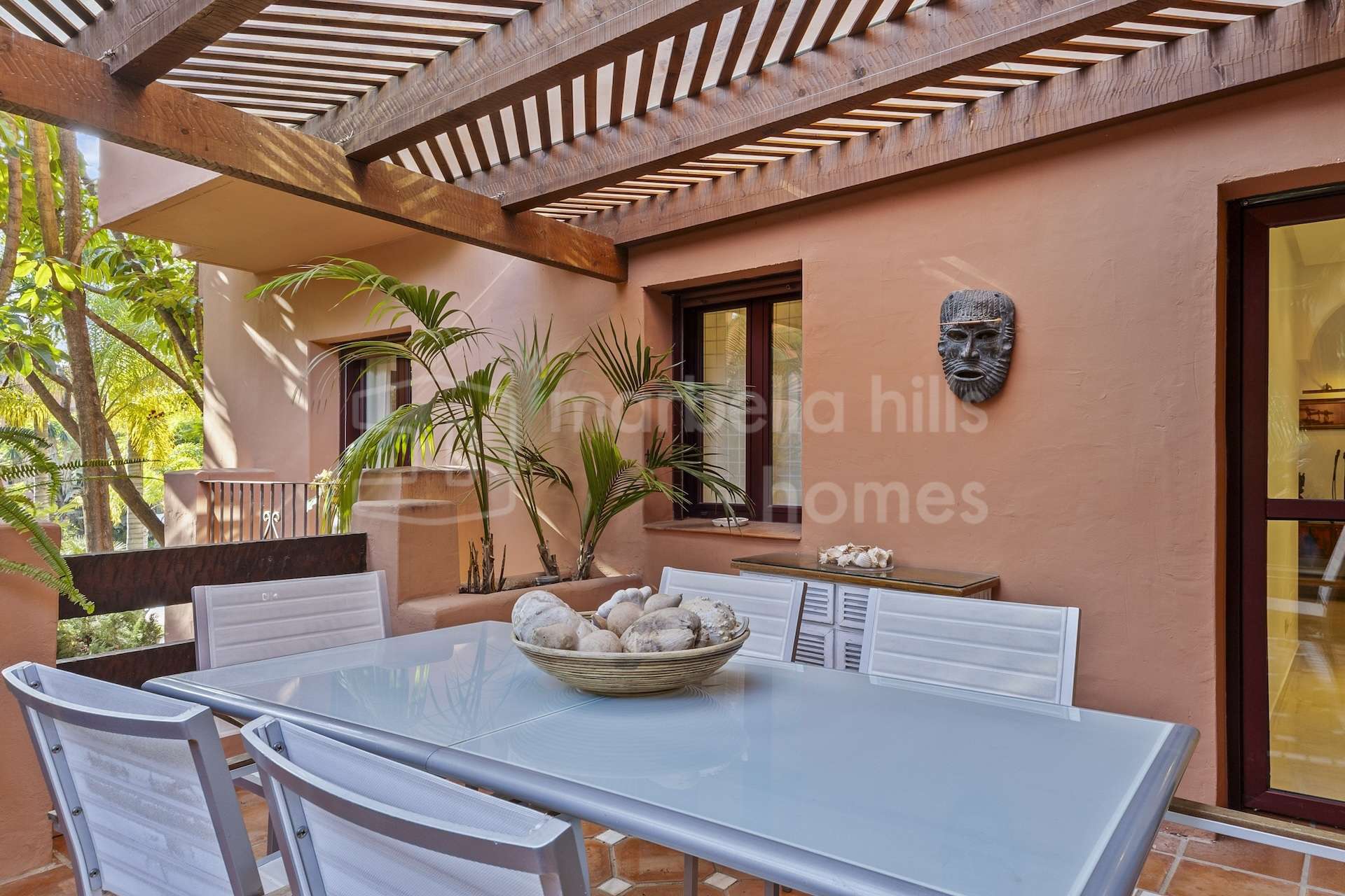 Zwei großzügige Terrassen erweitern den Wohnraum nach außen und bieten angenehme Ausblicke auf die gepflegten Gemeinschaftsgärten. Sie schaffen eine ruhige und private Atmosphäre in unmittelbarer Nähe zum Strand. Die Ausrichtung der Wohnung sorgt für viel natürliches Licht und ein angenehmes mediterranes Wohngefühl.