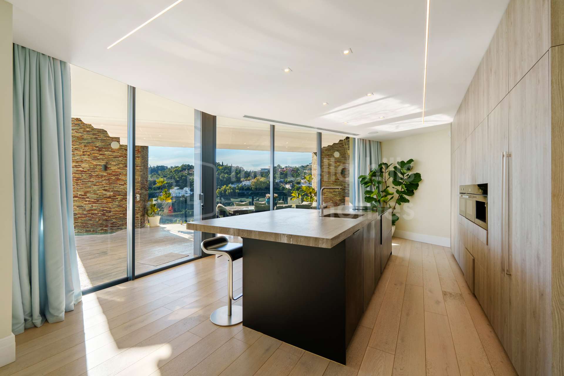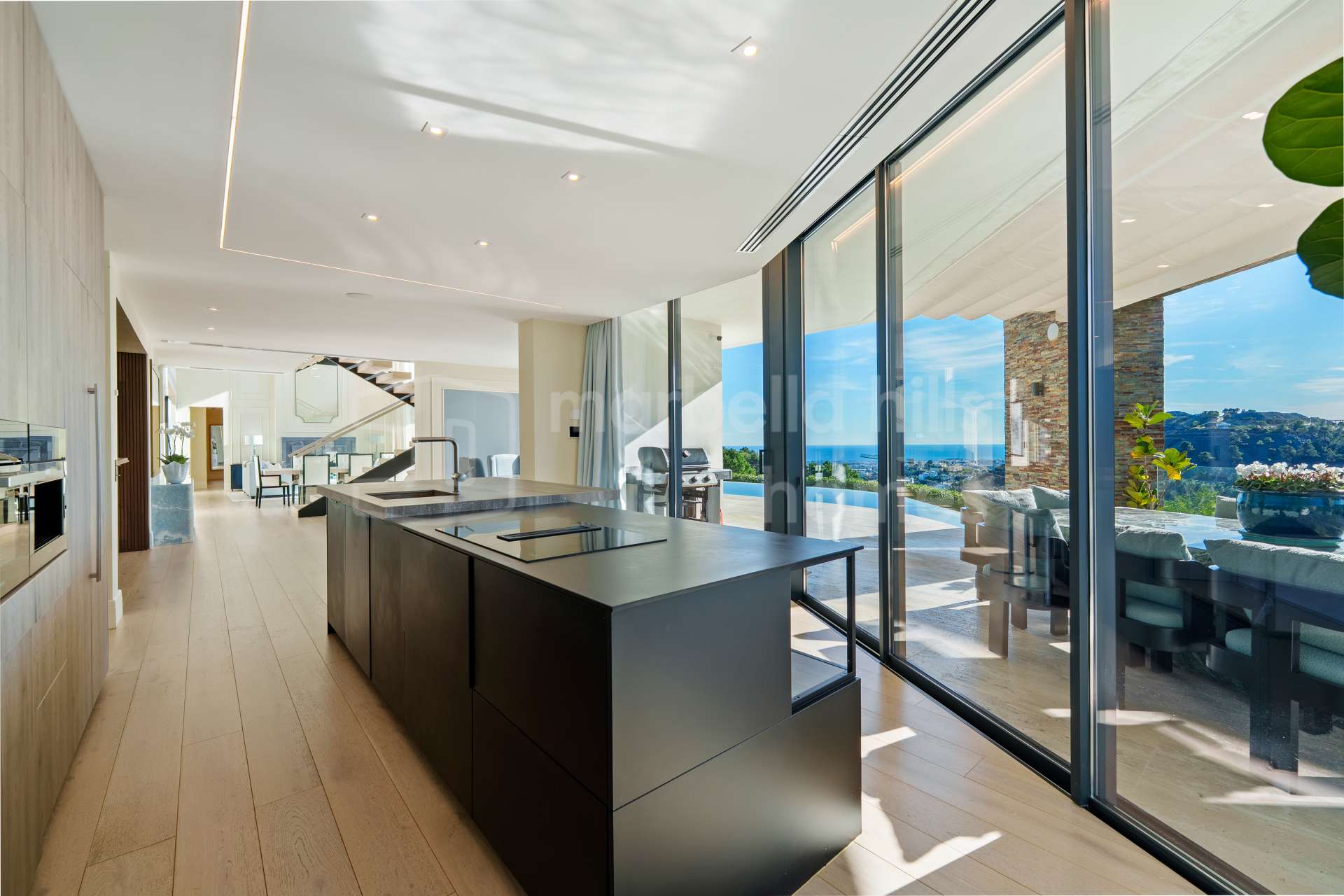 Die moderne Designküche ist vollständig ausgestattet und öffnet sich zum Wohn- und Essbereich, mit direktem Zugang zu den nach Südwesten ausgerichteten Terrassen, die ganztägig Sonne und unvergleichliche Ausblicke bieten.