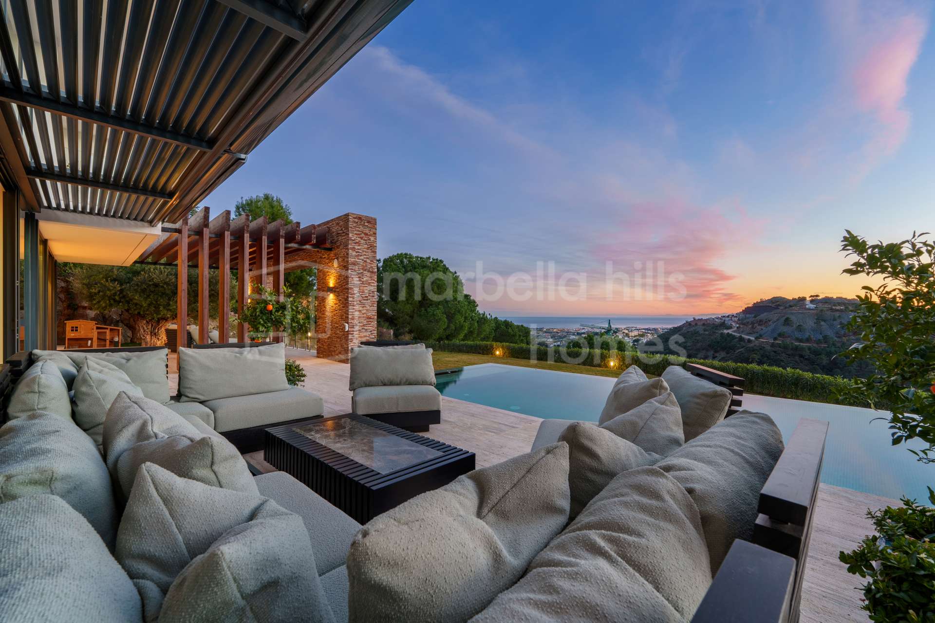 Im Außenbereich erwartet Sie ein spektakulärer Infinity-Pool mit Meerblick, großzügige Terrassenflächen, überdachte Pergolen sowie gepflegte Gartenanlagen, die Privatsphäre und offene Sichtachsen perfekt kombinieren. Eine repräsentative Zufahrt führt zur privaten Garage und sorgt für eine diskrete und komfortable Ankunft.