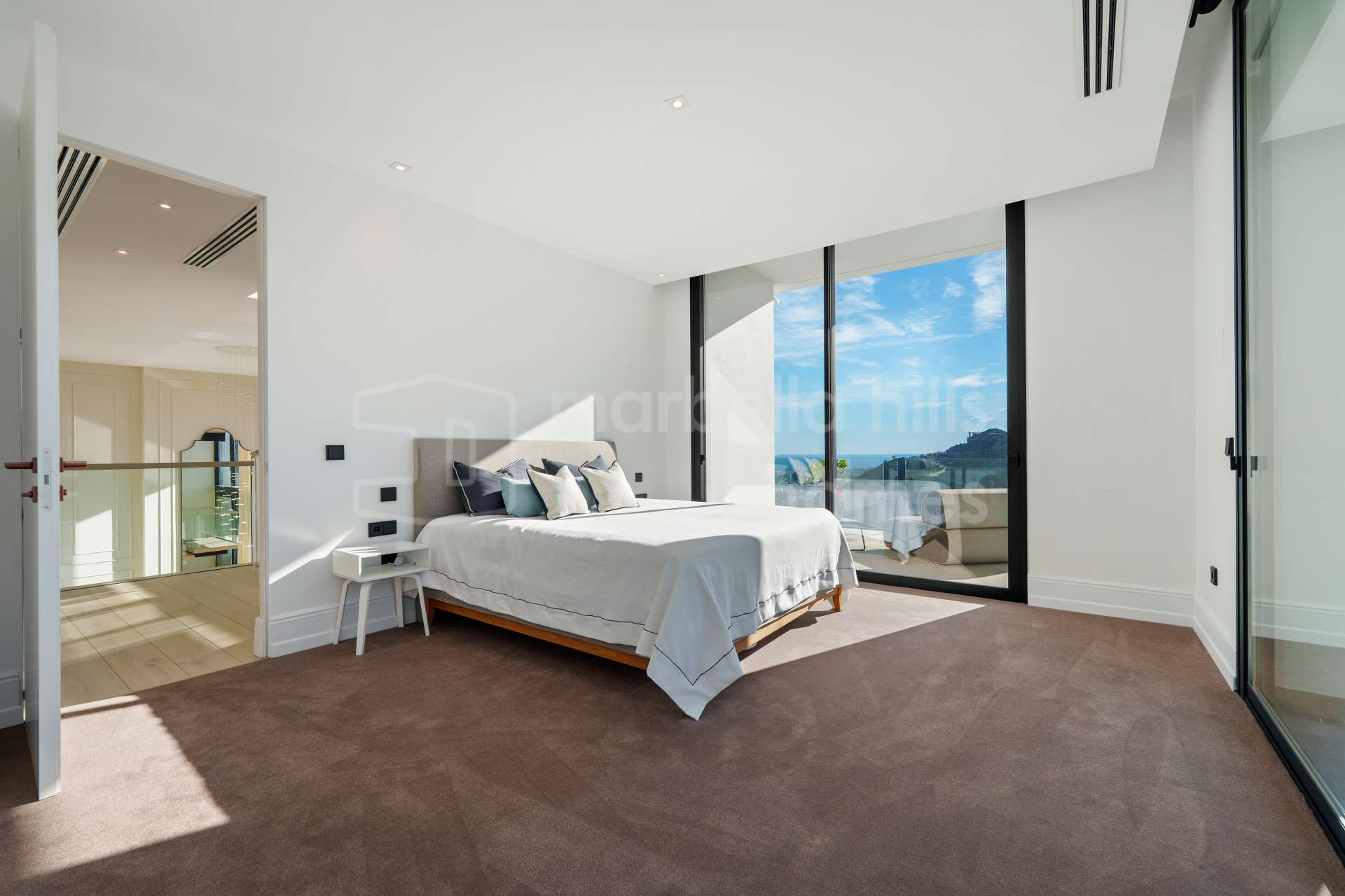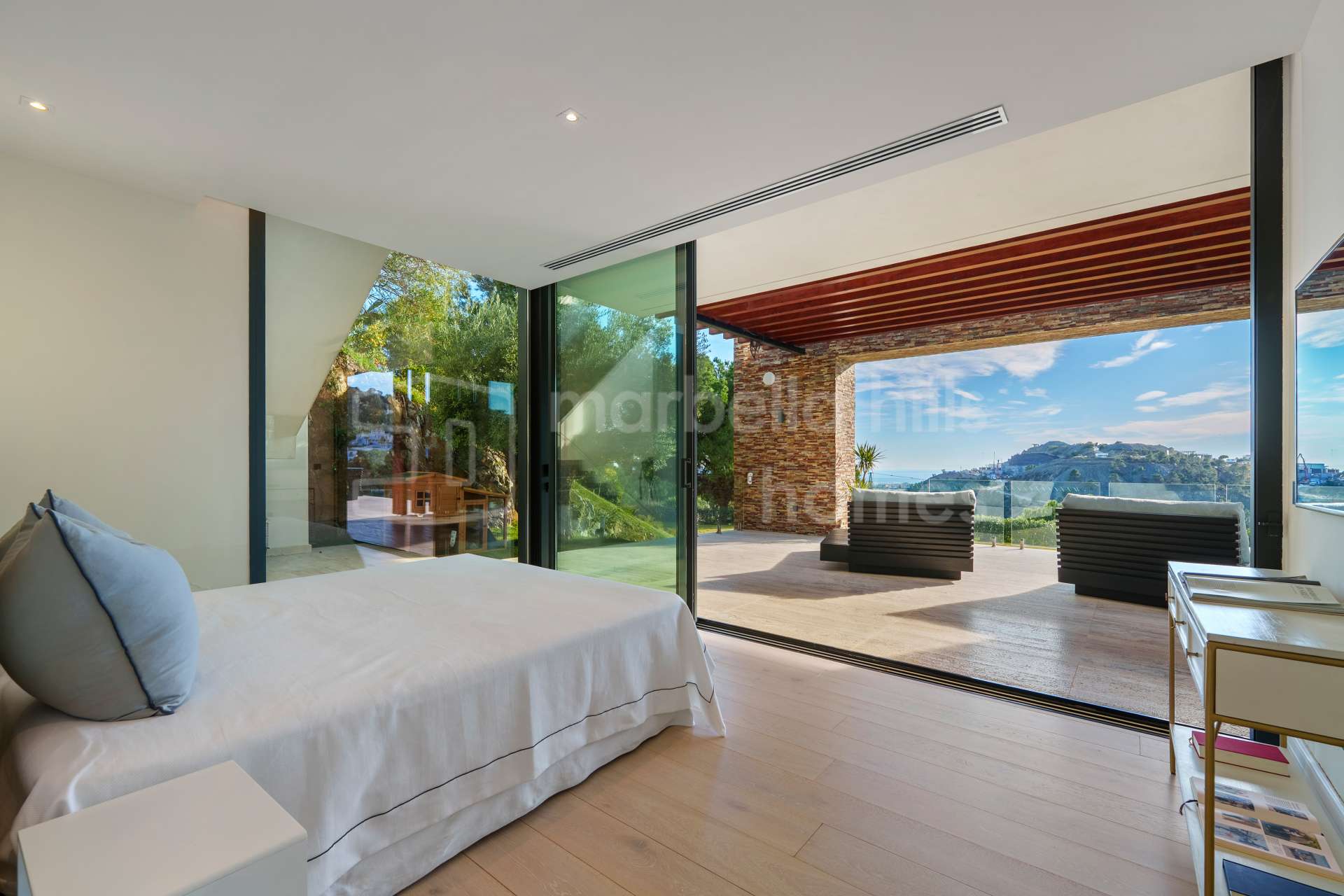 Die Immobilie verfügt über fünf großzügige Schlafzimmer und fünf Badezimmer, die jeweils individuell gestaltet sind und dennoch ein harmonisches, modernes Gesamtbild vermitteln. Die Master-Suite beeindruckt mit traumhaftem Ausblick, begehbarem Kleiderschrank und luxuriösem Bad en Suite. Hochwertige Materialien wie Naturstein, maßgefertigte Tischlerarbeiten und edle Holzböden unterstreichen den exklusiven Charakter der Villa.