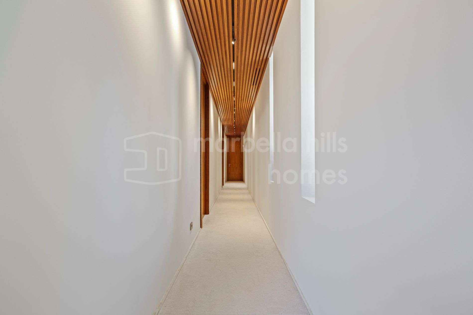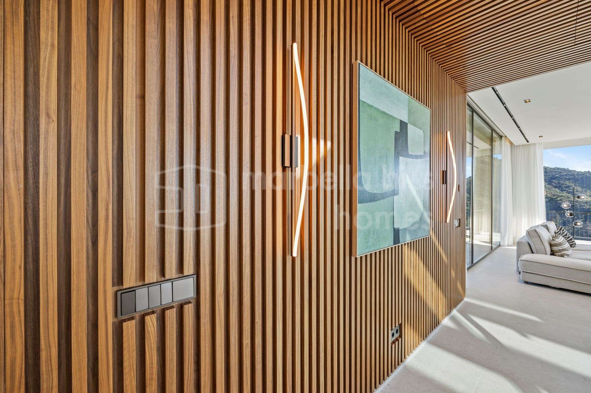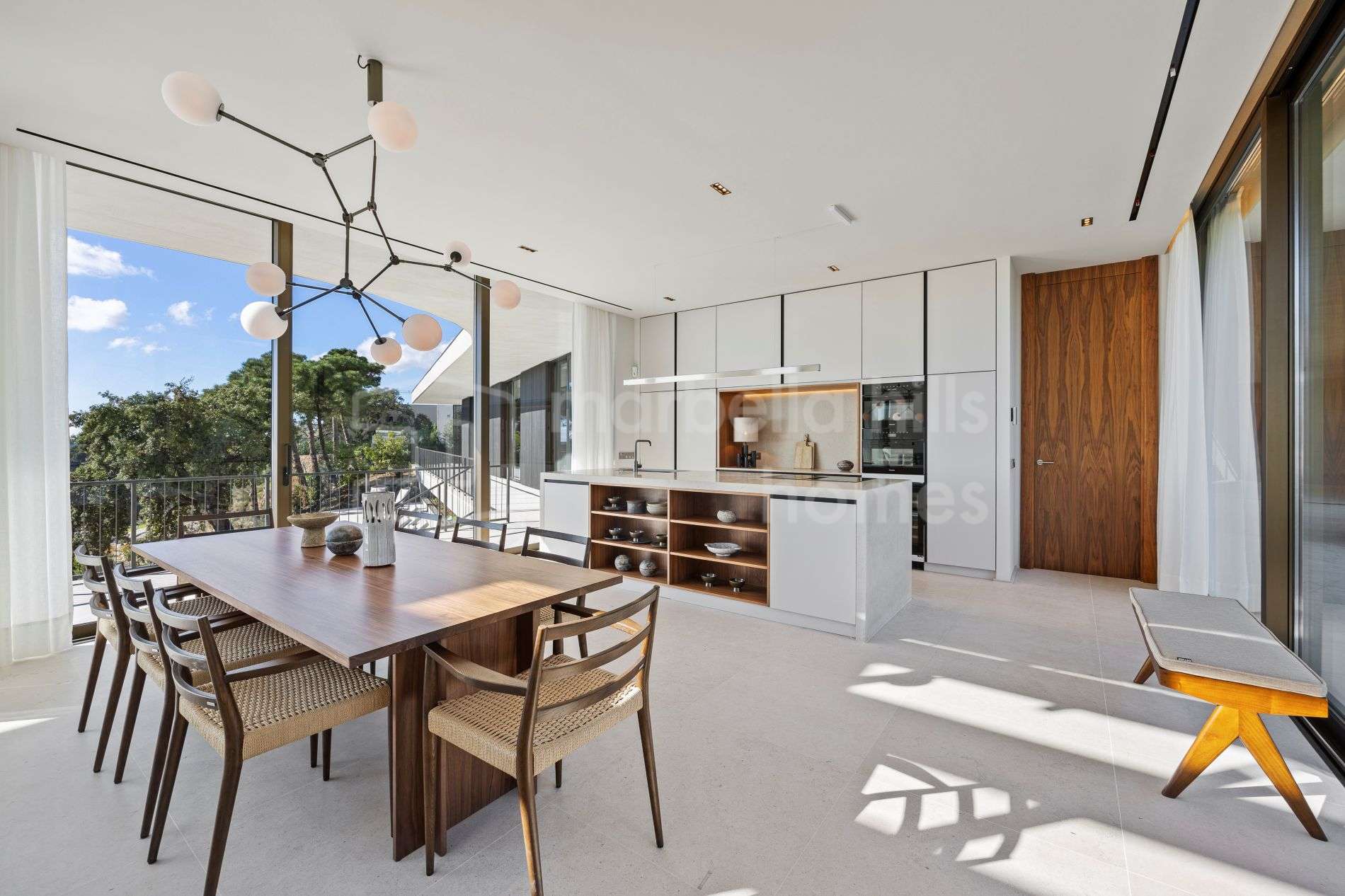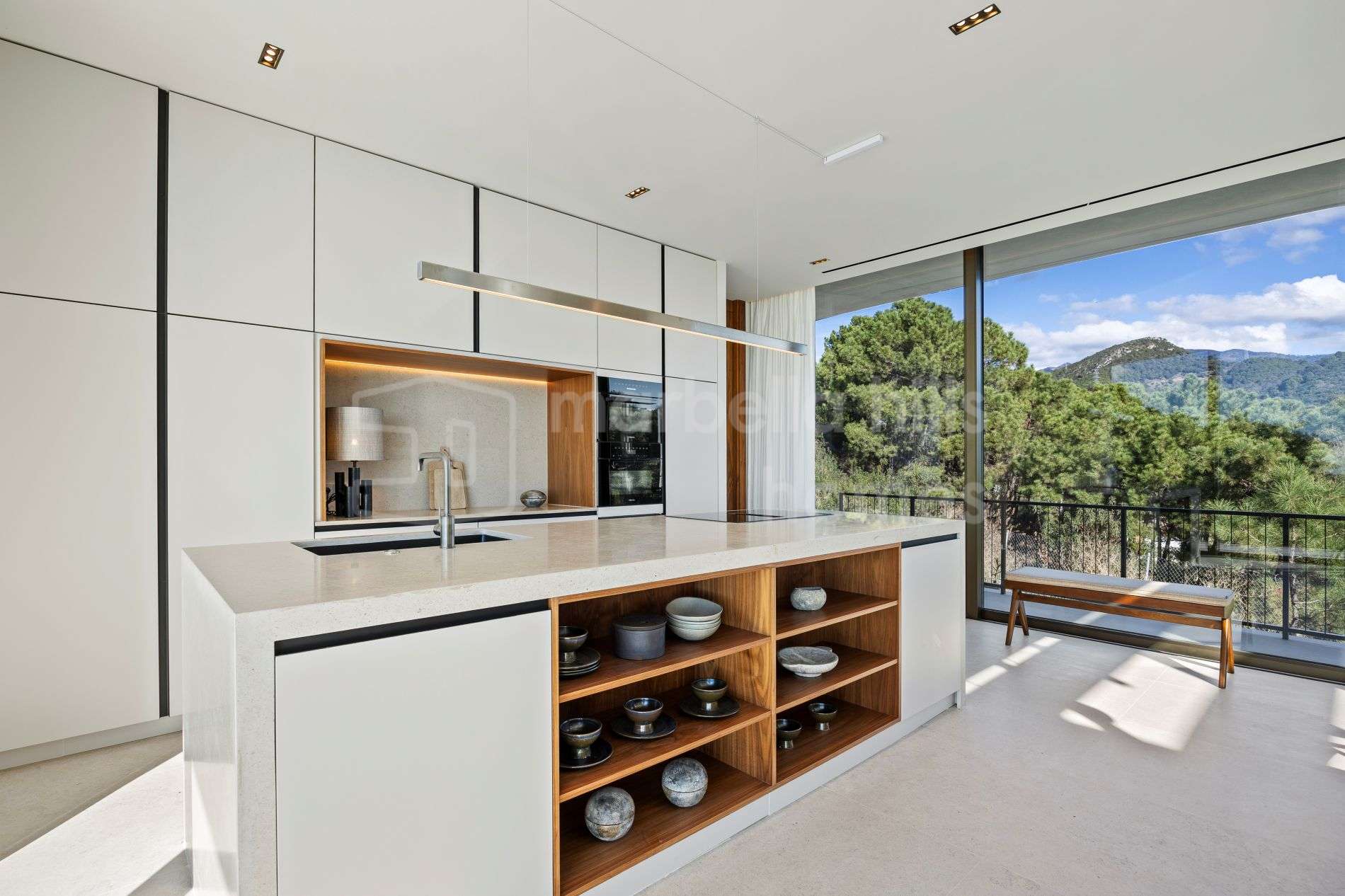 Mit einer bebauten Fläche von 584 m² und 448 m² Terrassen bietet die Immobilie großzügige offene Wohnbereiche mit einem eleganten Wohnzimmer, Essbereich und einer voll ausgestatteten modernen Küche. Das Design verbindet Komfort, Funktionalität und eine klare zeitgemäße Ästhetik und schafft ein stilvolles und zugleich entspanntes Wohnambiente.