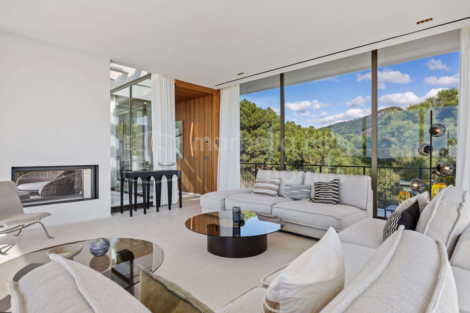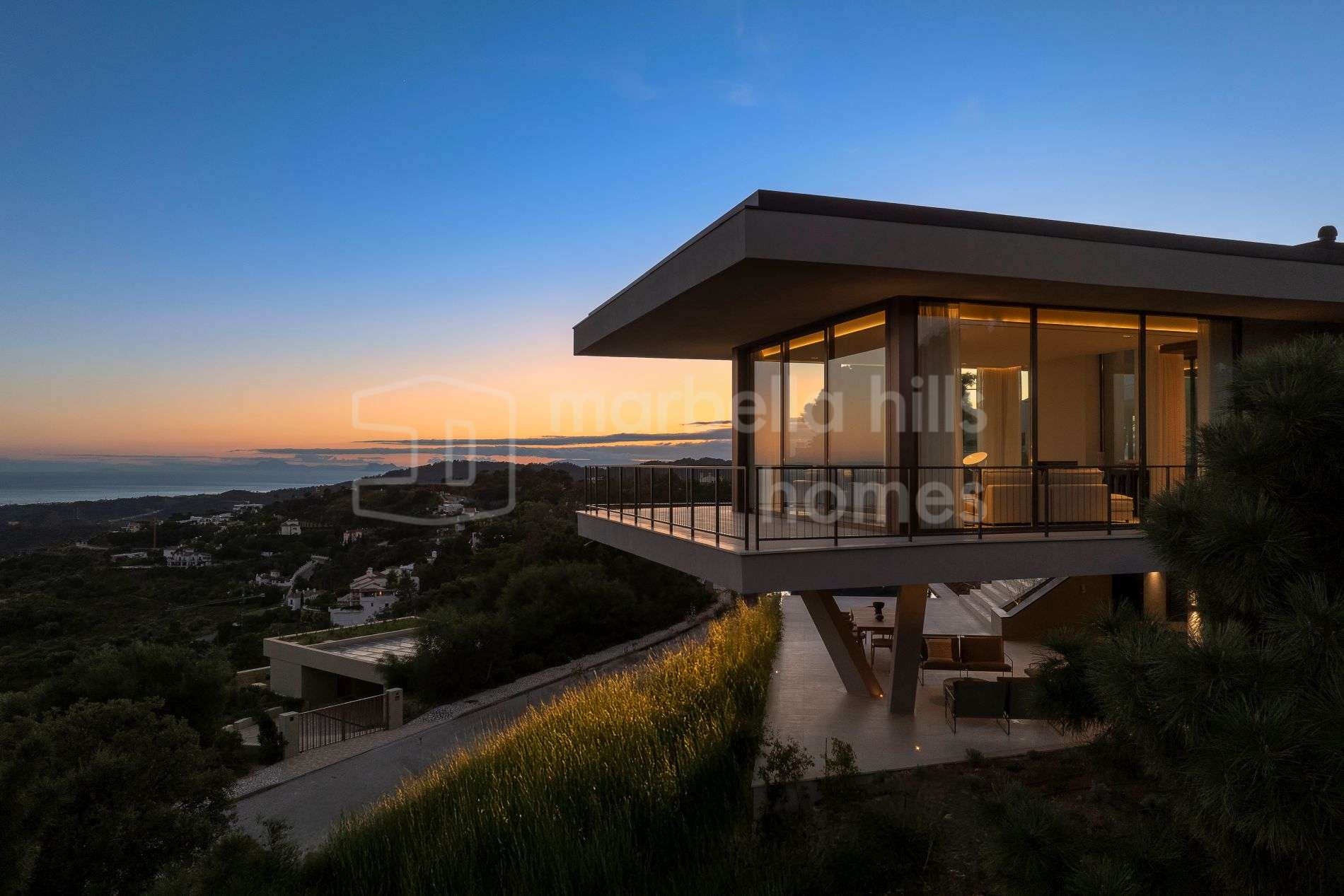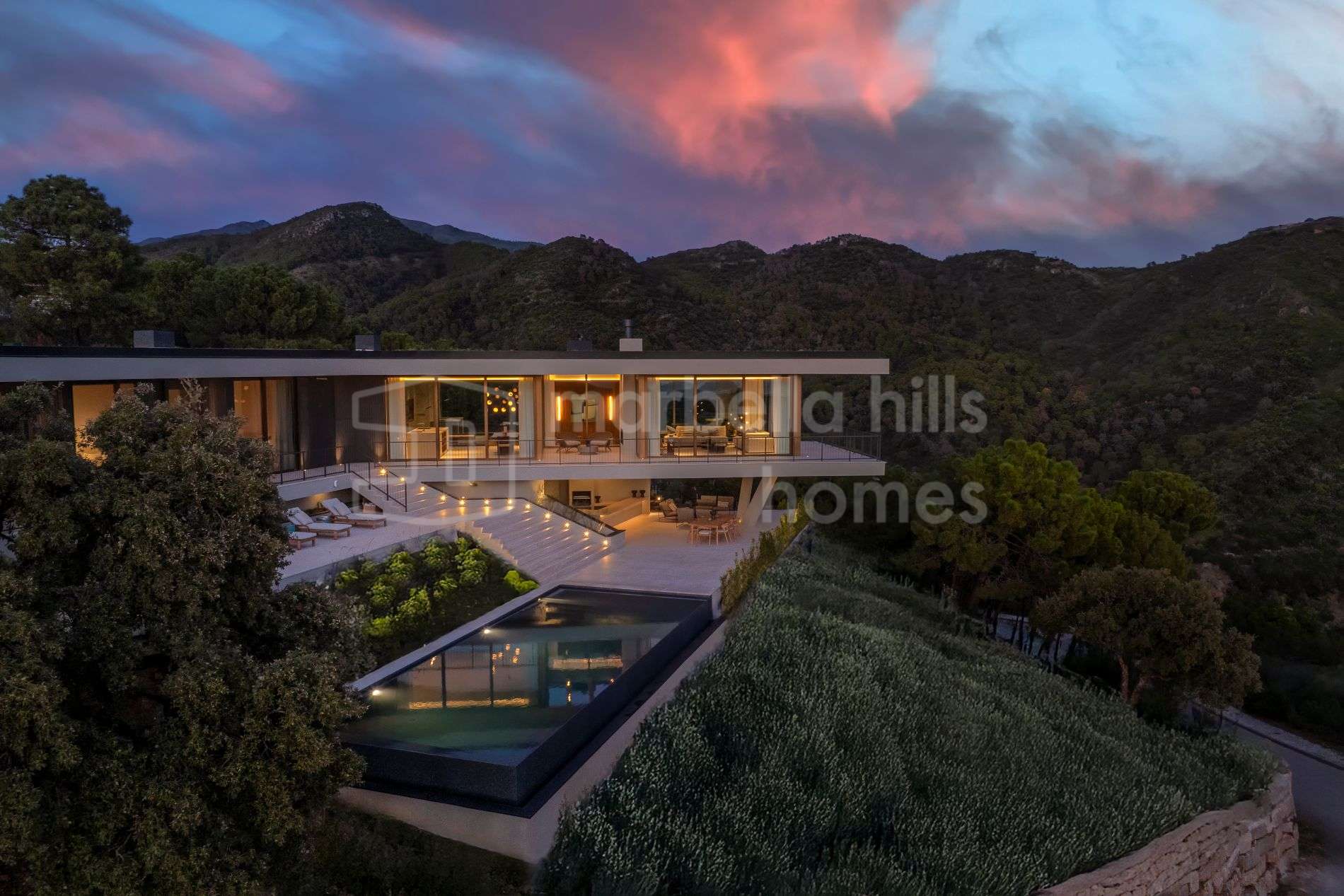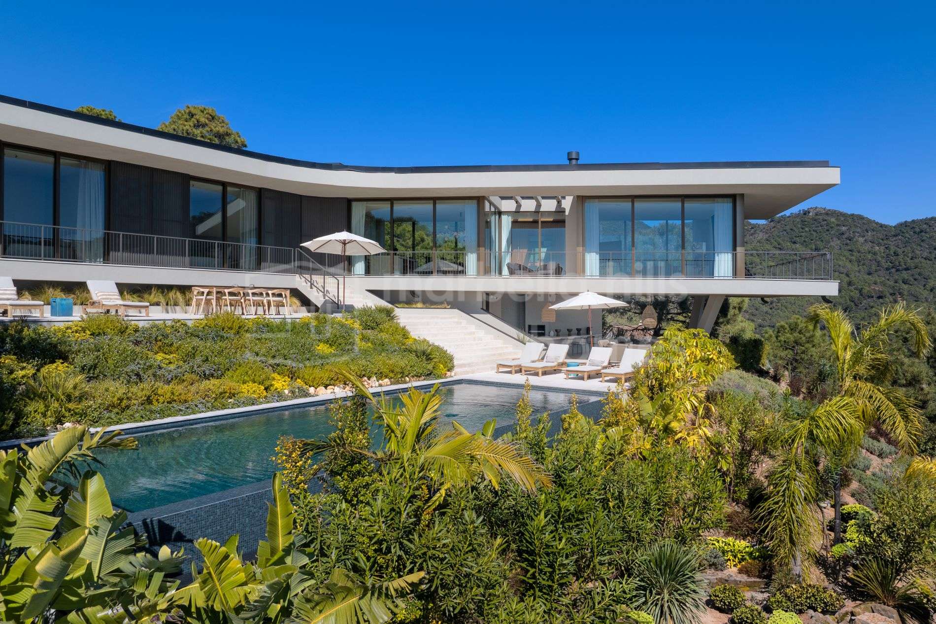 Die Villa überzeugt durch ihr modernes architektonisches Konzept und eine durchdachte Gestaltung, die Innen- und Außenbereiche miteinander verbindet. Große, bodentiefe Fenster lassen viel natürliches Licht herein und eröffnen beeindruckende Ausblicke, während großzügige Terrassen, angelegte Gärten und ein Infinity-Pool eine ideale Umgebung für das Leben im Freien schaffen.