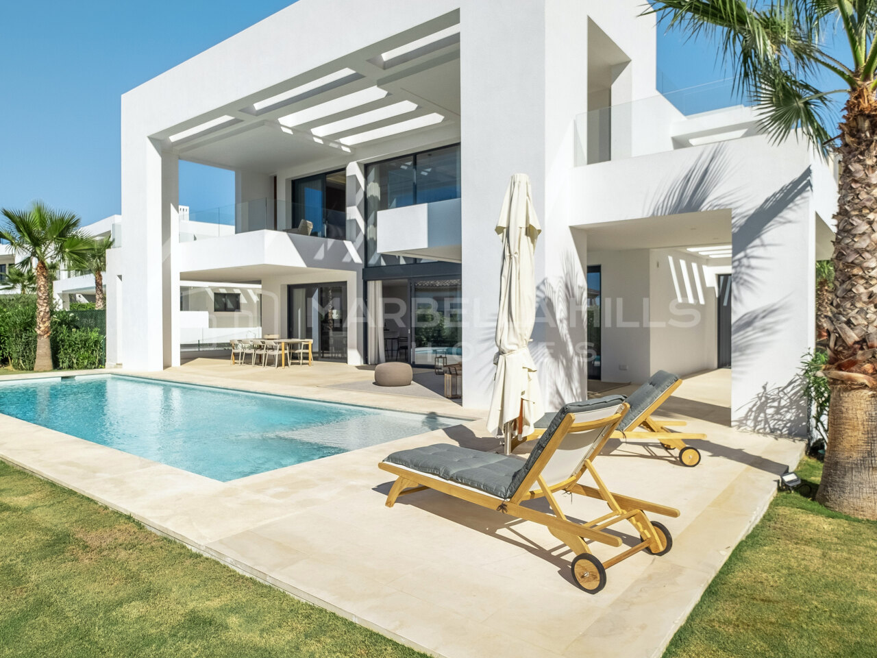 Im Erdgeschoss befindet sich eine schöne Eingangshalle, die zum beeindruckenden Wohn- und Esszimmer mit offener Küche mit Waschküche und Zugang zur Veranda mit schönem Swimmingpool, Gästezimmer oder Büro und Gäste-WC führt. Die erste Etage besteht aus dem Hauptschlafzimmer mit Ankleideraum und Bad auf Anzug und Zugang zu einer großen Terrasse sowie zwei weitere Schlafzimmer und ein zusätzliches Bad.