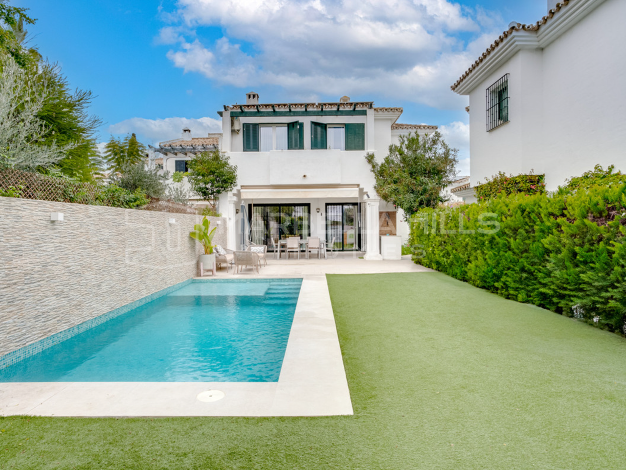 Die geschlossene Wohnanlage bietet gepflegte Gartenanlagen, einen großen Gemeinschaftspool und einen Padelplatz und schafft so ein ruhiges und familienfreundliches Umfeld, nur wenige Minuten von Puerto Banús, der Goldenen Meile von Marbella und Estepona entfernt.