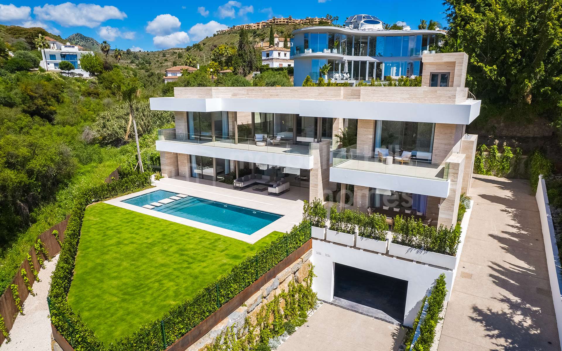 - Newly completed and ready to move in – 5 bedrooms and 6 bathrooms – 919 m² built area on a 1,364 m² plot – 220 m² of terraces and outdoor living spaces – Rooftop solarium with panoramic sea and mountain views – Gym, spa, sauna, and wine cellar – Lift access to all floors – State-of-the-art home automation and underfloor heating – Fireplace, electric blinds, and marble floors – Garage for 3 cars plus covered carport for 2 more – Located in a quiet, secure neighborhood near golf and amenities