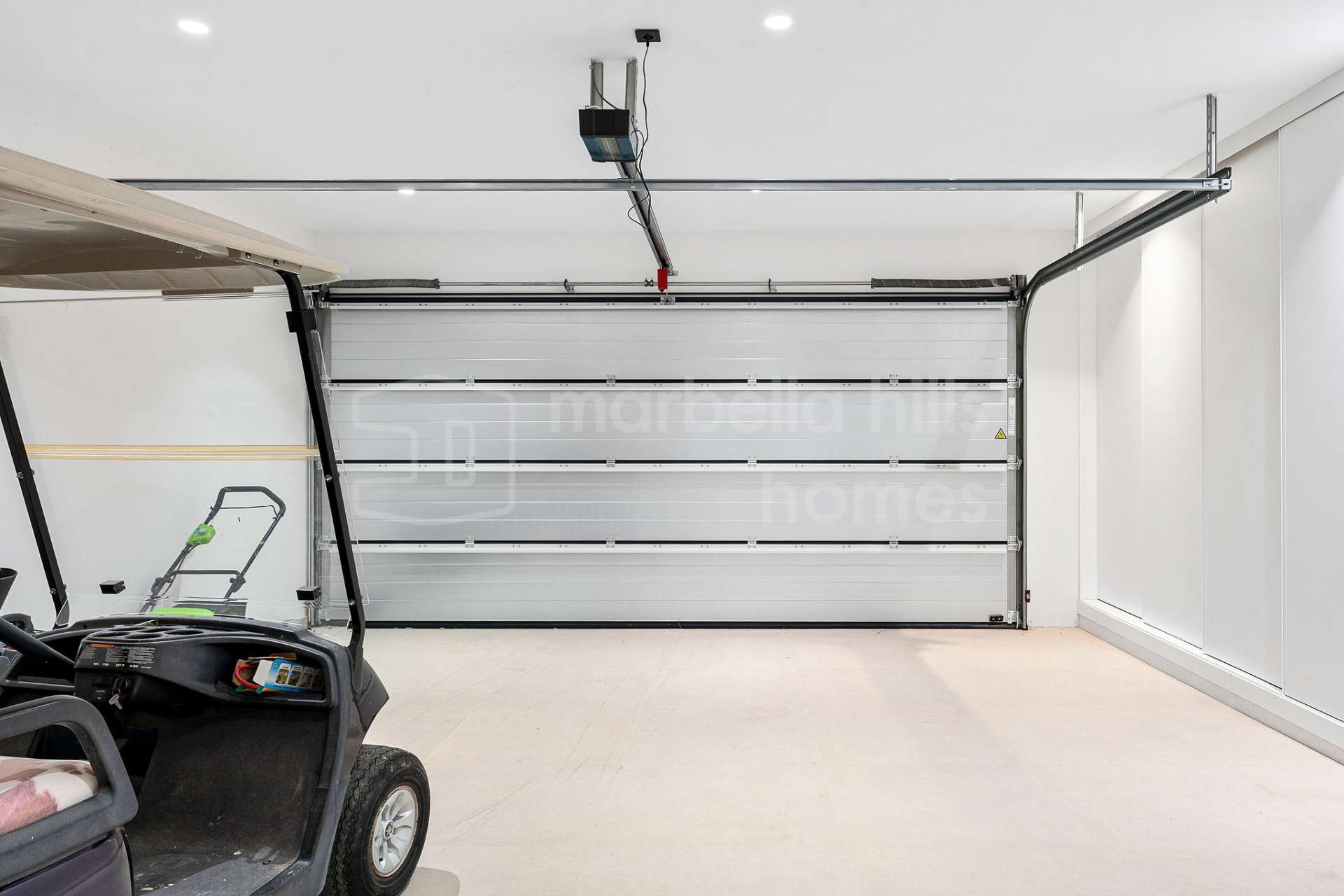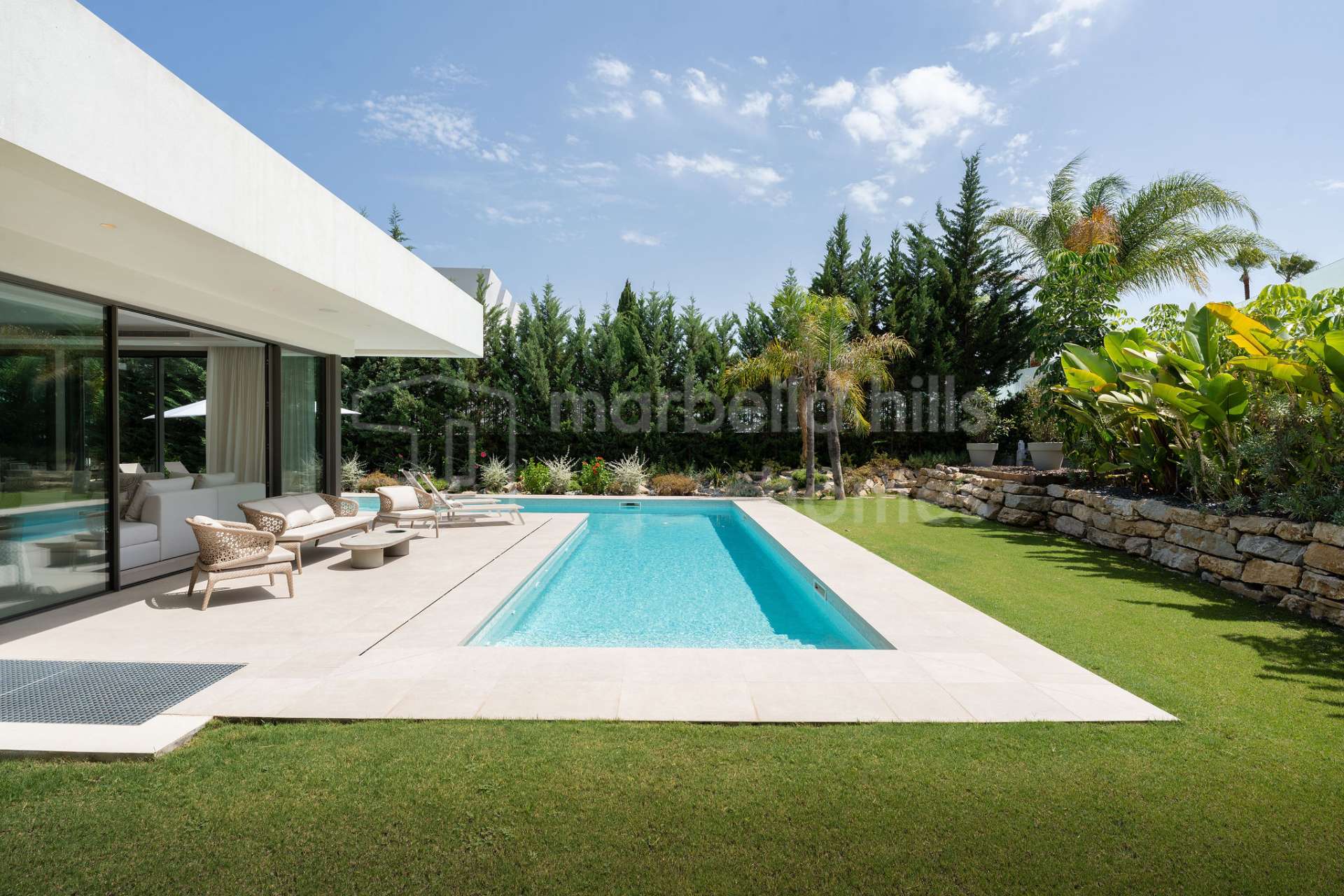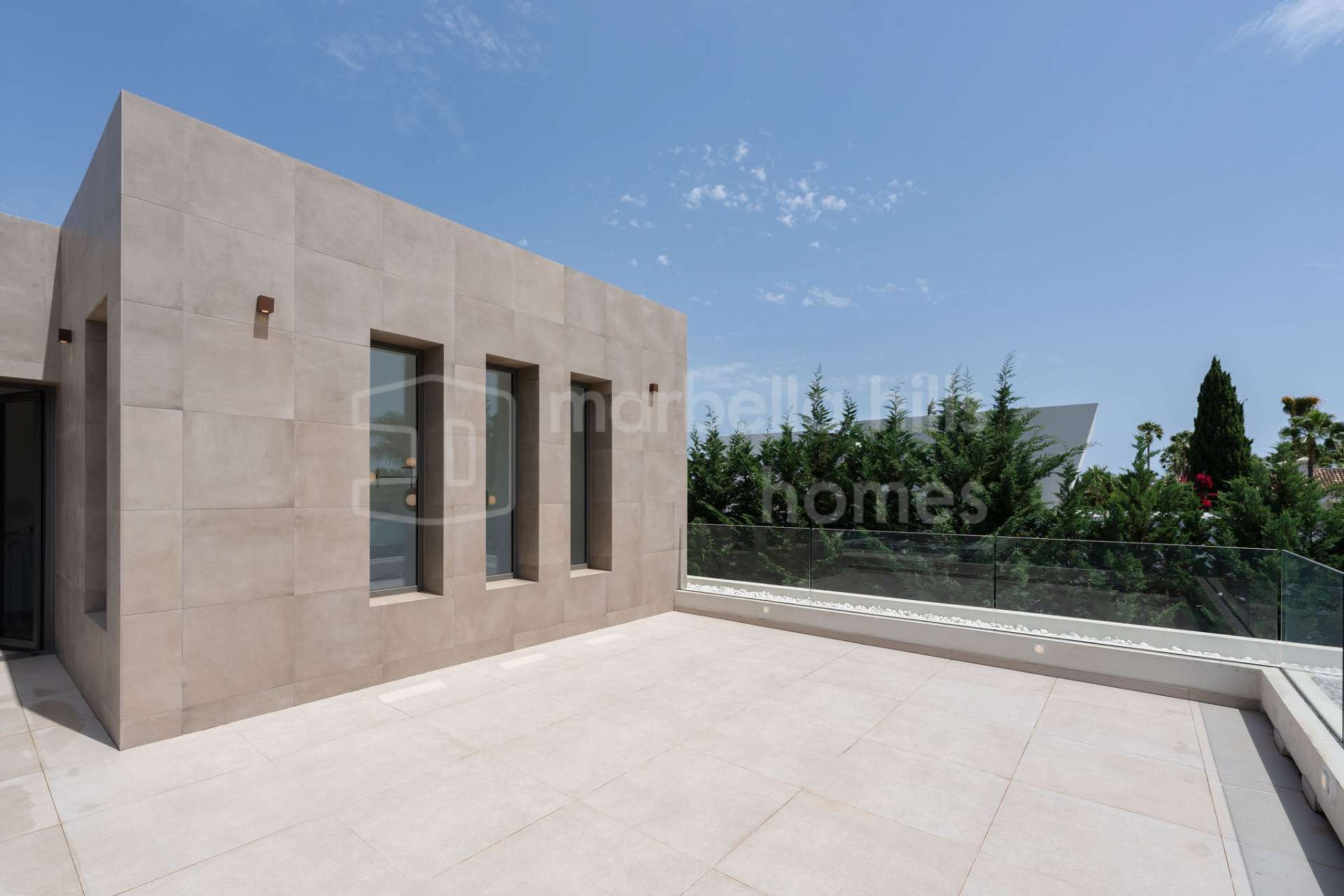 This contemporary Mediterranean villa in the exclusive Haza del Conde area of Nueva Andalucía combines refined architecture, warm elegance, and stunning views across the Golf...