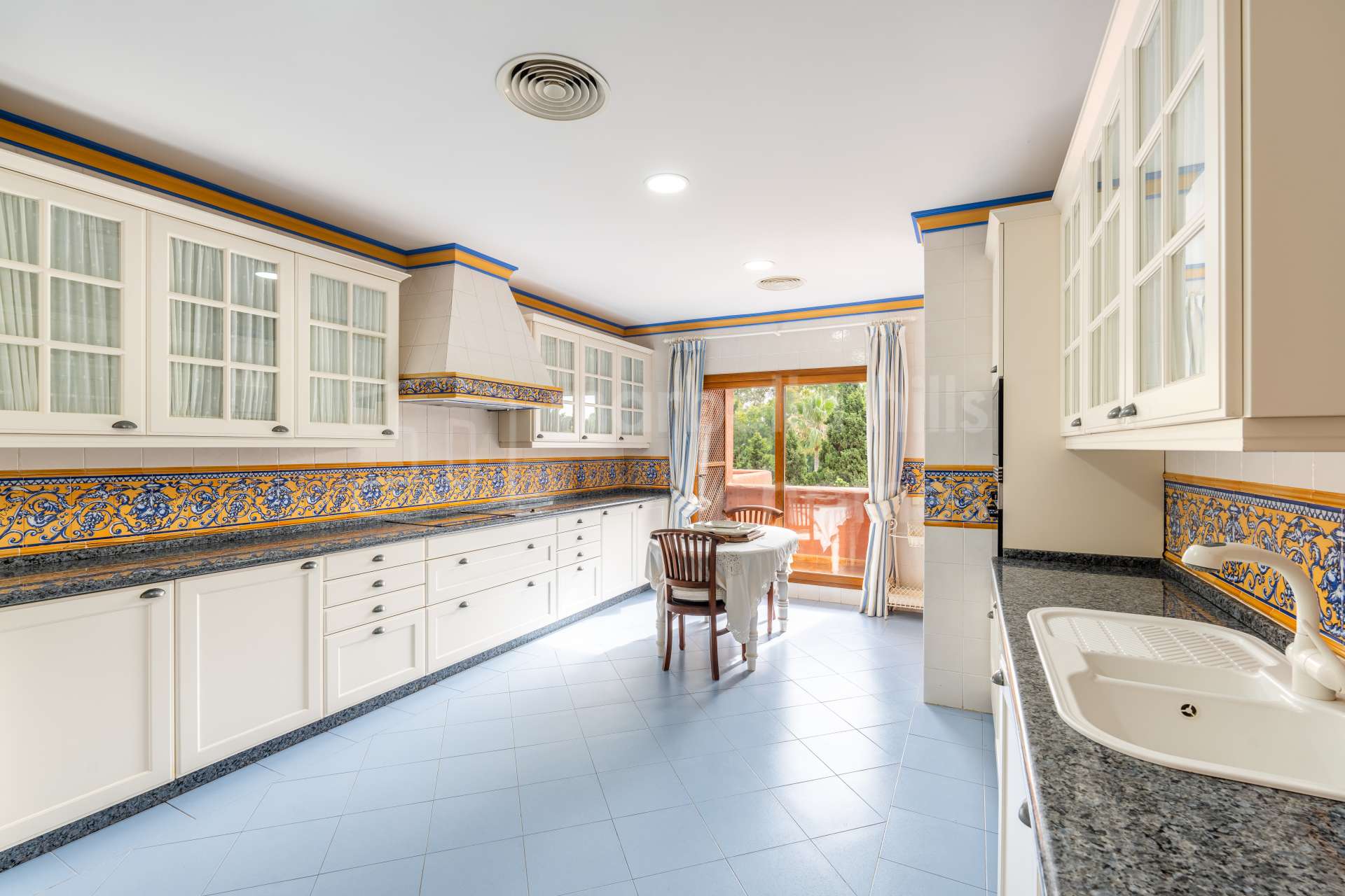The kitchen is spacious, open, and inviting, featuring summery blue floor tiles that feel delightful underfoot, echoing the colors of the backsplash and walls. Ample cupboard and storage space keeps the countertops clutter-free, and high-end appliances are featured throughout. Glass terrace doors provide direct access to the natural green areas beyond.