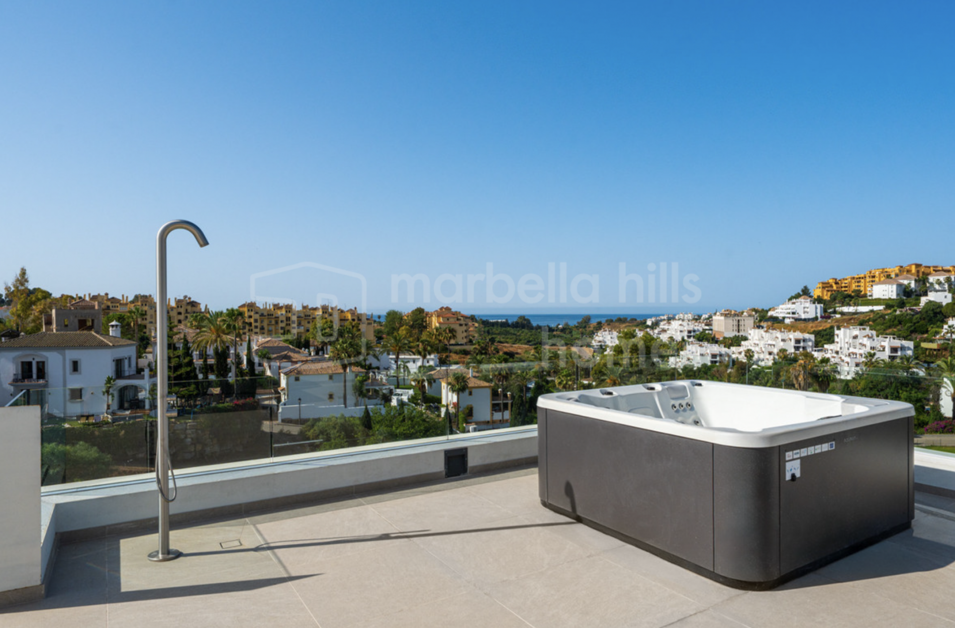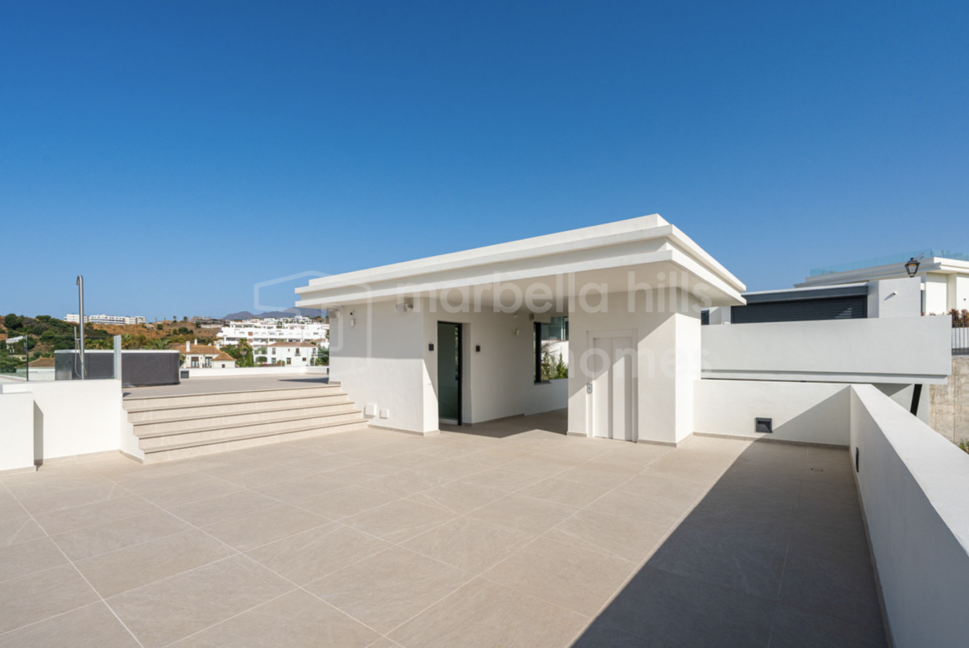 From the moment you arrive via the private driveway leading to the rooftop terrace, you’re met with uninterrupted views of the Mediterranean Sea and the lush La Resina Golf fairways. The rooftop also features a pre-installed Jacuzzi and built-in BBQ, making it the perfect setting for social gatherings or relaxed sunset moments.