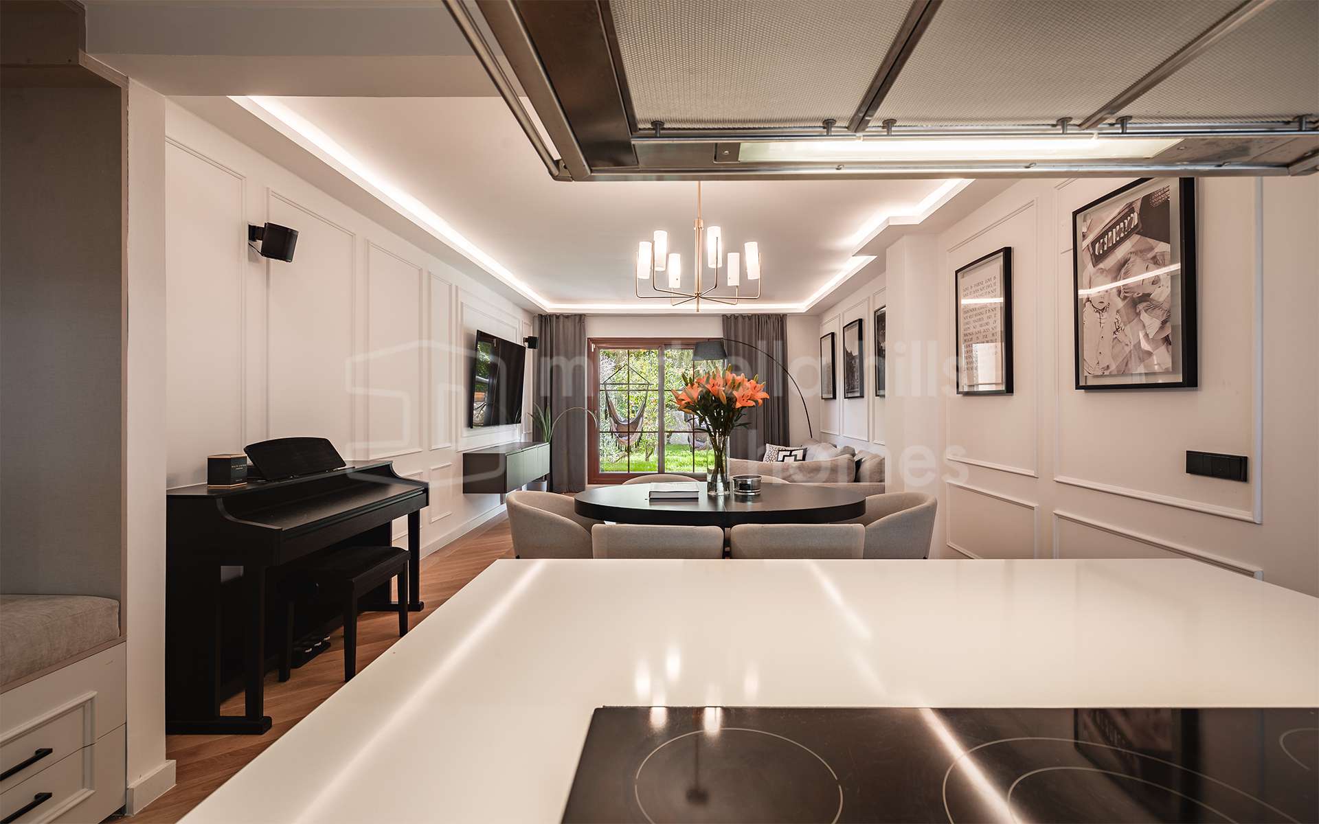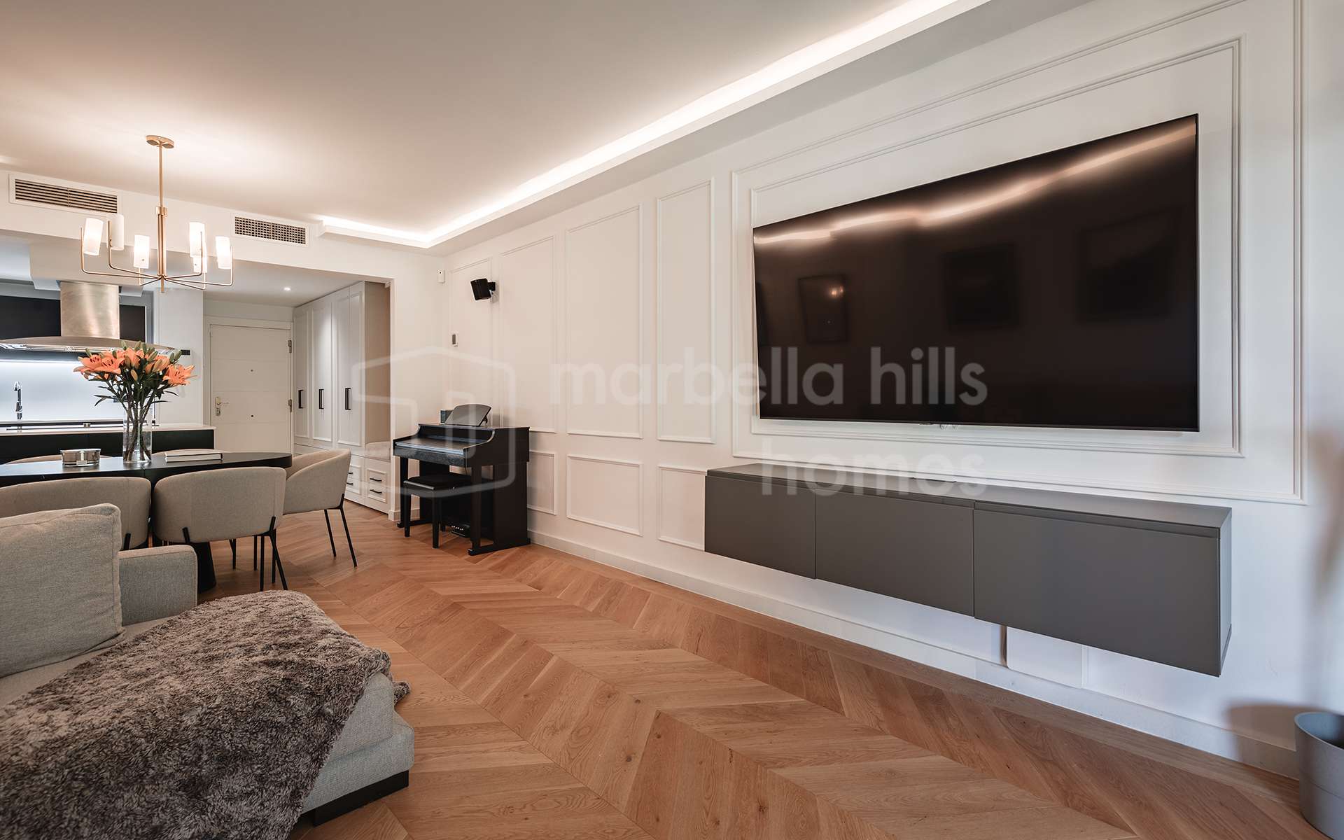 Premium features include herringbone oak flooring, underfloor heating in the bathrooms, integrated air conditioning (hot & cold), and a high-quality Sonos sound system in the living room. A private underground garage and storage room complete this turn-key offering.