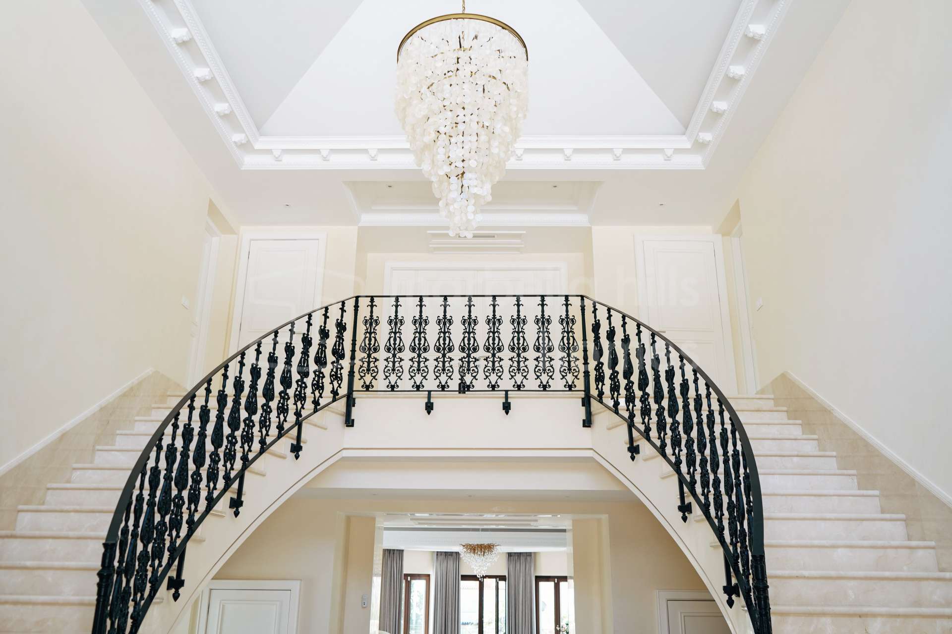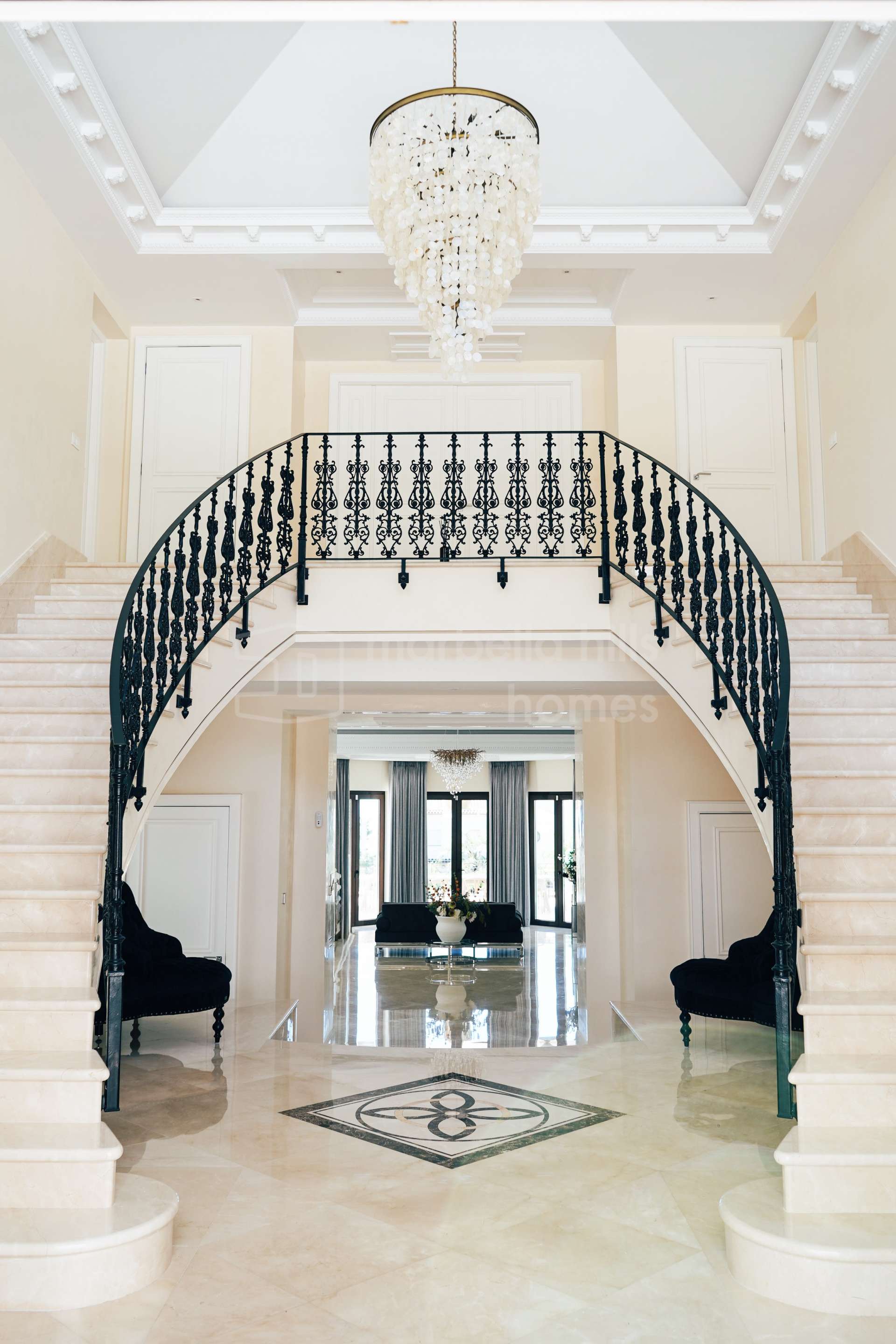 Set on a generous plot of 2,390 m², the villa offers 2,200 m² of built area and 374 m² of terraces across three levels. A grand entrance with a dramatic double staircase and high ceilings immediately sets an impressive tone.
