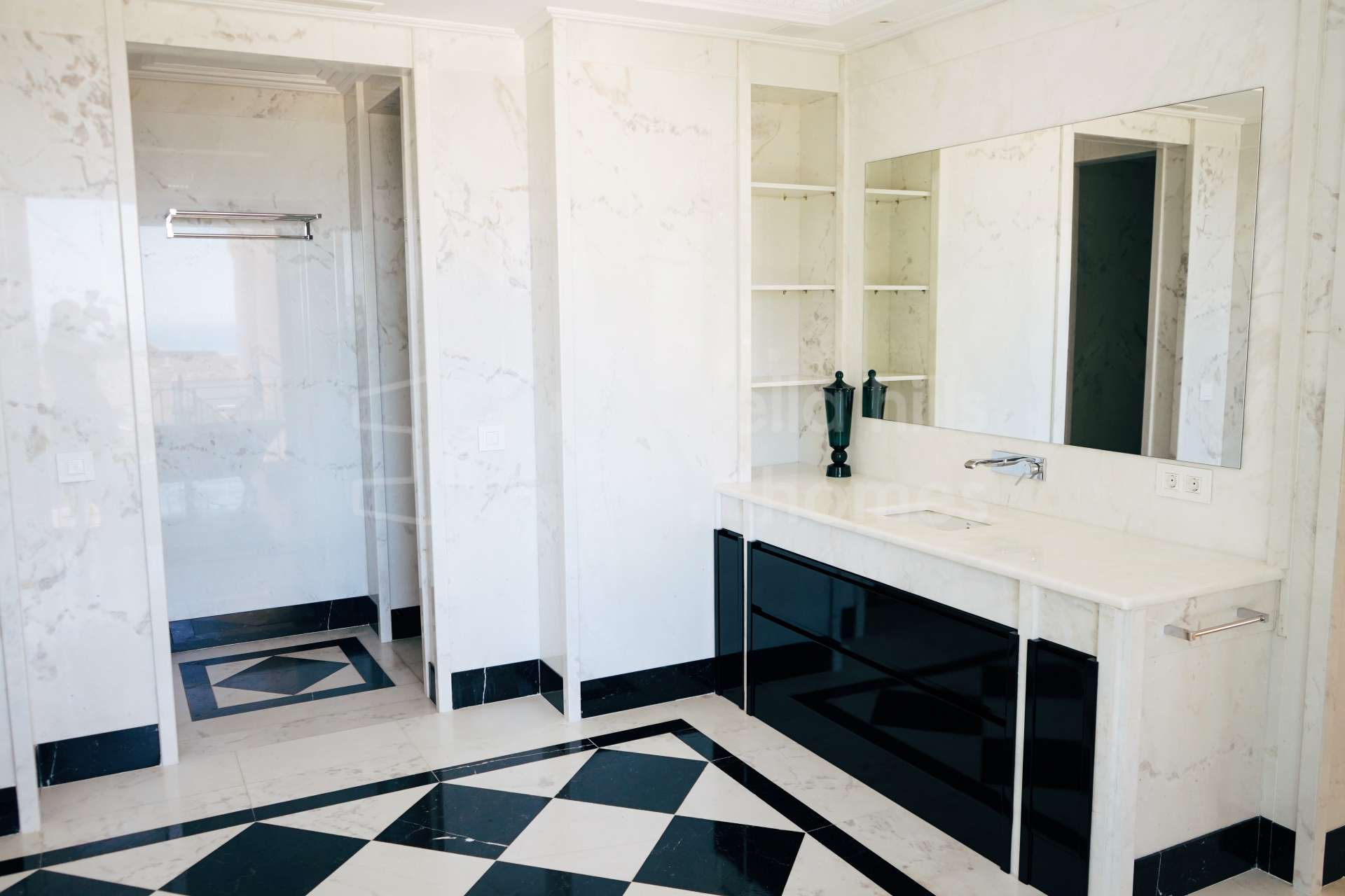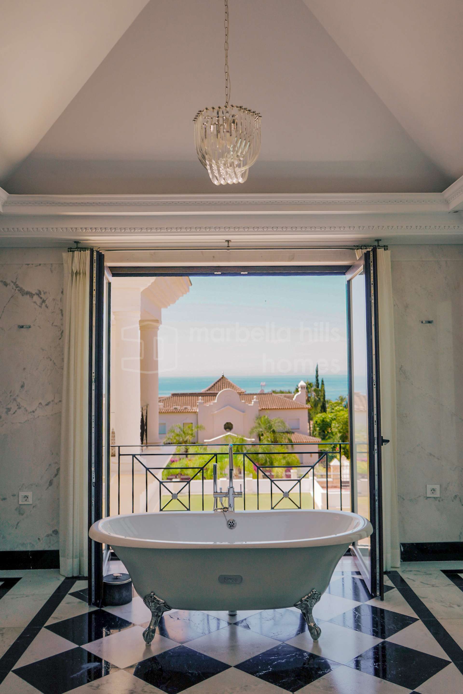 Upstairs, panoramic views stretch across the Mediterranean Sea, Gibraltar, and the African coastline. The luxurious master suite includes its own dressing room and private terrace, while three additional guest suites and a separate two-bedroom apartment offer exceptional accommodation for family or guests.