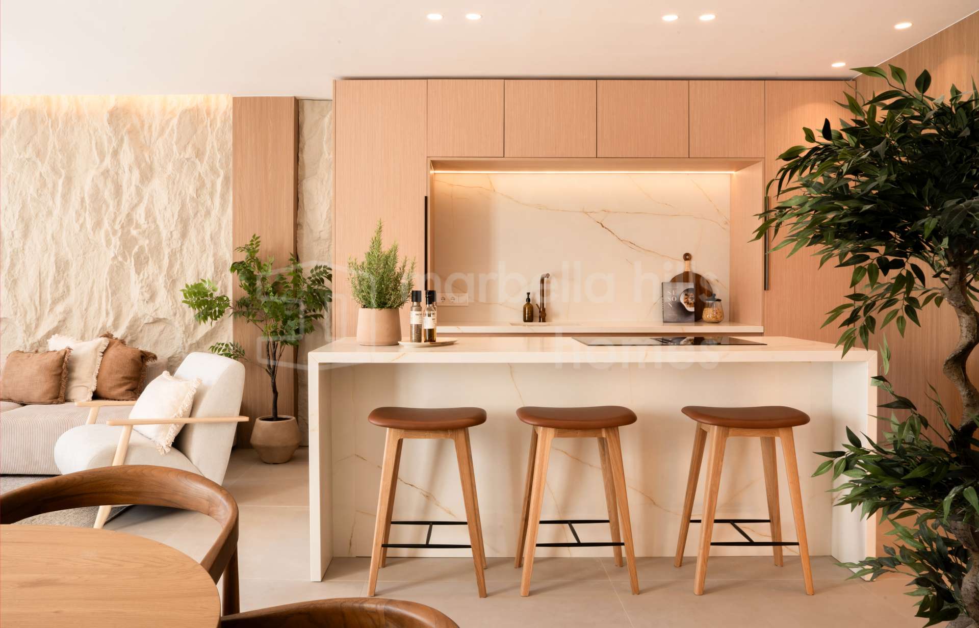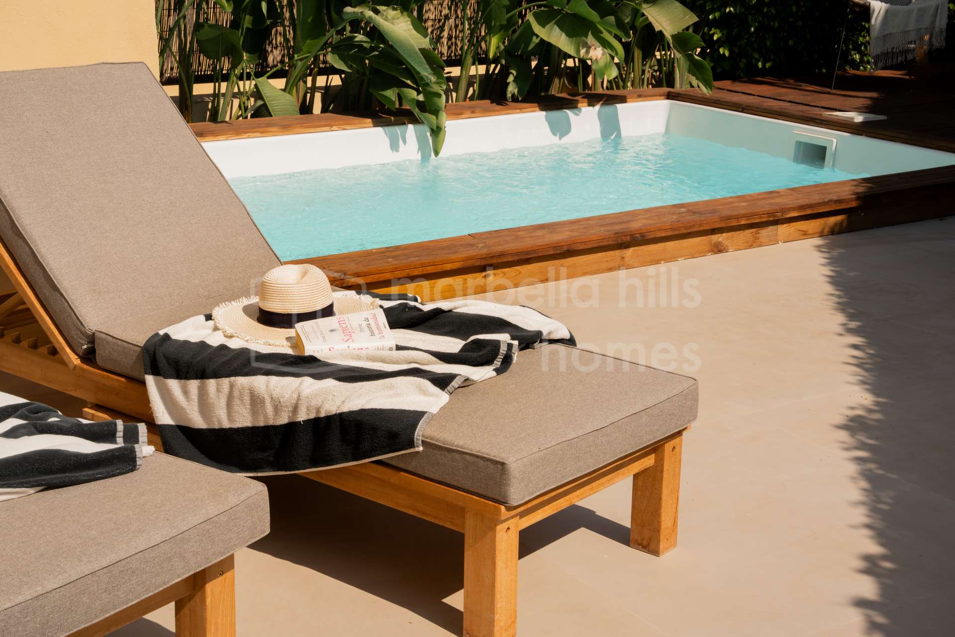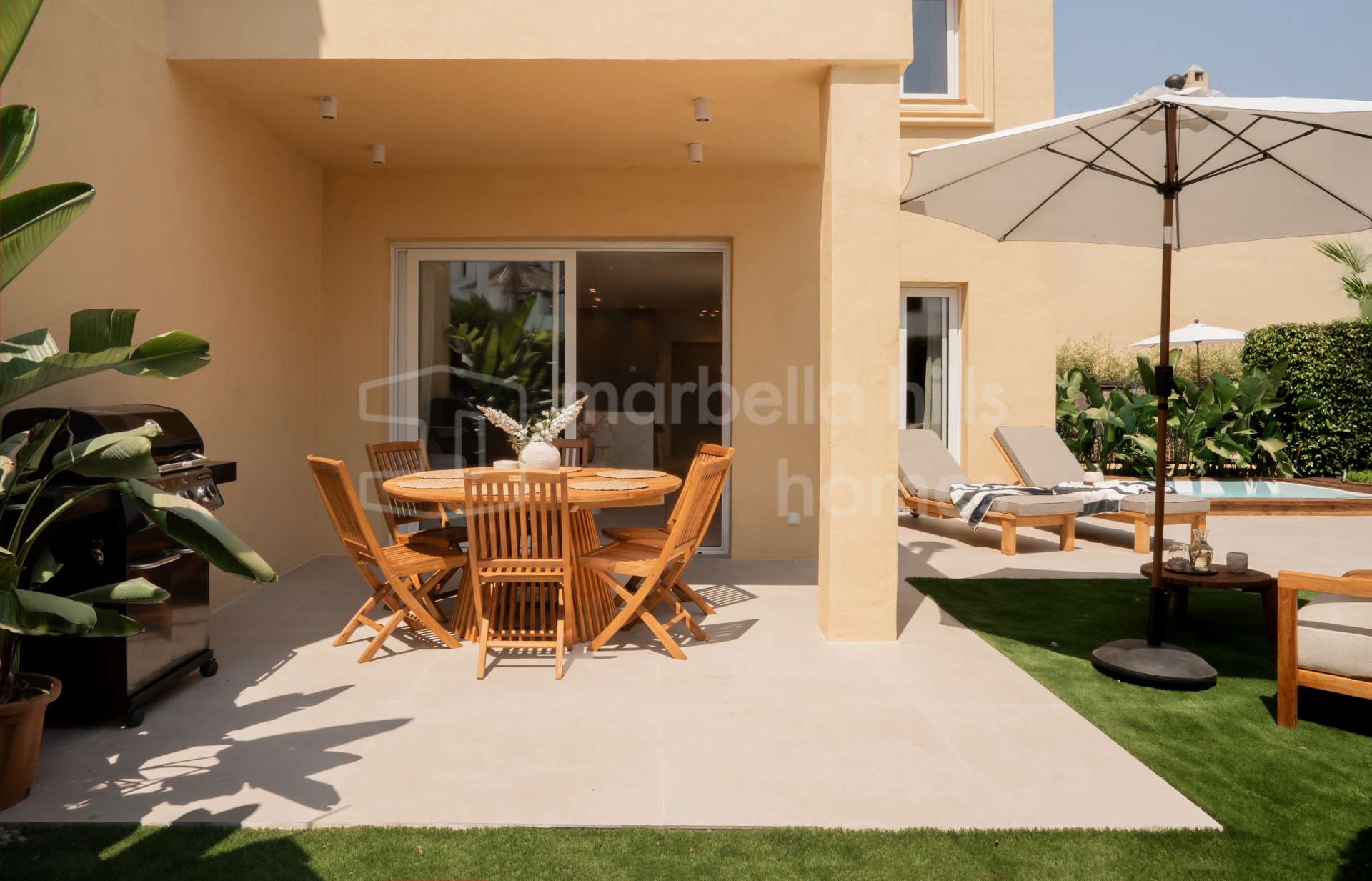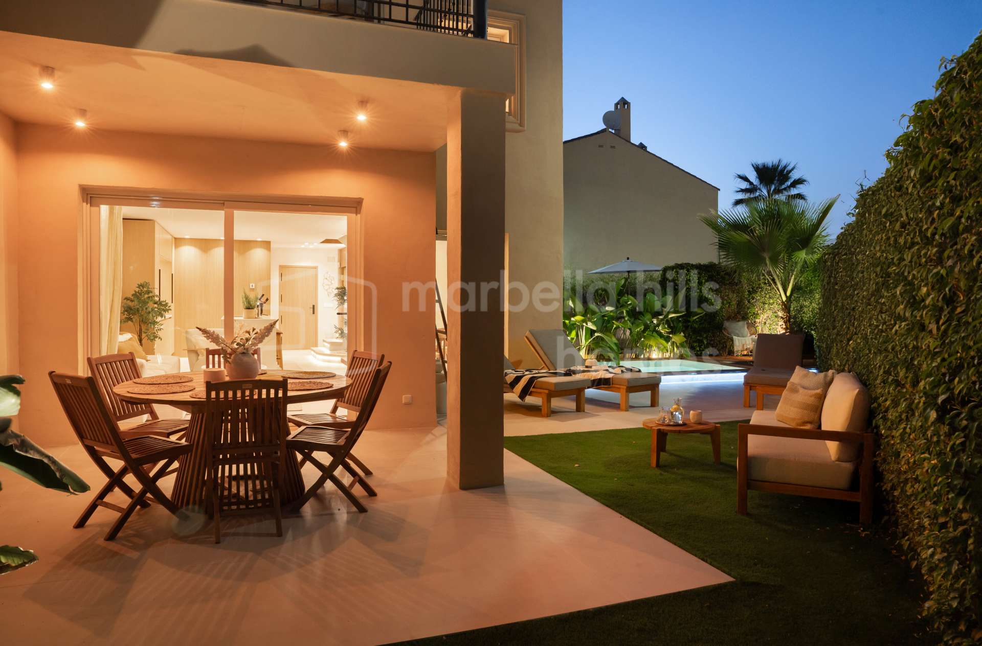 - Renovated townhouse for sale in Azalea Beach, Puerto Banús – Prime beachside location, only 200 metres from the sea – 4 bedrooms, 2 bathrooms + guest toilet – 159 m² built plus 101 m² of terraces and garden – Private pool, landscaped garden and BBQ area – Open-plan living with modern kitchen – Underfloor heating (bathrooms) and Airzone air conditioning – Fully furnished, underground parking, gated community – Walking distance to Puerto Banús, Marbella beaches and amenities