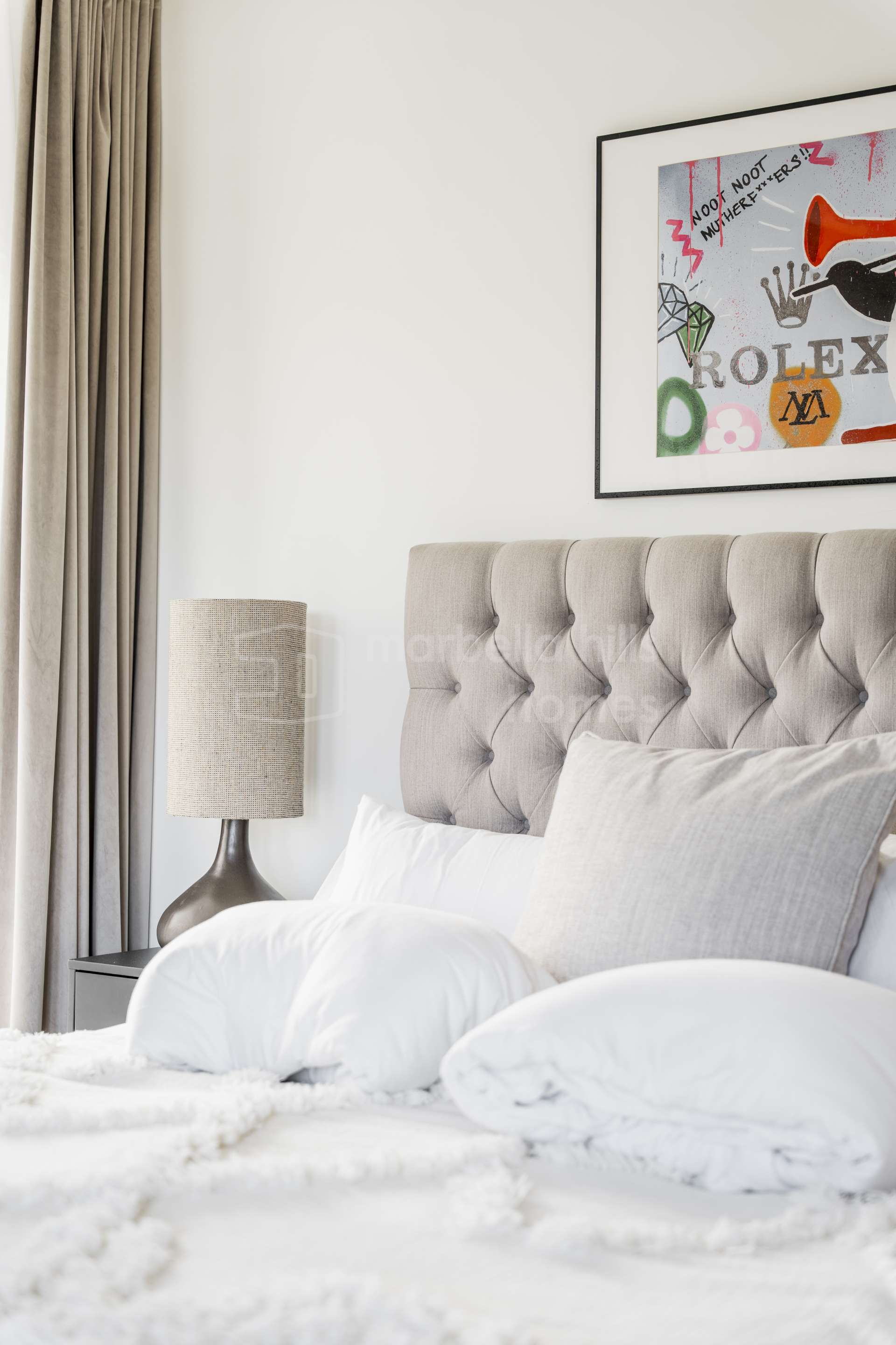 The open-plan living and dining area creates a bright and inviting social hub, seamlessly connected to the modern kitchen. Clean lines, neutral tones, and high-quality finishes provide a sophisticated yet warm atmosphere. Two bedrooms feature en-suite bathrooms, while a dedicated wardrobe room can easily be converted into an office or a fourth bedroom. Underfloor heating in the bathrooms and individual air-conditioning units in each bedroom ensure year-round comfort.