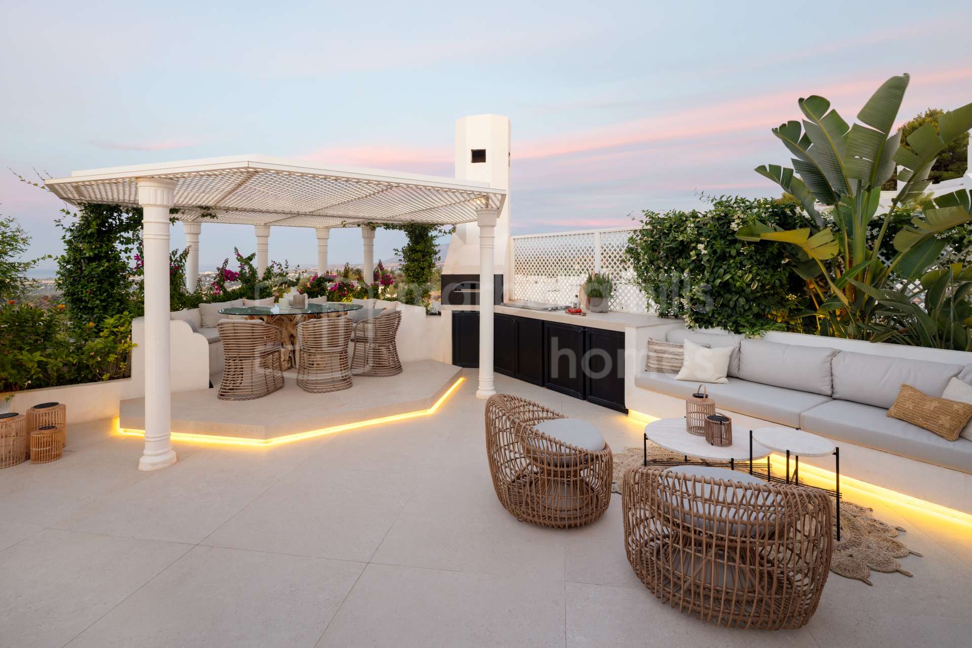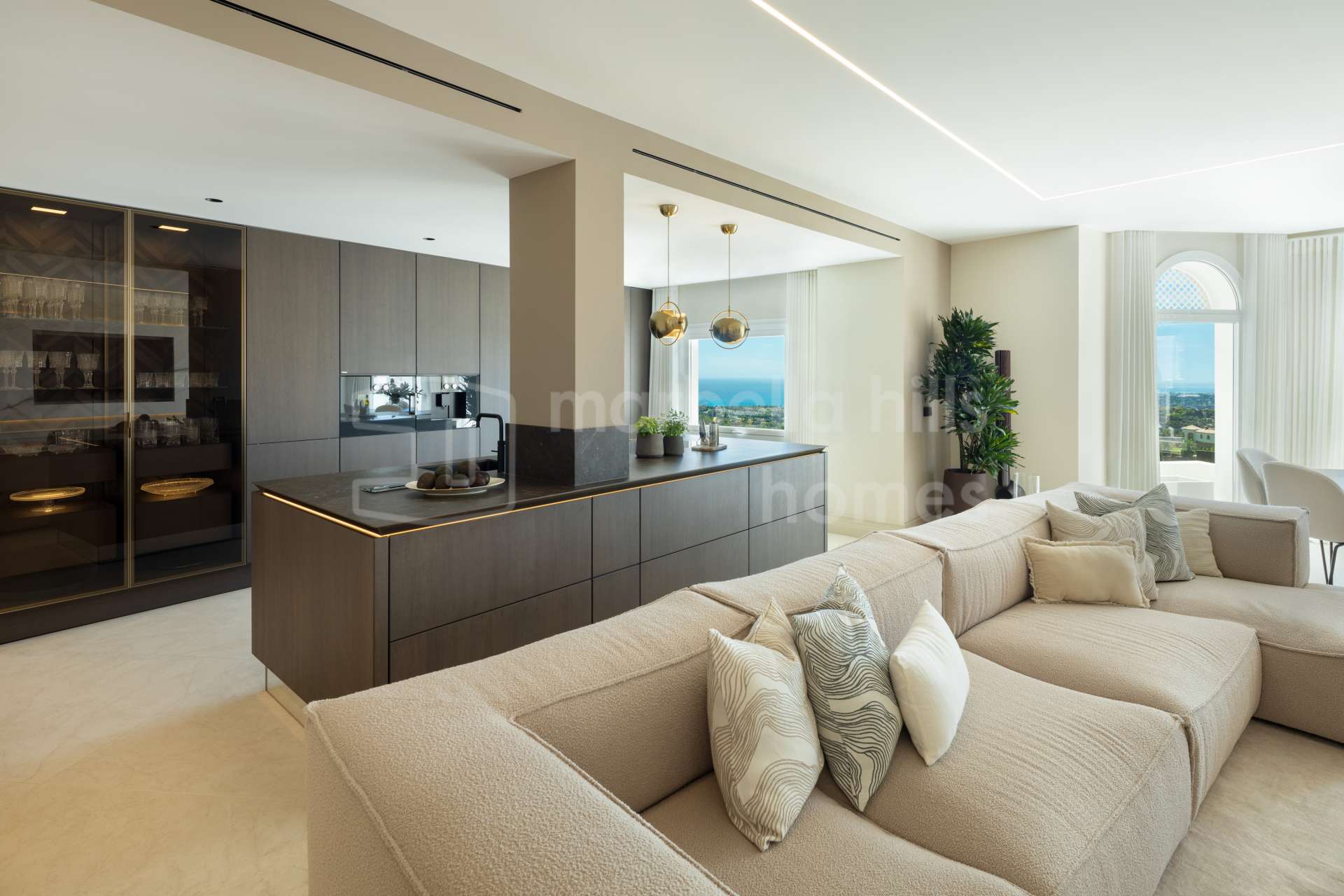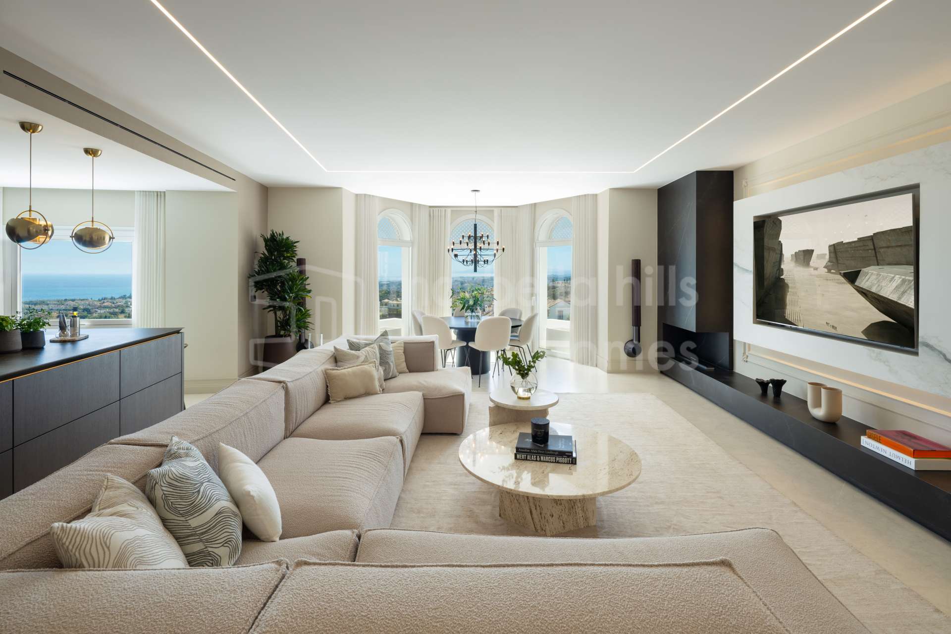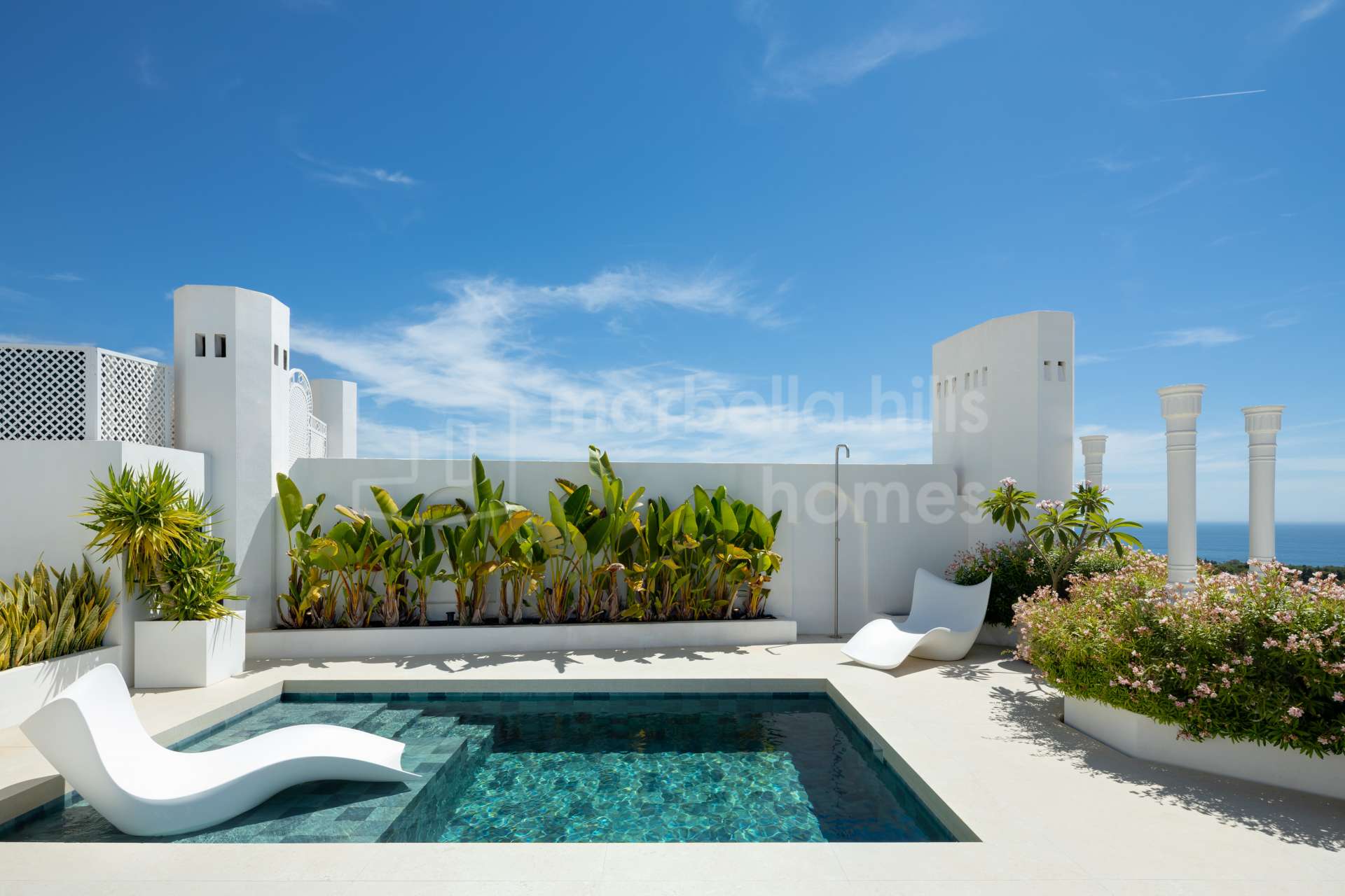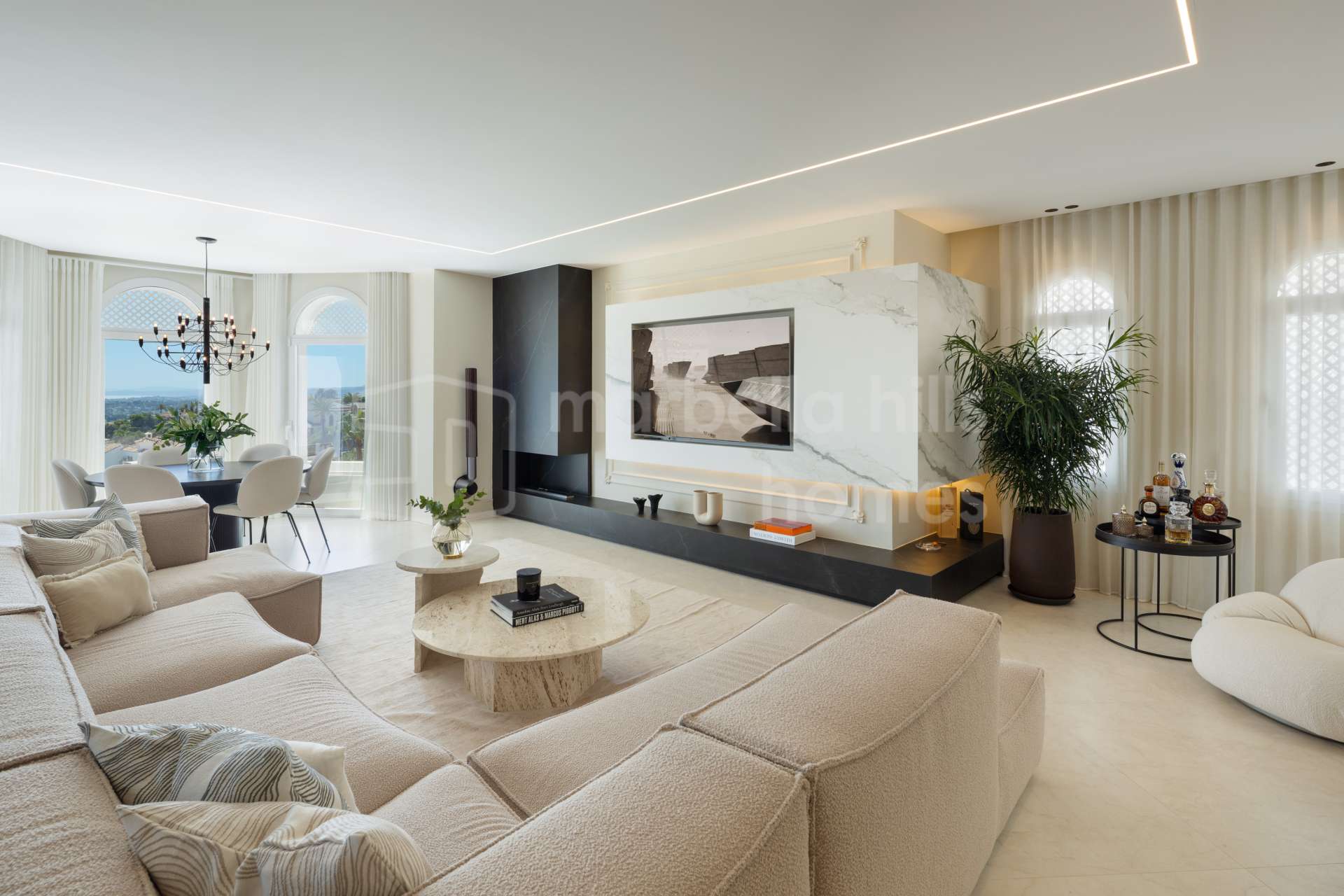 This luxury renovated penthouse for sale on the Marbella Golden Mile offers a rare opportunity to own a sophisticated Mediterranean residence in one of the most prestigious hillside locations above the coast. Positioned within the exclusive Marbella Hill Club area, the property enjoys panoramic sea views, privacy and a peaceful natural setting while remaining close to the Golden Mile’s finest amenities.