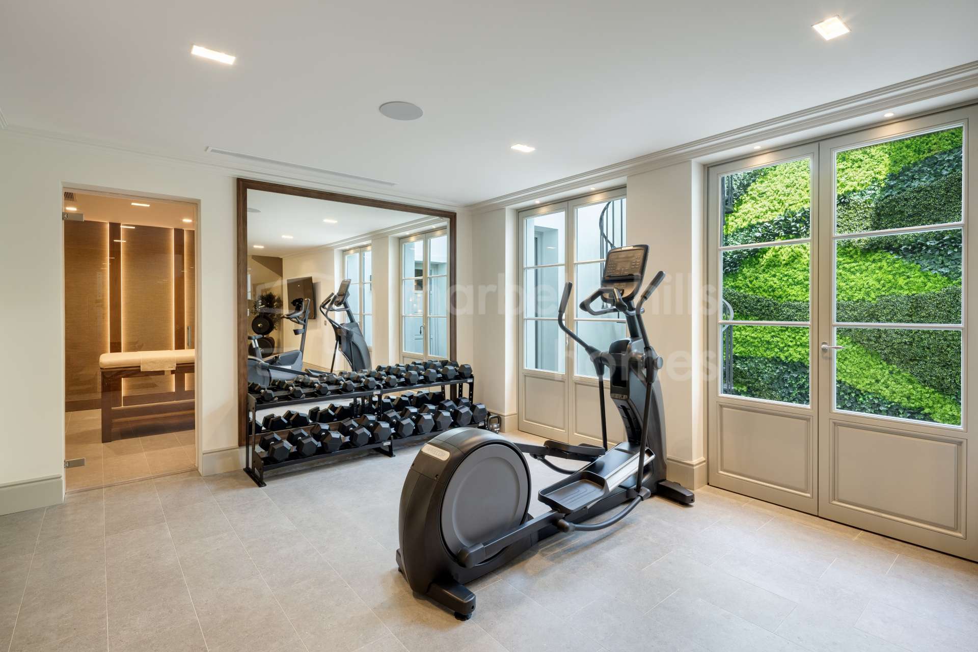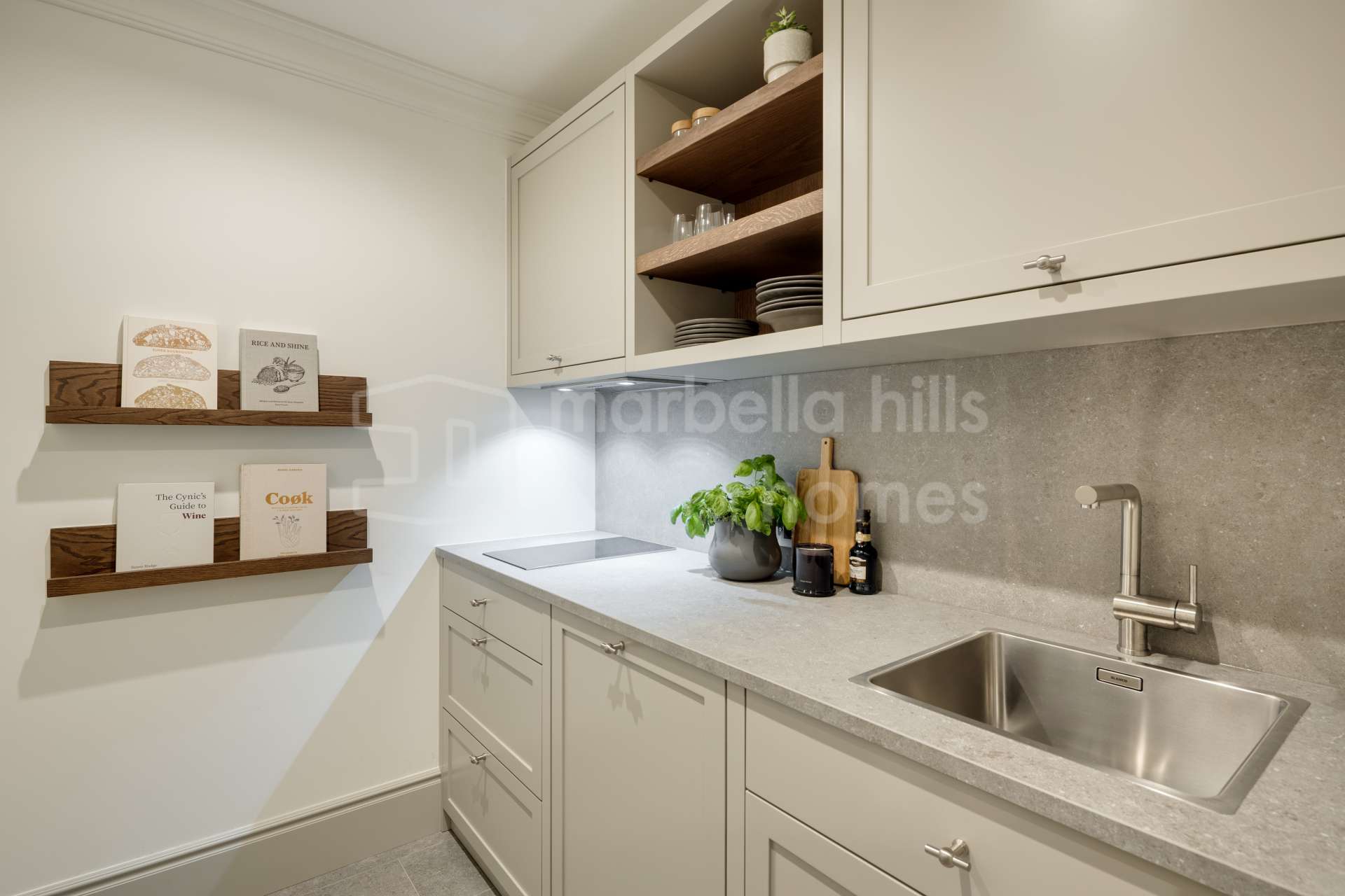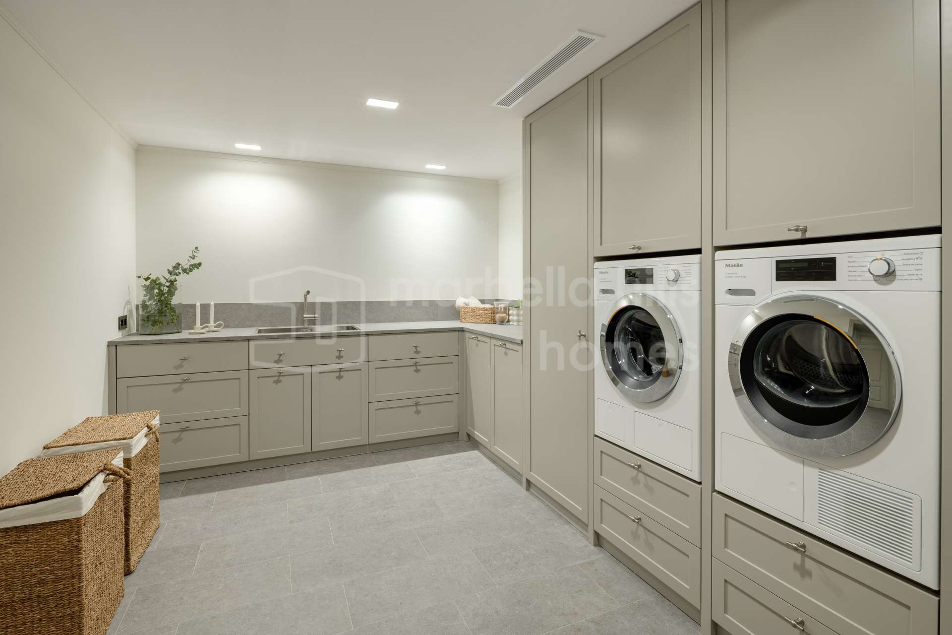 The lower level is dedicated to leisure and comfort, with a private cinema room, massage suite, fully equipped gym, temperature-controlled wine cellar, and service quarters with two en-suite bedrooms and kitchenette. Every detail has been carefully considered, from the Zennio smart home system to an external machinery room that ensures efficient operation without disturbance.