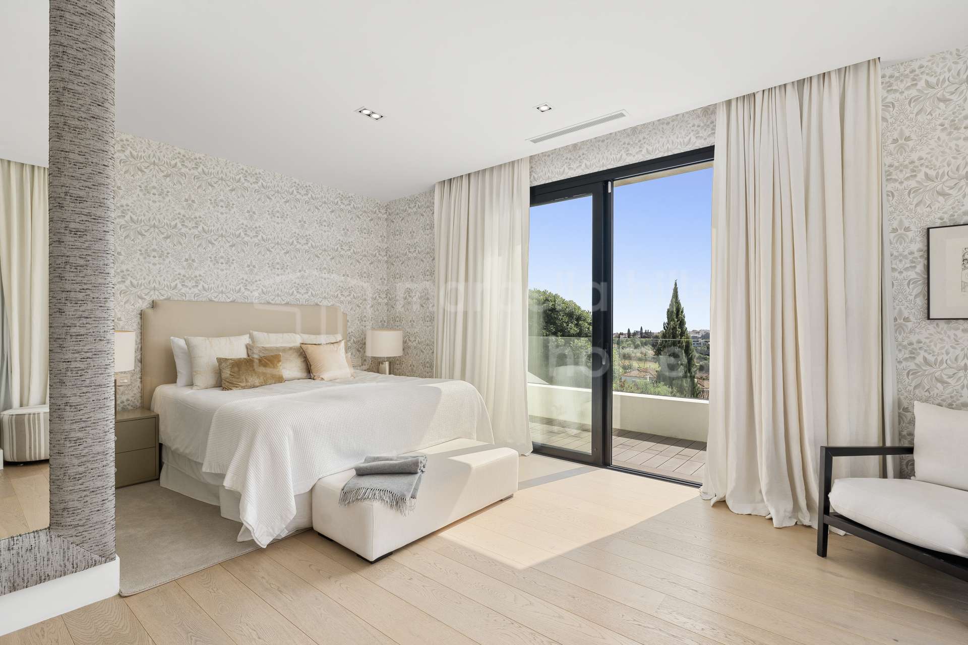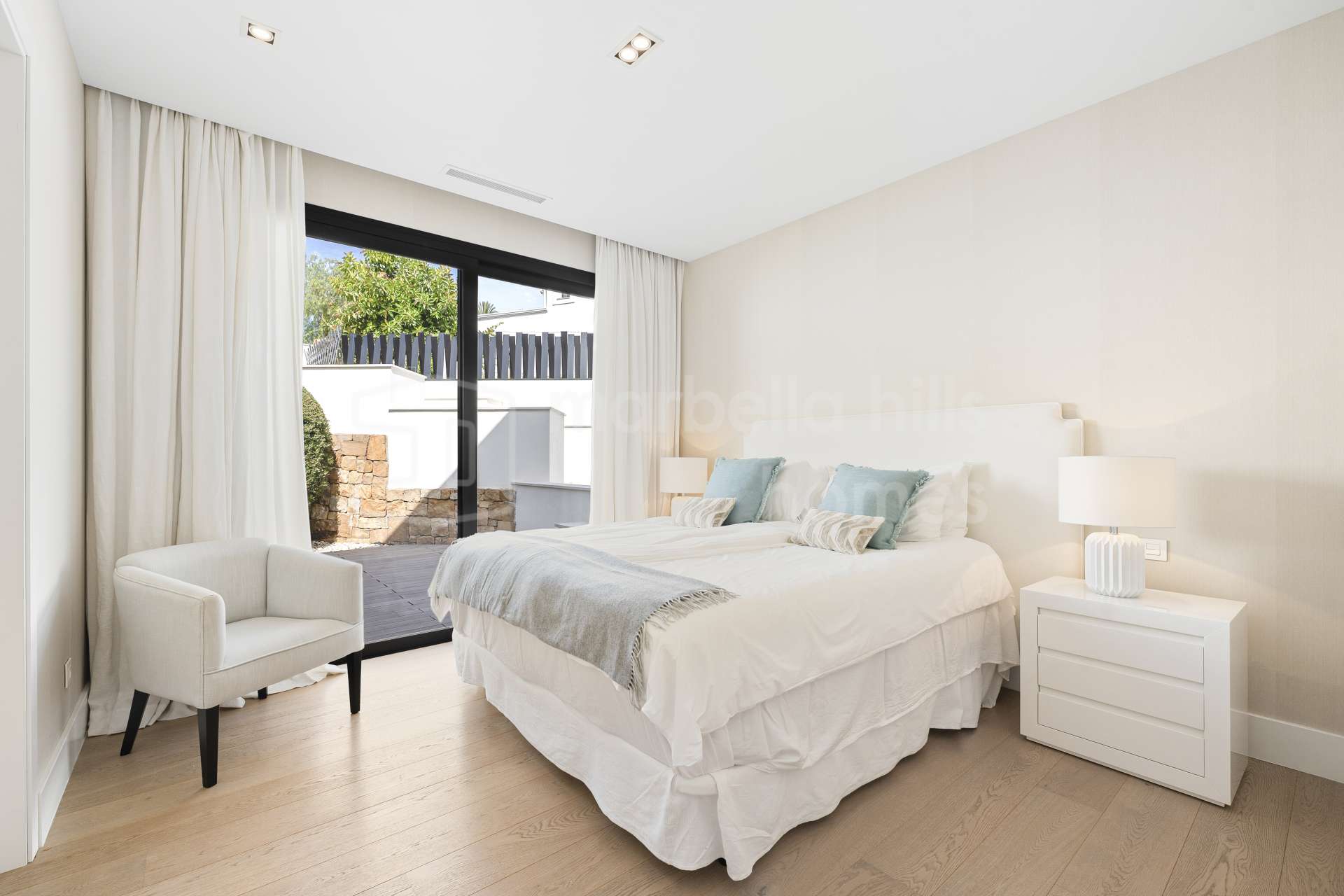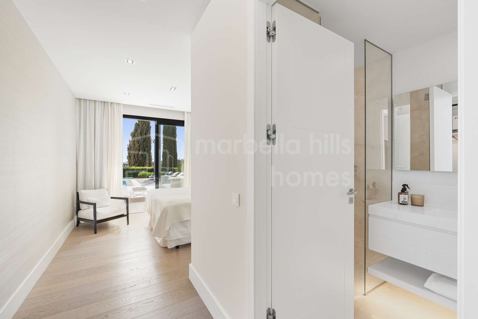 The upper floor is reserved entirely for the master suite. This peaceful retreat features a modern en-suite bathroom and a wrap-around terrace with panoramic views of the surrounding golf valley and mountains — the perfect spot to enjoy Marbella’s sunrises and sunsets year-round.