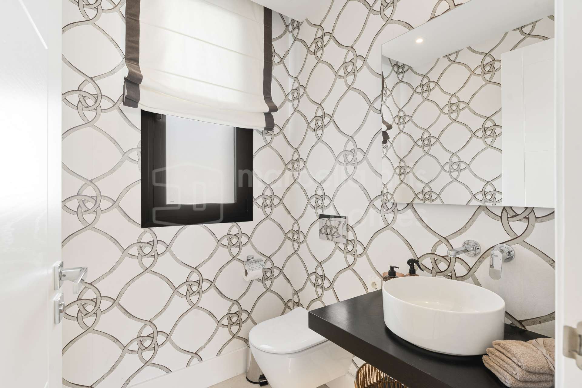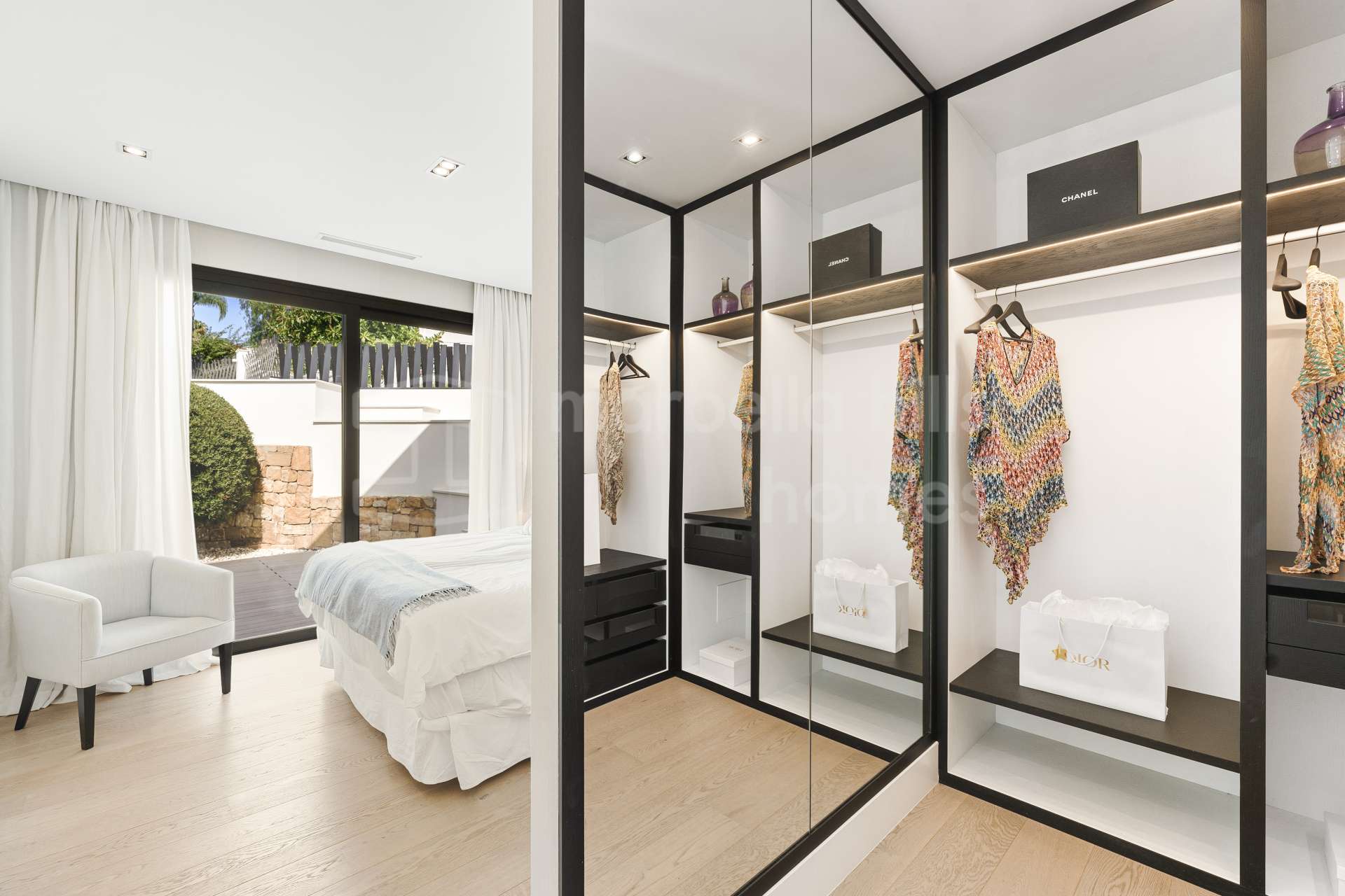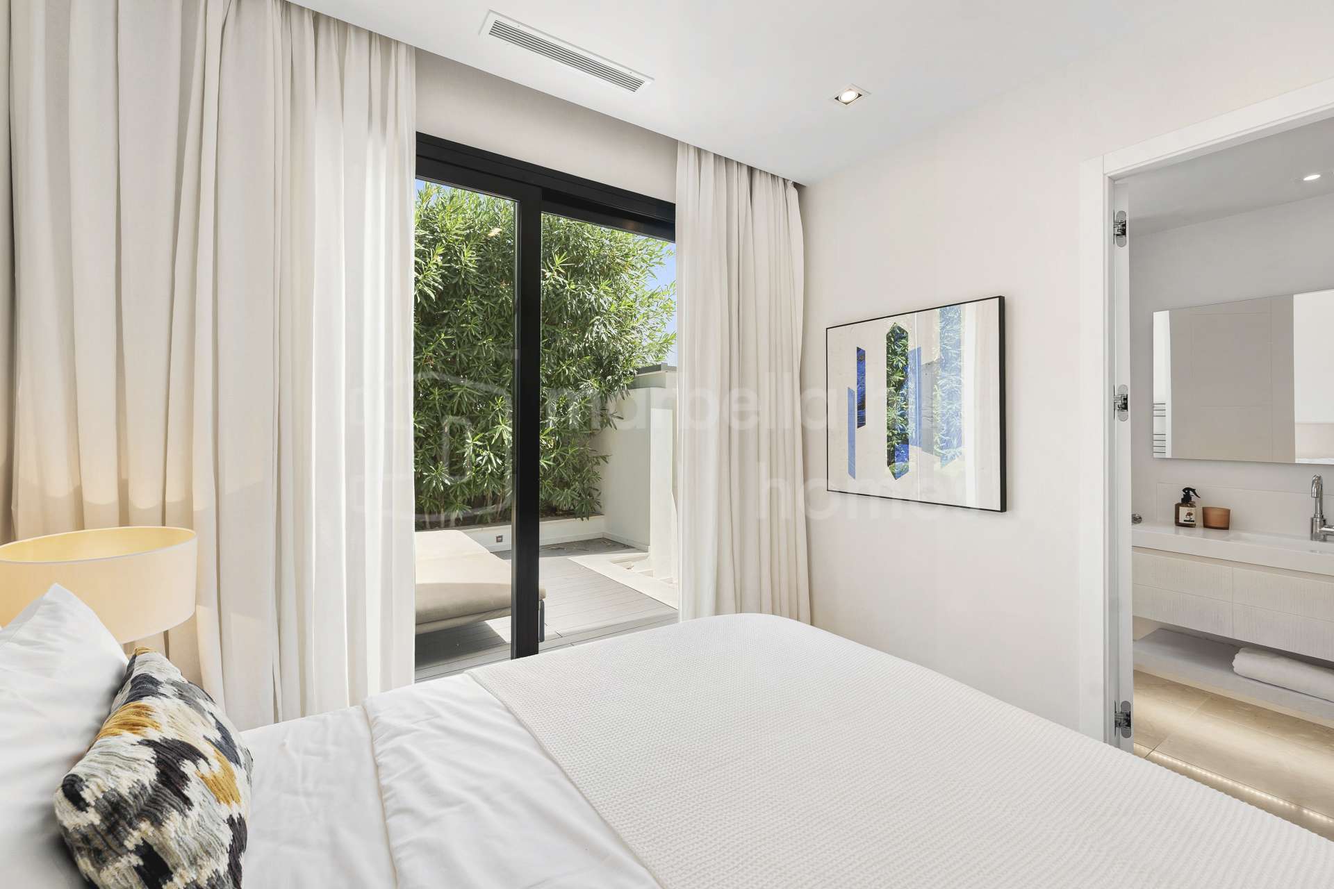 The upper floor is reserved entirely for the master suite. This peaceful retreat features a modern en-suite bathroom and a wrap-around terrace with panoramic views of the surrounding golf valley and mountains — the perfect spot to enjoy Marbella’s sunrises and sunsets year-round.