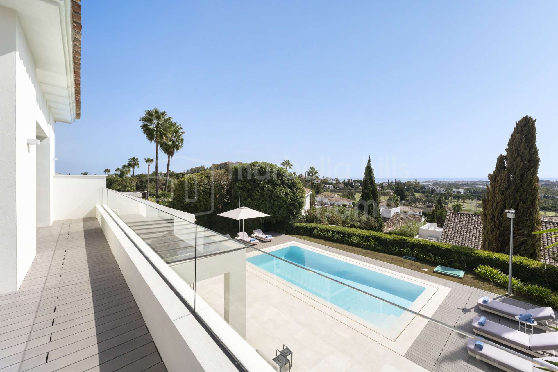 Modern luxury villa in Nueva Andalucía with 5 bedrooms, panoramic La Concha views, infinity pool, rooftop jacuzzi, elegant interiors and expansive terraces. Prime location near...